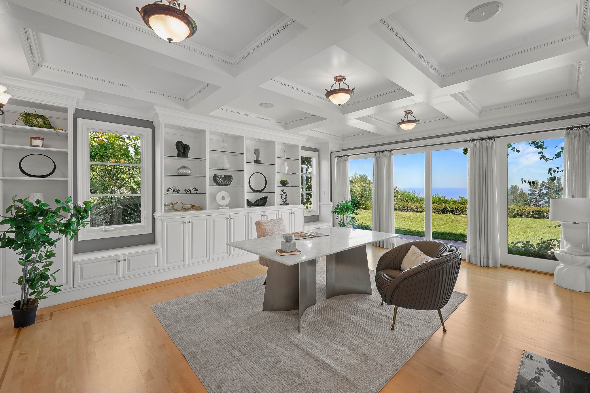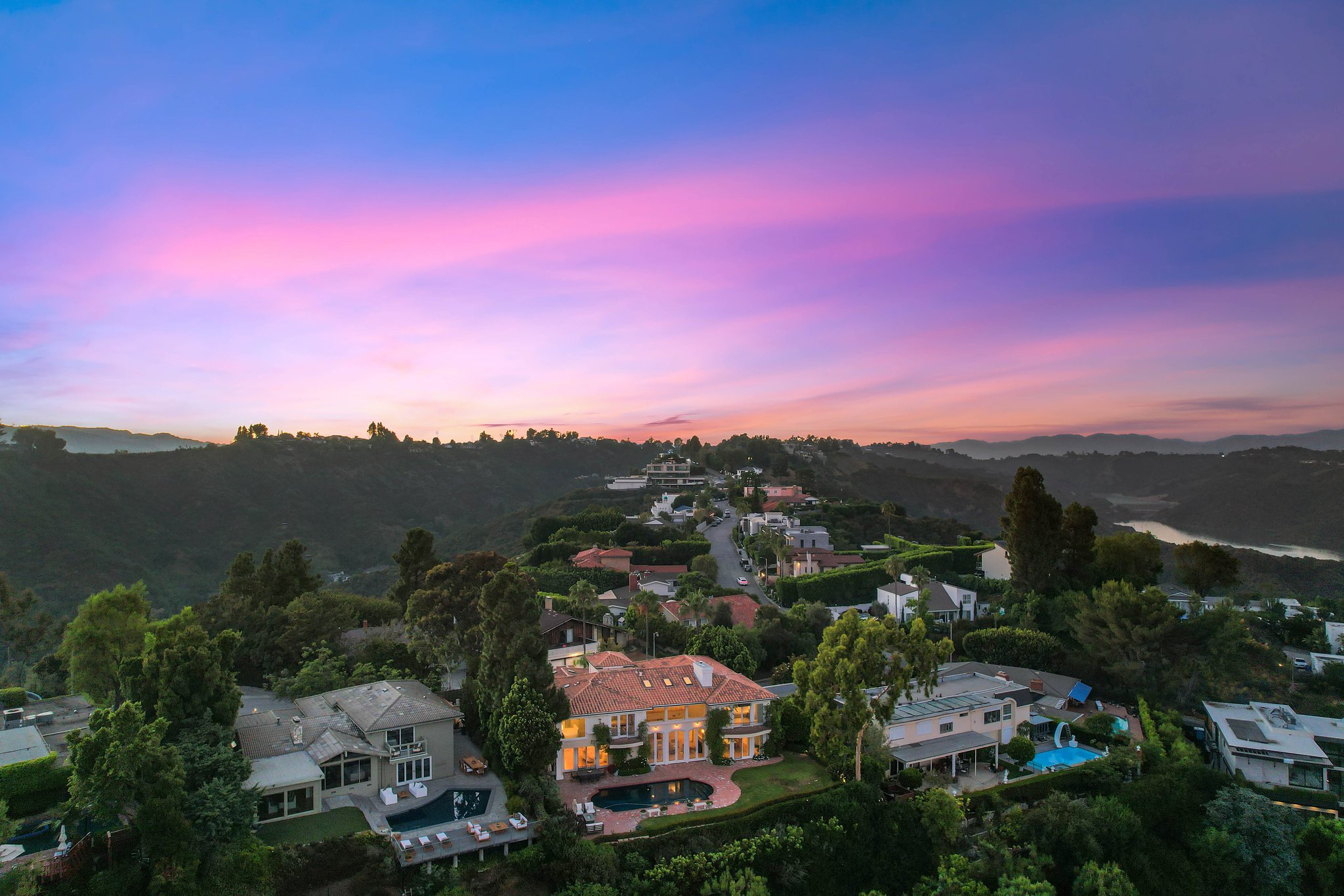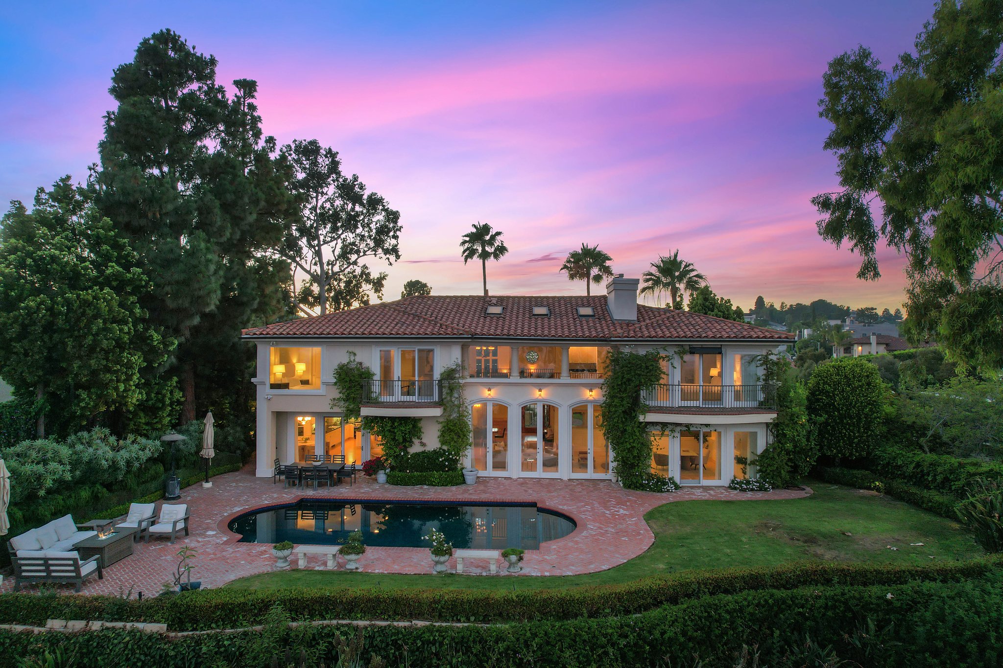 Introducing "Villa Savona," a beautifully furnished lease designed by award-winning architect Blake Stephens AIA, nestled on a quiet Bel Air street. This Italian villa offers breathtaking 270-degree views of DTLA, the San Gabriel Mountains, Century City, and Rancho Palos Verdes. Inside, the formal living room features a stunning two-story coffered ceiling, recessed skylights, and tall arched windows that fill the space with natural light. Elegant walnut accents complement the maple hardwood floors throughout. The living room seamlessly connects to a sophisticated library with custom cabinetry and a dual-use fireplace. The spacious family room and breakfast nook lead to a gourmet kitchen equipped with top-tier appliances, two walk-in pantries, and a large Sub-Zero fridge. The first floor also includes two generous en-suite bedrooms with a luxurious walk-in closet. Upstairs, a loggia loft separates the primary suite from three additional en-suite bedrooms, all designed with attention to detail, including a sound-dampening subfloor. The primary suite boasts floor-to-ceiling slider doors that open to a balcony with stunning views, a lavish bathroom with a built-in tub and shower, and an expansive walk-in closet. The exterior features a large grassy yard and pool, perfect for enjoying the panoramic views. Villa Savona exemplifies exceptional design and craftsmanship, capturing the essence of elegant Bel Air living.