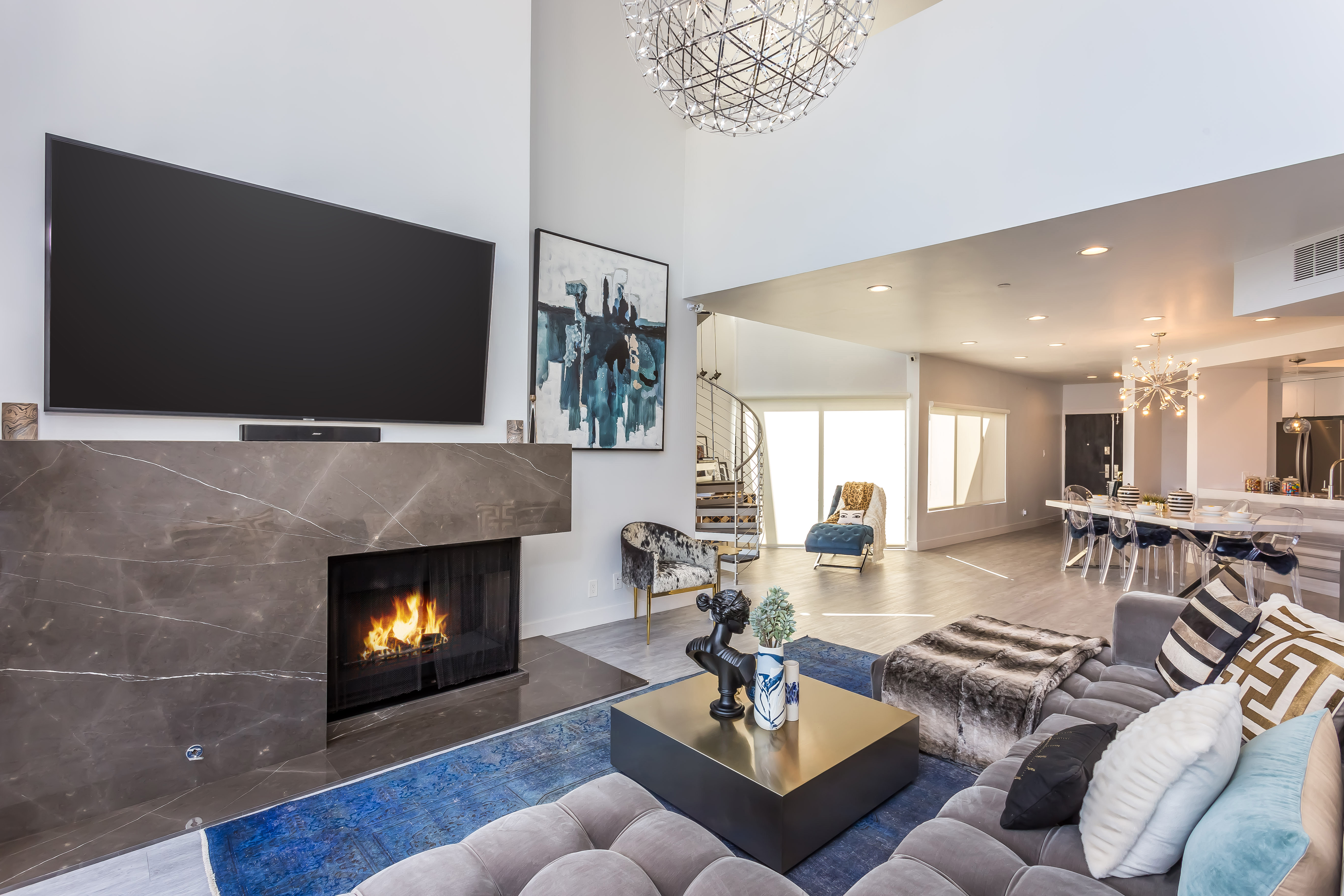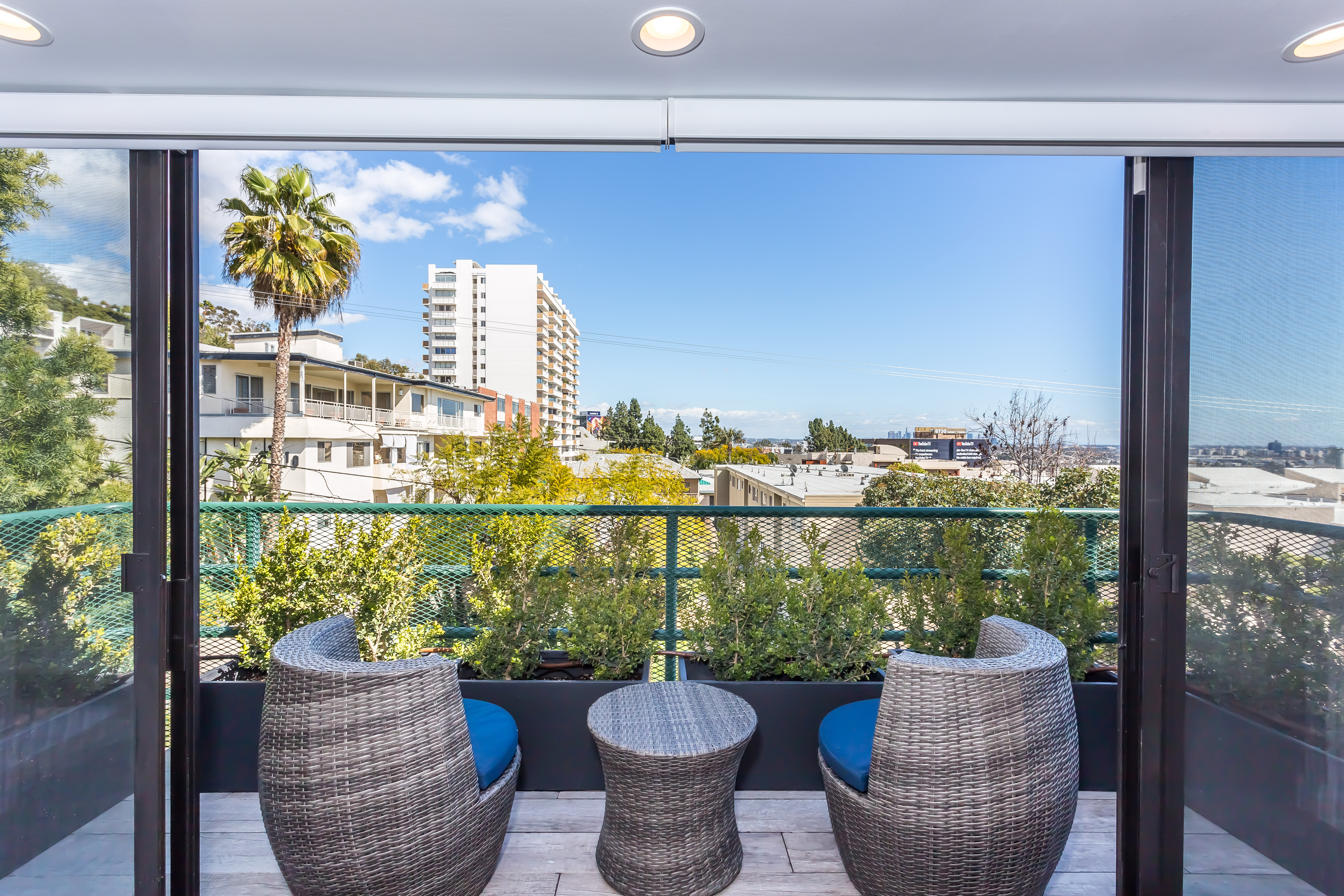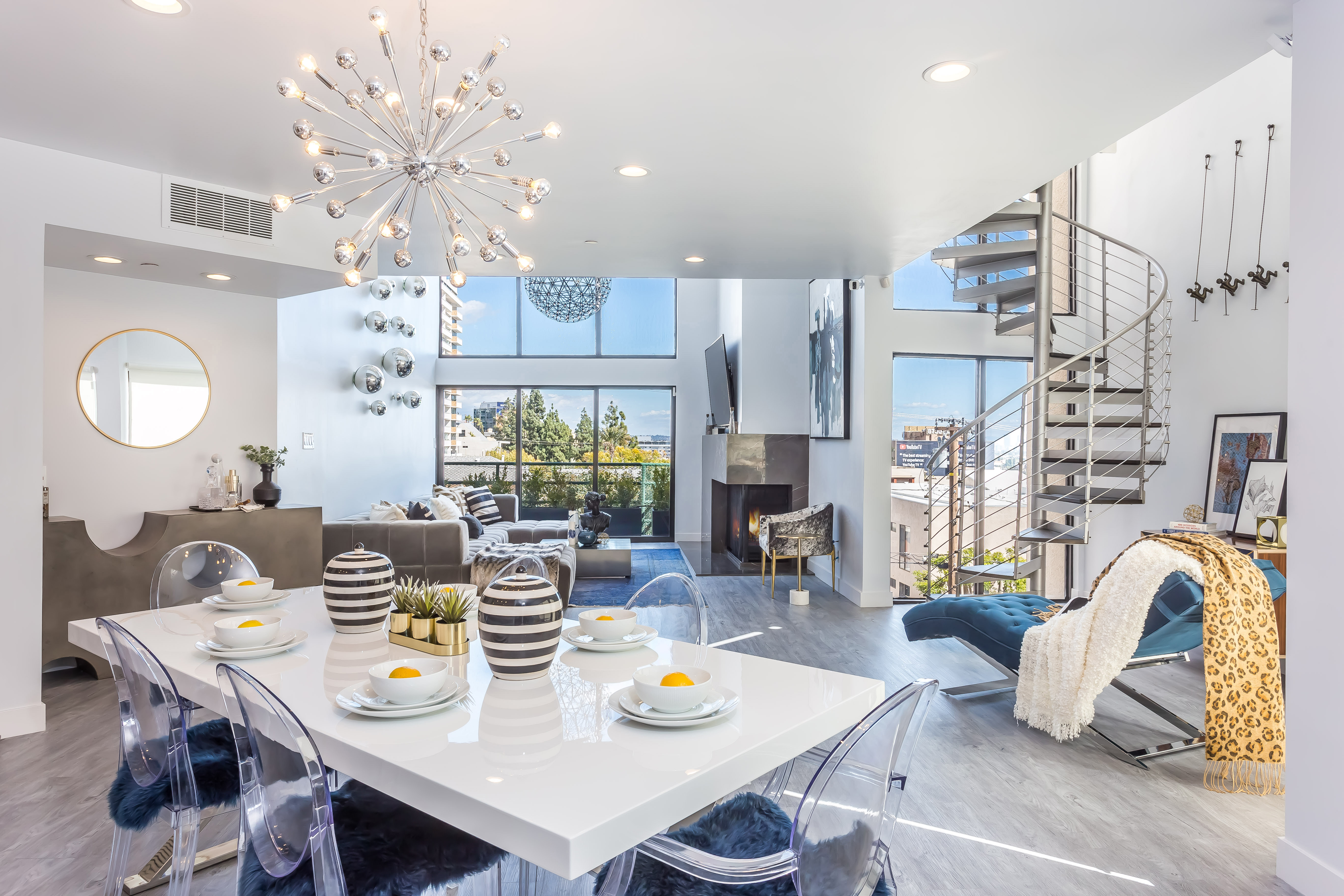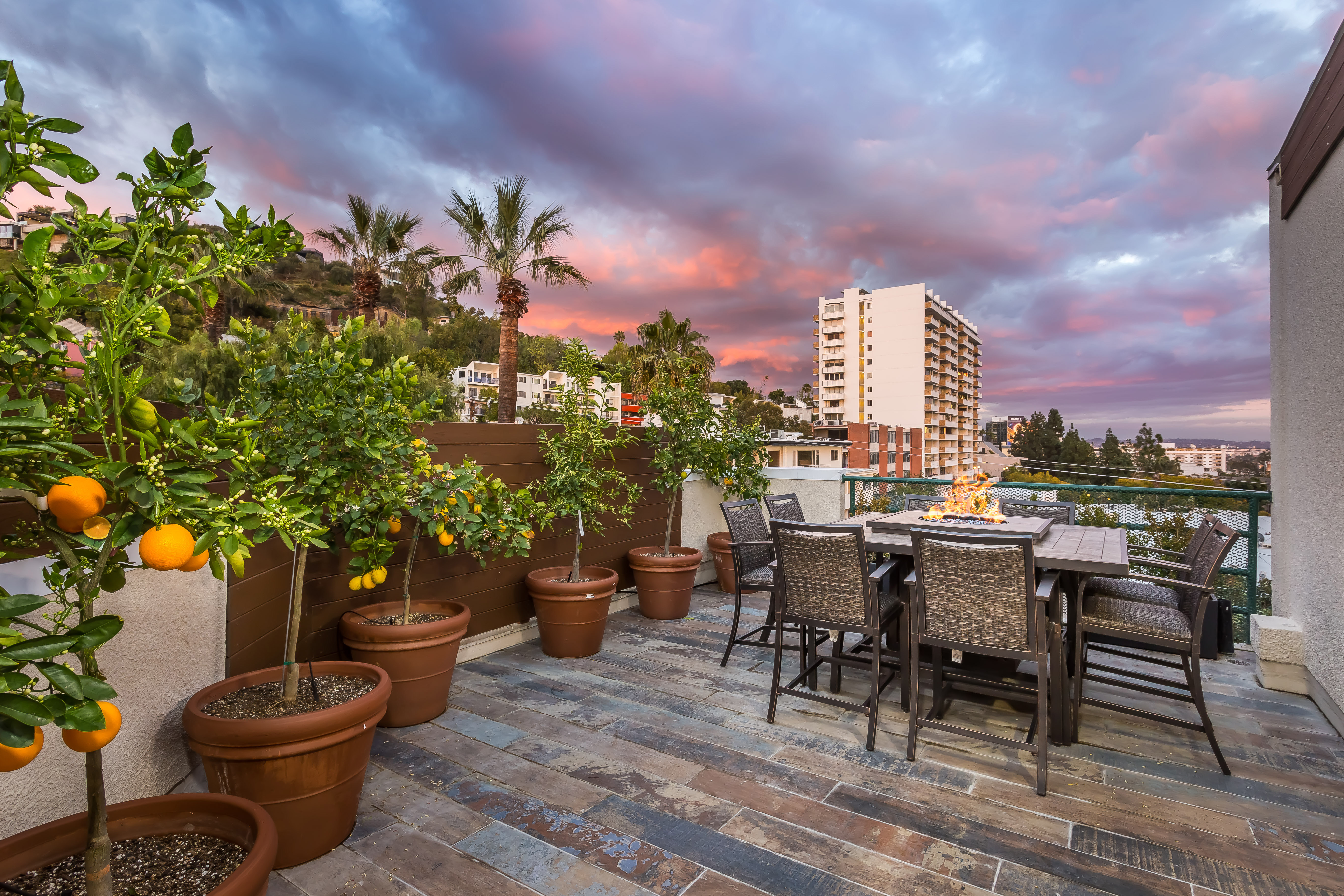 Perched above the famed Sunset Strip, this newly-remodeled designer penthouse boasts views of Downtown Los Angeles and 18' soaring ceilings. An oversized view terrace allows for plenty of outdoor living space, and flowing balconies from the main level bedrooms create spacious indoor/outdoor flow. A spacious owner's suite offers a custom walk-in closet and spa bathroom. High-end stainless steel appliances anchor the chef's kitchen, custom motorized shades, alarm system with security cameras and digital access to the front door all complete the thoughtful craftsmanship and detail. In-unit side by side washer/dryer, as well as side by side dedicated parking.