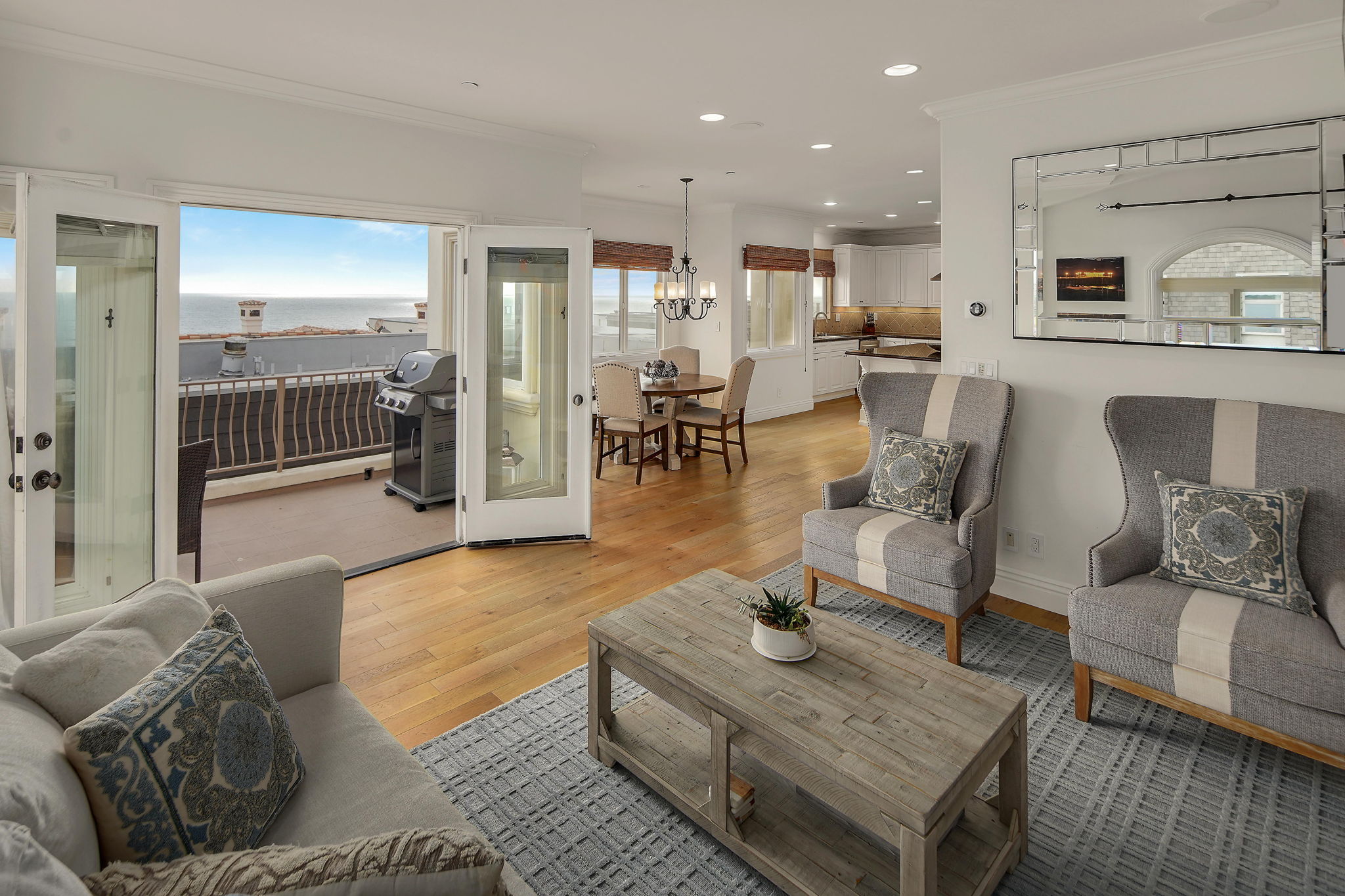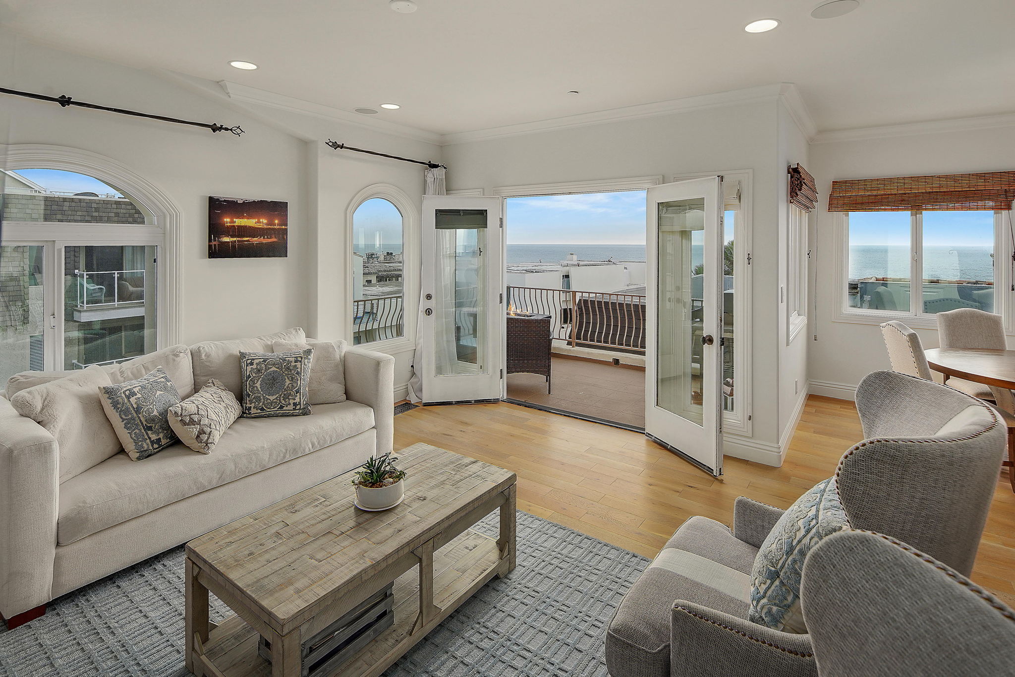 This gorgeous 3-story custom townhome features panoramic ocean and coastline views from both the middle and top floors with only one property separating this home from homes on The Strand, you can reach the sands of Manhattan Beach in a matter of steps. Closely situated to the pier and Downtown Manhattan Beach yet secluded and serene, this home is the perfect beach retreat. Enter through the formal foyer and head up the spiral staircase to the bright and spacious open floor plan with expansive South-Western views creating the perfect backdrop for the kitchen, dining, and living areas. Granite countertops and built-in wine bar complete the sleek chef's kitchen, and a cozy fireplace is the highlight of the living room. All bathrooms feature beautiful marble, mosaics, and travertine floors, and the primary suite has a separate spa-like soaking tub and a large private south facing deck ideal for California indoor/outdoor living. Two additional guest bedrooms complete the home. Attached 2-car garage and an additional carport spot for guests. Buyer is advised to independently verify square footage.