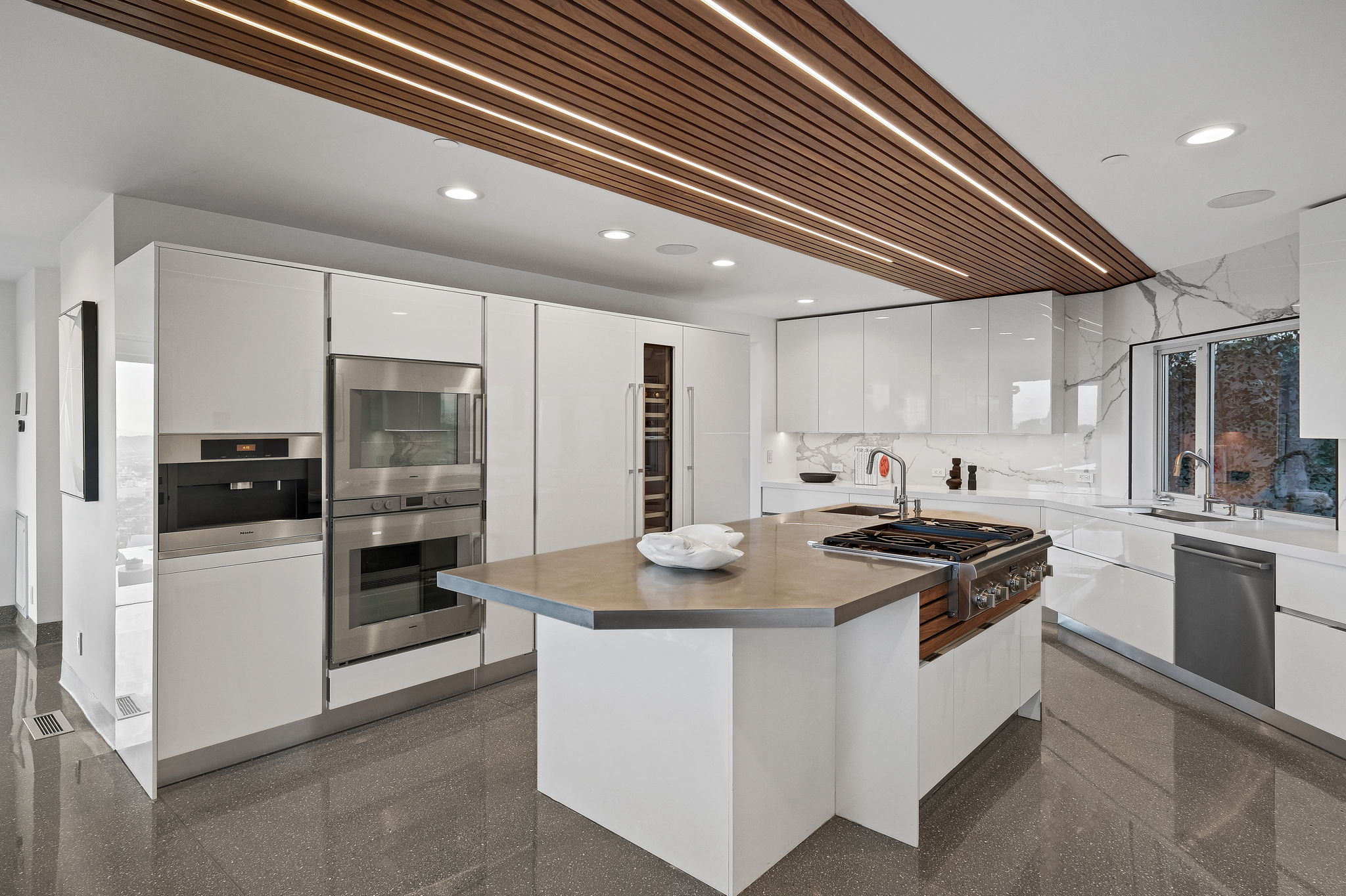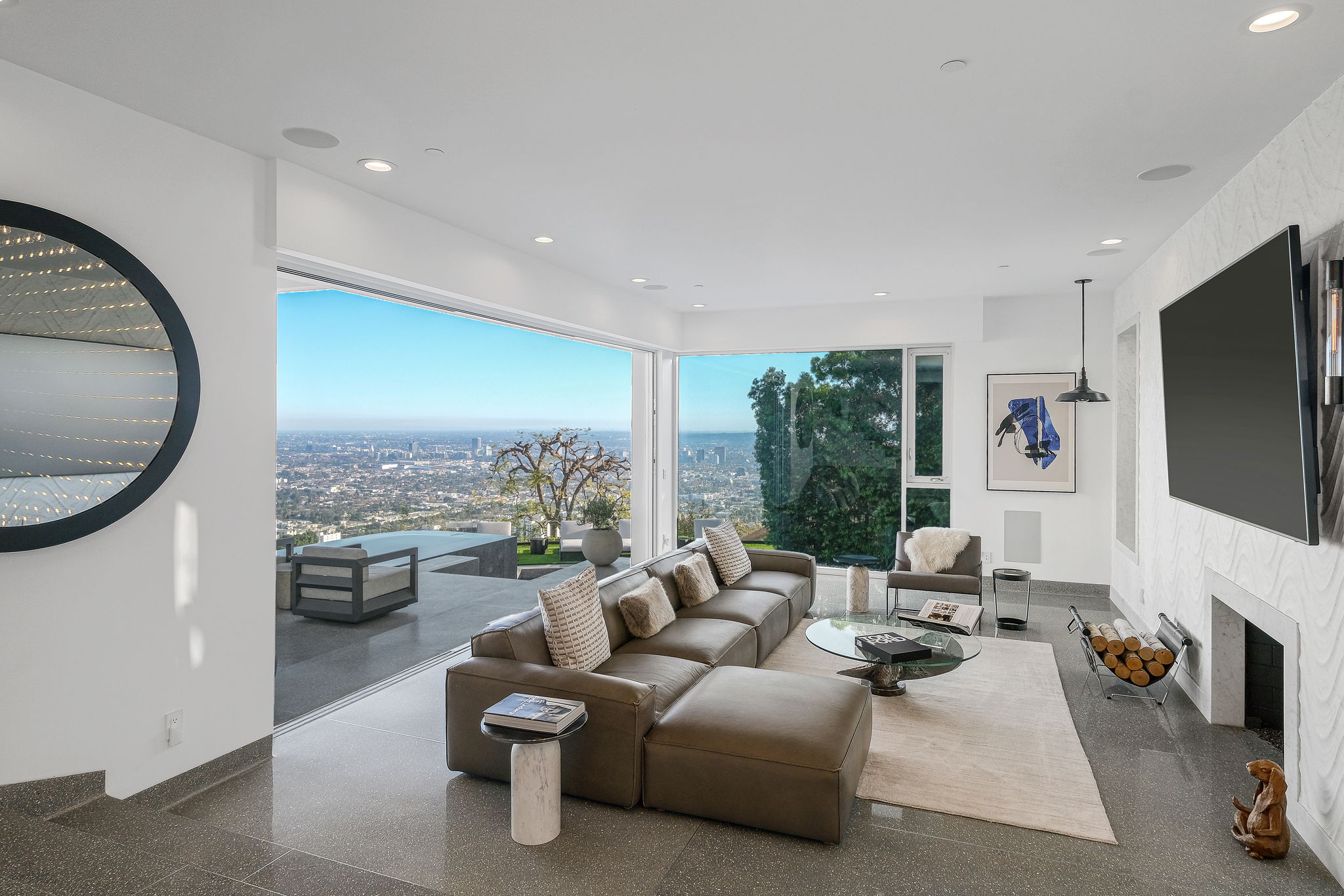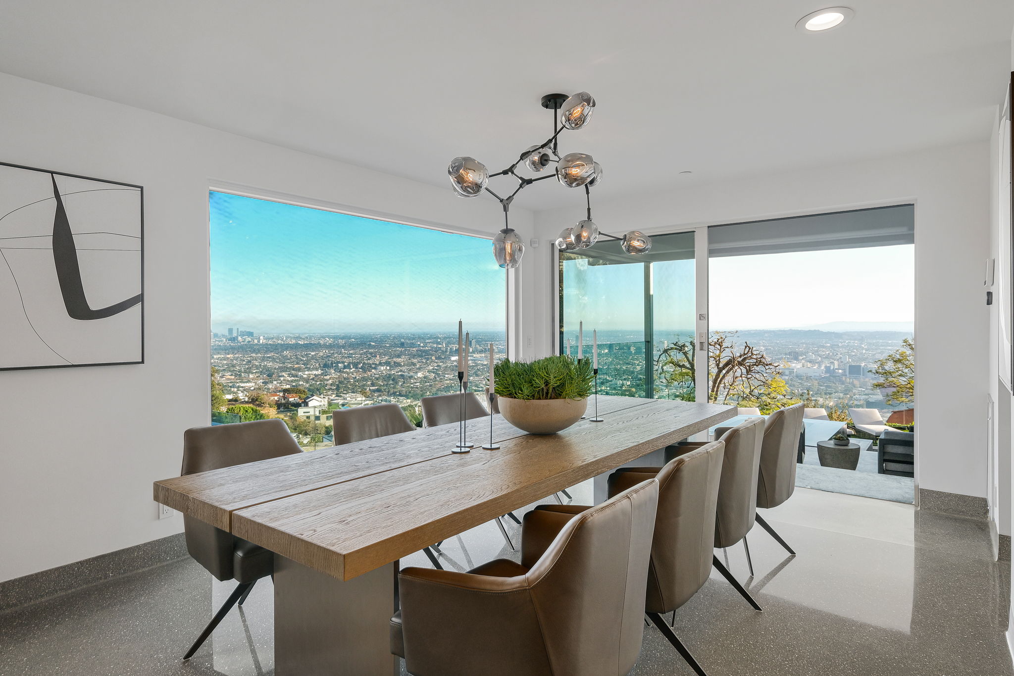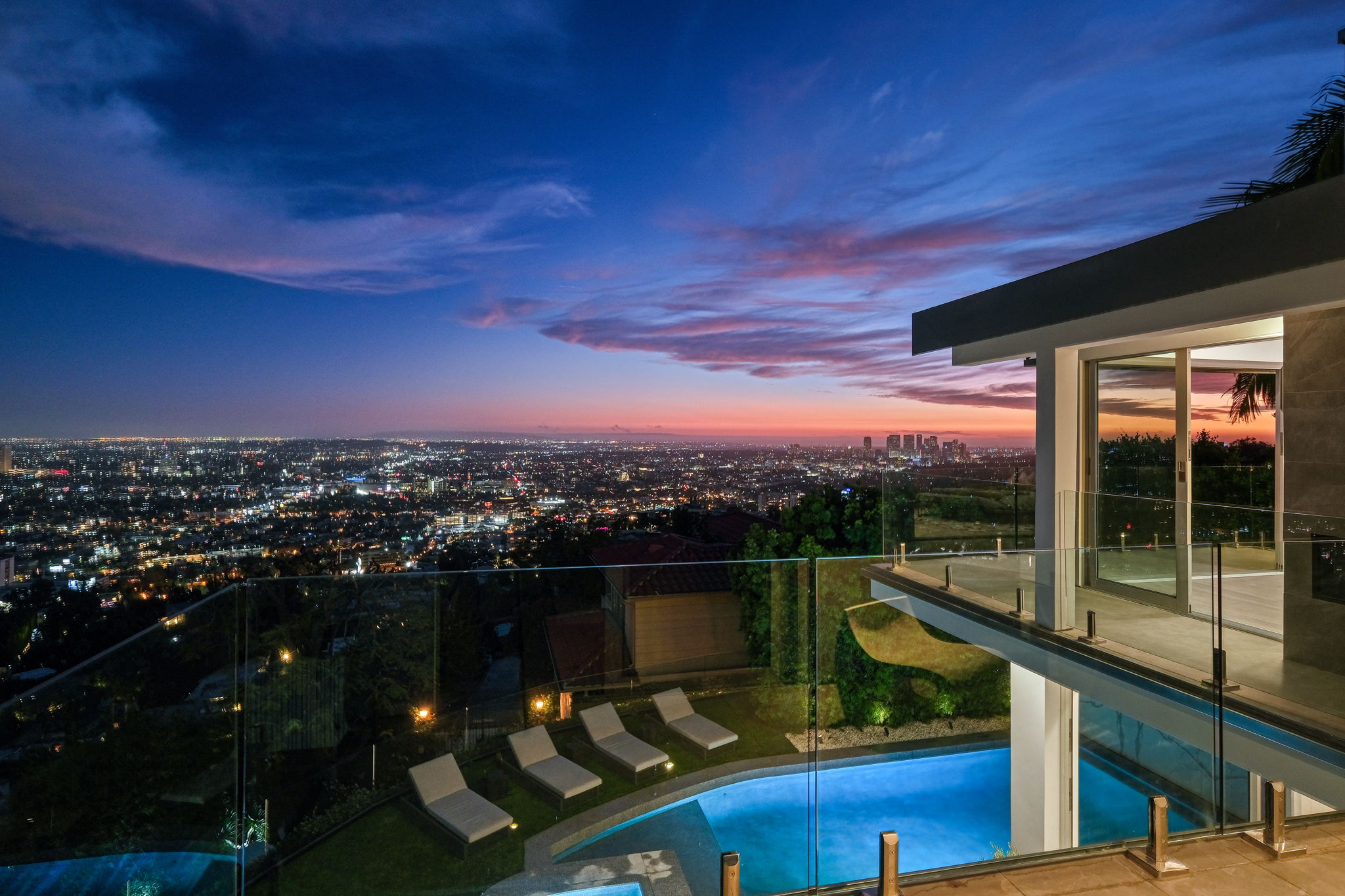 Located on a private Hollywood Hills cul de sac, this stunning modern masterpiece exudes beauty and serenity minutes from the coveted Sunset Plaza. Completely reinvented, this 3 bedroom / 4 bathroom home sits on a nearly 5,700 SF lot with 3,000 SF of livable space whose formal living and dining room include floor to ceiling Fleetwood glass sliders that open to a generous deck complete with pool, infinity spa, fire-pit and outdoor dining area overlooking views far beyond downtown and the ocean. Beautiful interior features encompass terrazzo stone flooring, an exciting chefs kitchen complete with Miele & Gaggenau appliances, stainless steel island and caesar stone counter tops. Upstairs a sophisticated master suite opens to a spacious deck w/ gorgeous city views. Complete w/Vantage integrated Smart Home system this Sunset Strip home cannot be missed!