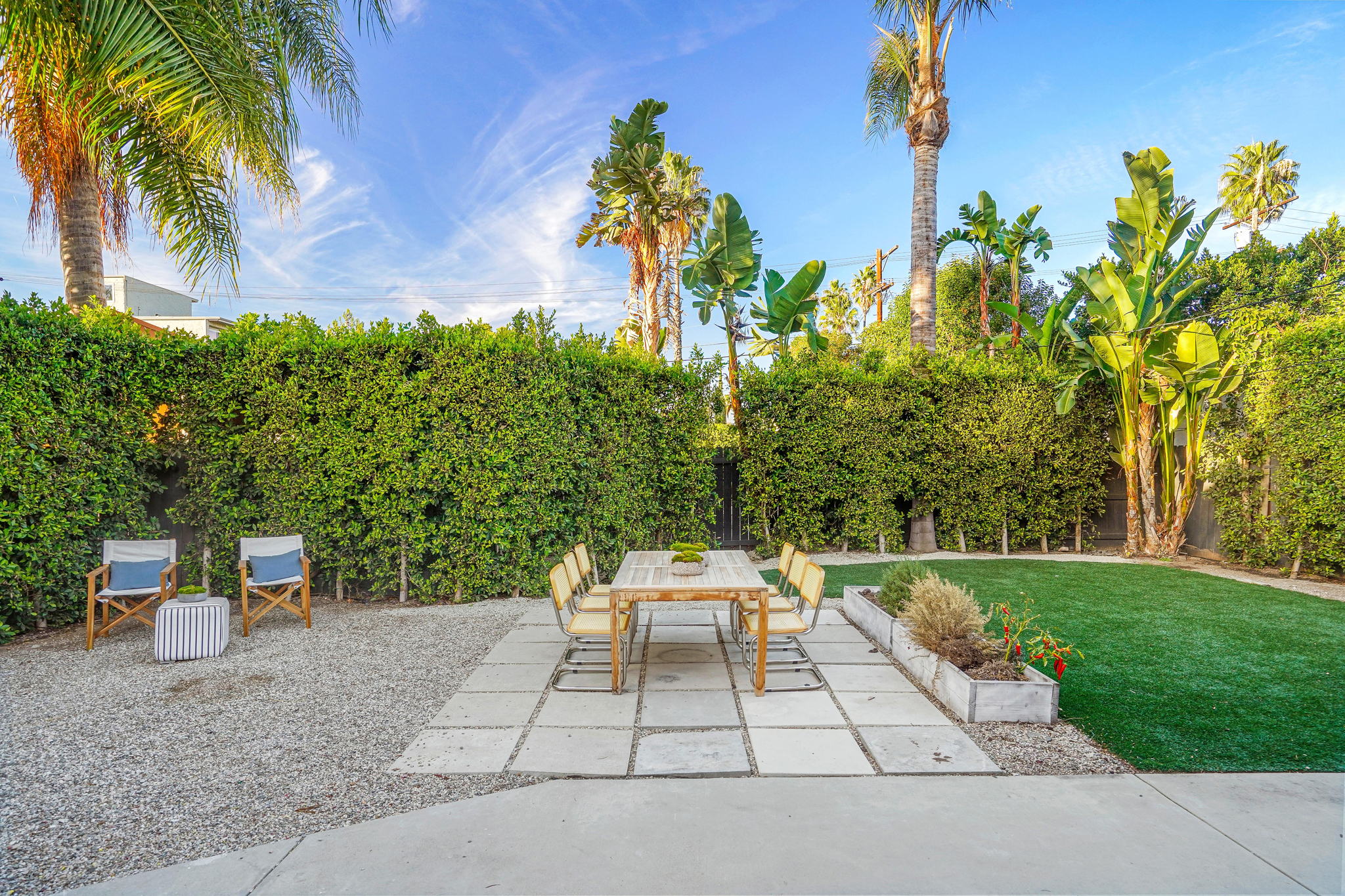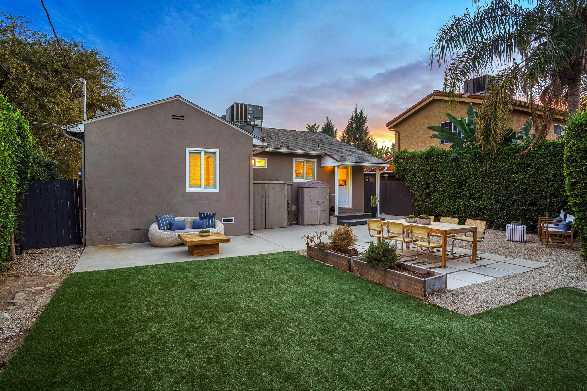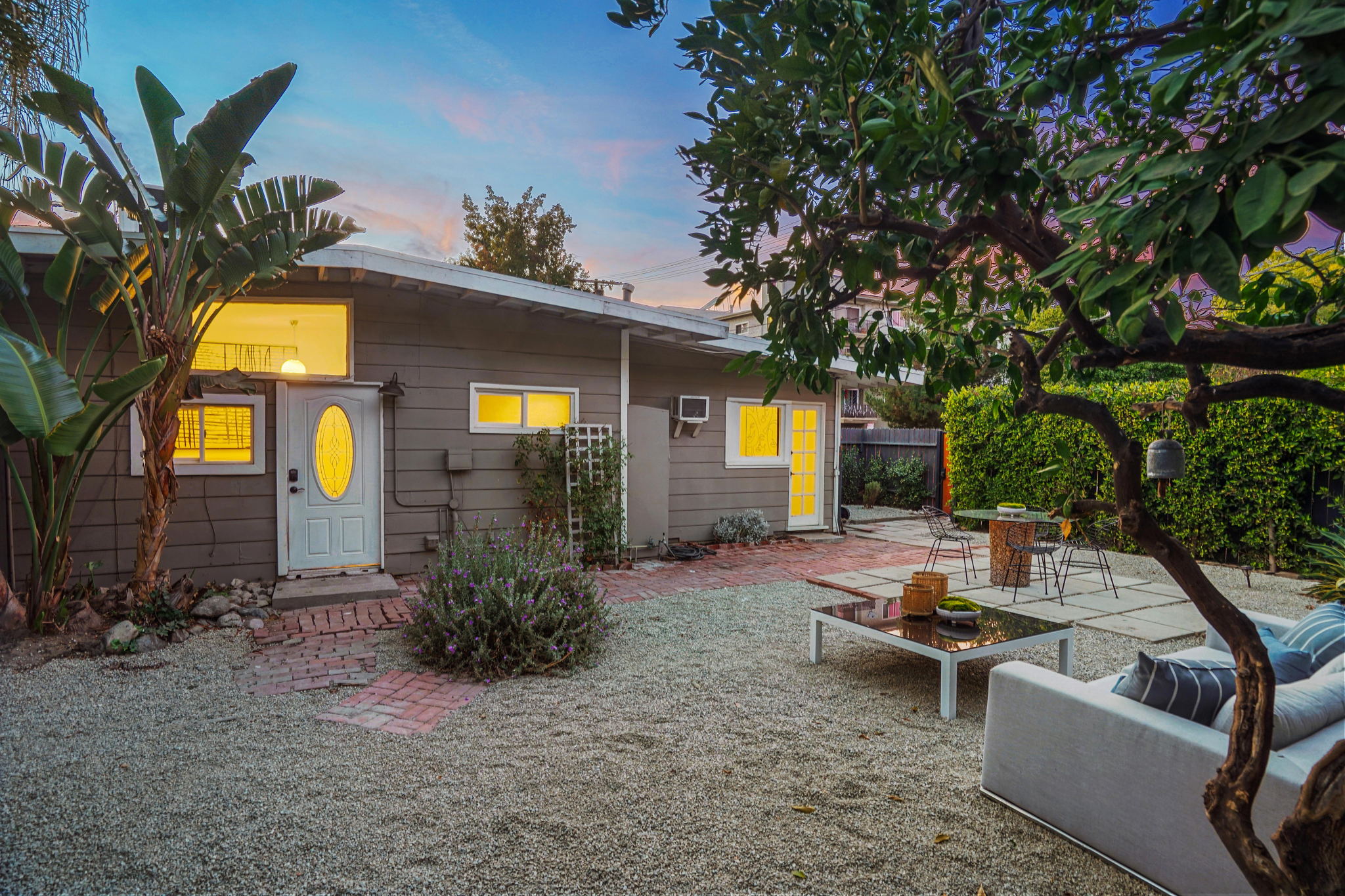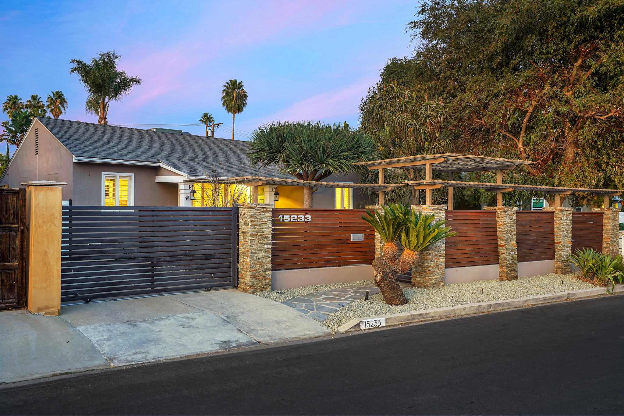 Nestled behind a privately gated and beautifully landscaped front yard in Sherman Oaks, this gorgeous three-bedroom home with a detached one-bedroom guest house is bursting with curb appeal. The open floor plan seamlessly flows from the living room, featuring a stunning decorative fireplace and built-in bookshelves, to the remodeled chefs kitchen replete with stainless steel appliances, quartz countertops with subway tile backsplash, and soft-close cabinetry. Large windows and recessed lighting throughout provide an abundance of natural light. Three bedrooms are conveniently located down the hall. The modern bathroom has a walk-in, frameless floor-to-ceiling glass shower lined in white quartz. Step into the spacious backyard oasis lined with tall ficus trees. The separate guest house features its own address and entrance. The unit is completely fenced in with its own private, lusciously landscaped yard, and can also be conveniently accessed through the main houses backyard via an incognito fenced gate. Inside opens up to a cozy living room and showcases a modern kitchen and a full, updated bathroom. The serene bedroom has a sliding door facing the private yard, featuring gorgeous hibiscus plants and a mature Mandarin tree. Updates to the property include new double-pane windows, energy-efficient shutters, a tankless water heater, attic insulation, a Nest thermostat, and a new washer/dryer.