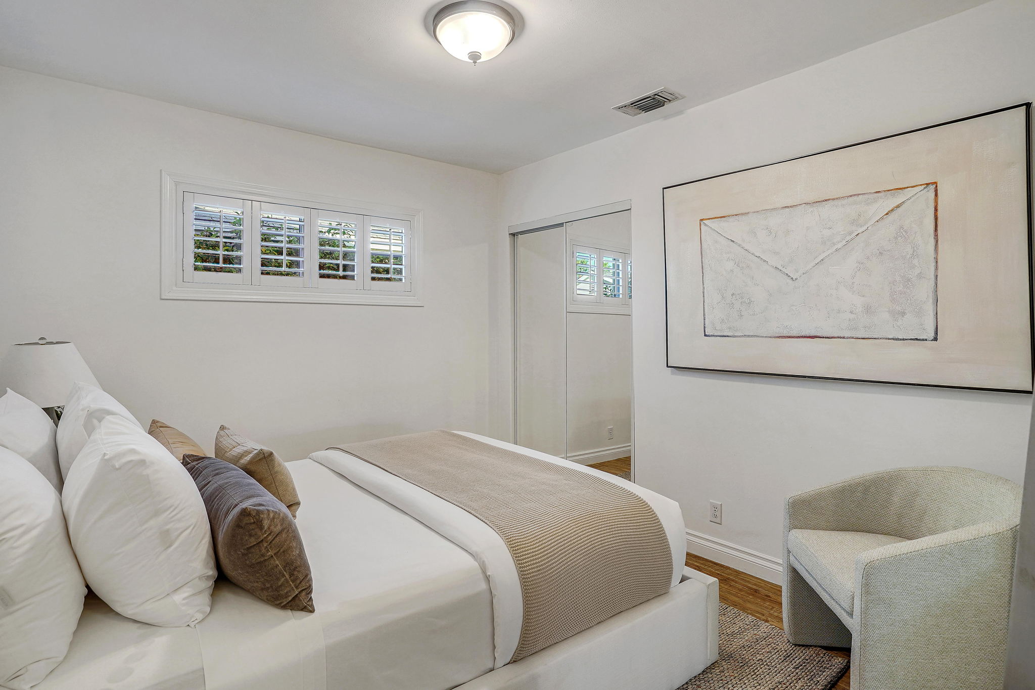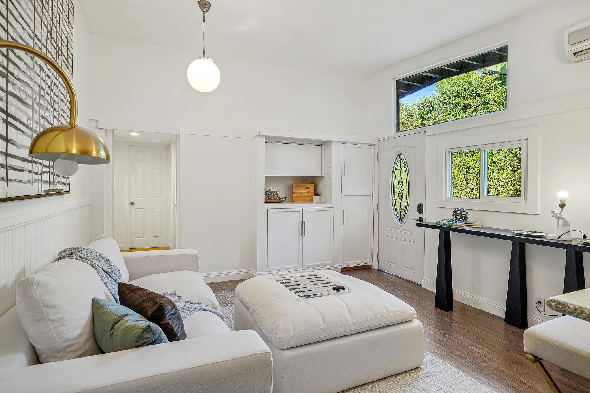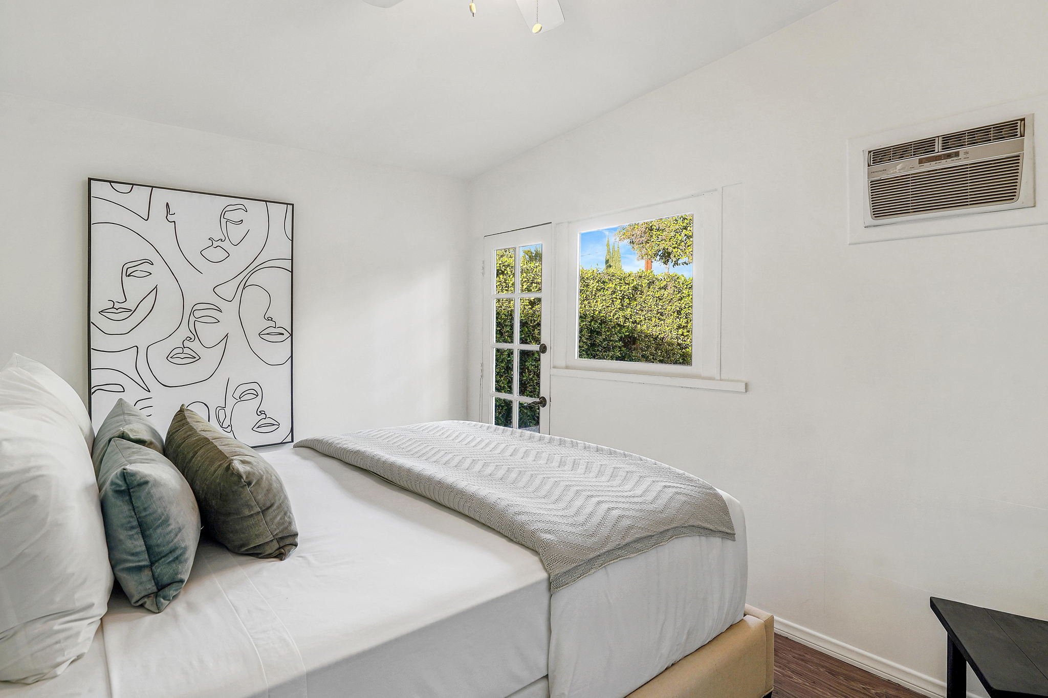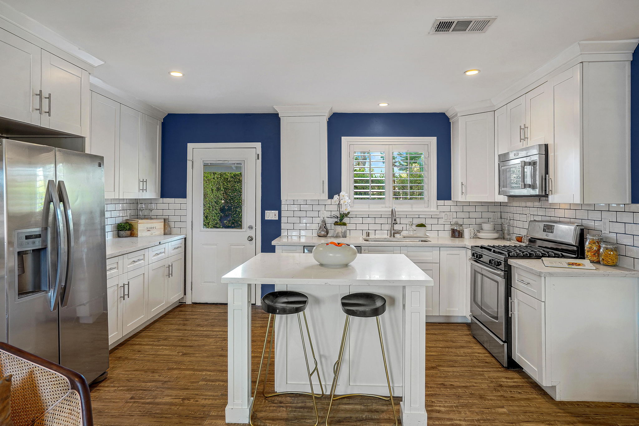 Nestled behind a privately gated and beautifully landscaped front yard in Sherman Oaks, this gorgeous three-bedroom home with a detached one-bedroom guest house is bursting with curb appeal. The open floor plan seamlessly flows from the living room, featuring a stunning decorative fireplace and built-in bookshelves, to the remodeled chefs kitchen replete with stainless steel appliances, quartz countertops with subway tile backsplash, and soft-close cabinetry. Large windows and recessed lighting throughout provide an abundance of natural light. Three bedrooms are conveniently located down the hall. The modern bathroom has a walk-in, frameless floor-to-ceiling glass shower lined in white quartz. Step into the spacious backyard oasis lined with tall ficus trees. The separate guest house features its own address and entrance. The unit is completely fenced in with its own private, lusciously landscaped yard, and can also be conveniently accessed through the main houses backyard via an incognito fenced gate. Inside opens up to a cozy living room and showcases a modern kitchen and a full, updated bathroom. The serene bedroom has a sliding door facing the private yard, featuring gorgeous hibiscus plants and a mature Mandarin tree. Updates to the property include new double-pane windows, energy-efficient shutters, a tankless water heater, attic insulation, a Nest thermostat, and a new washer/dryer.