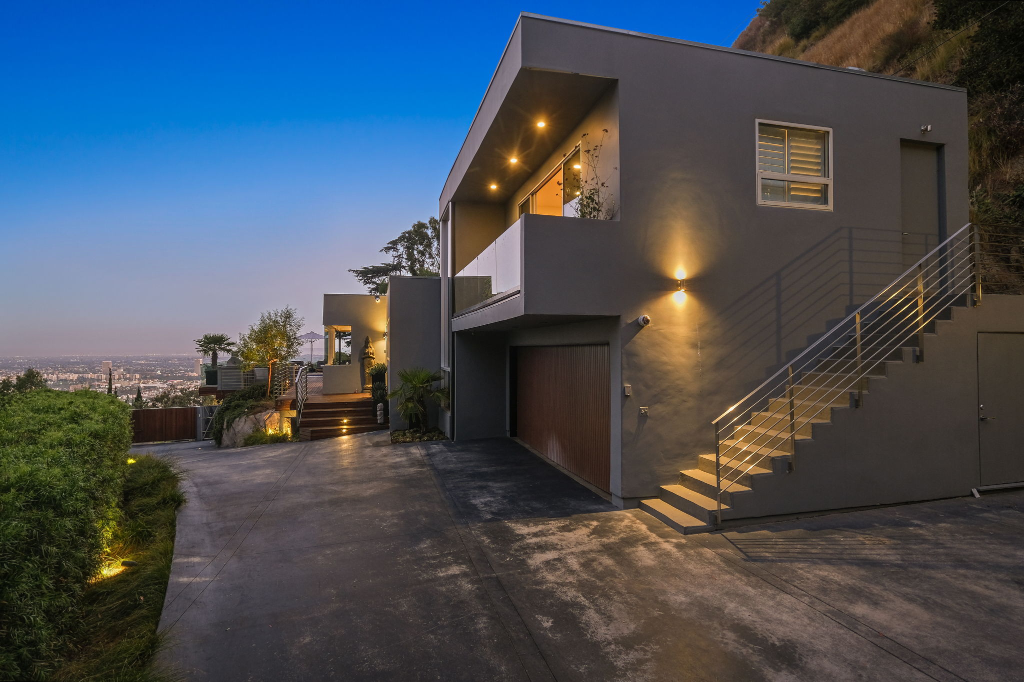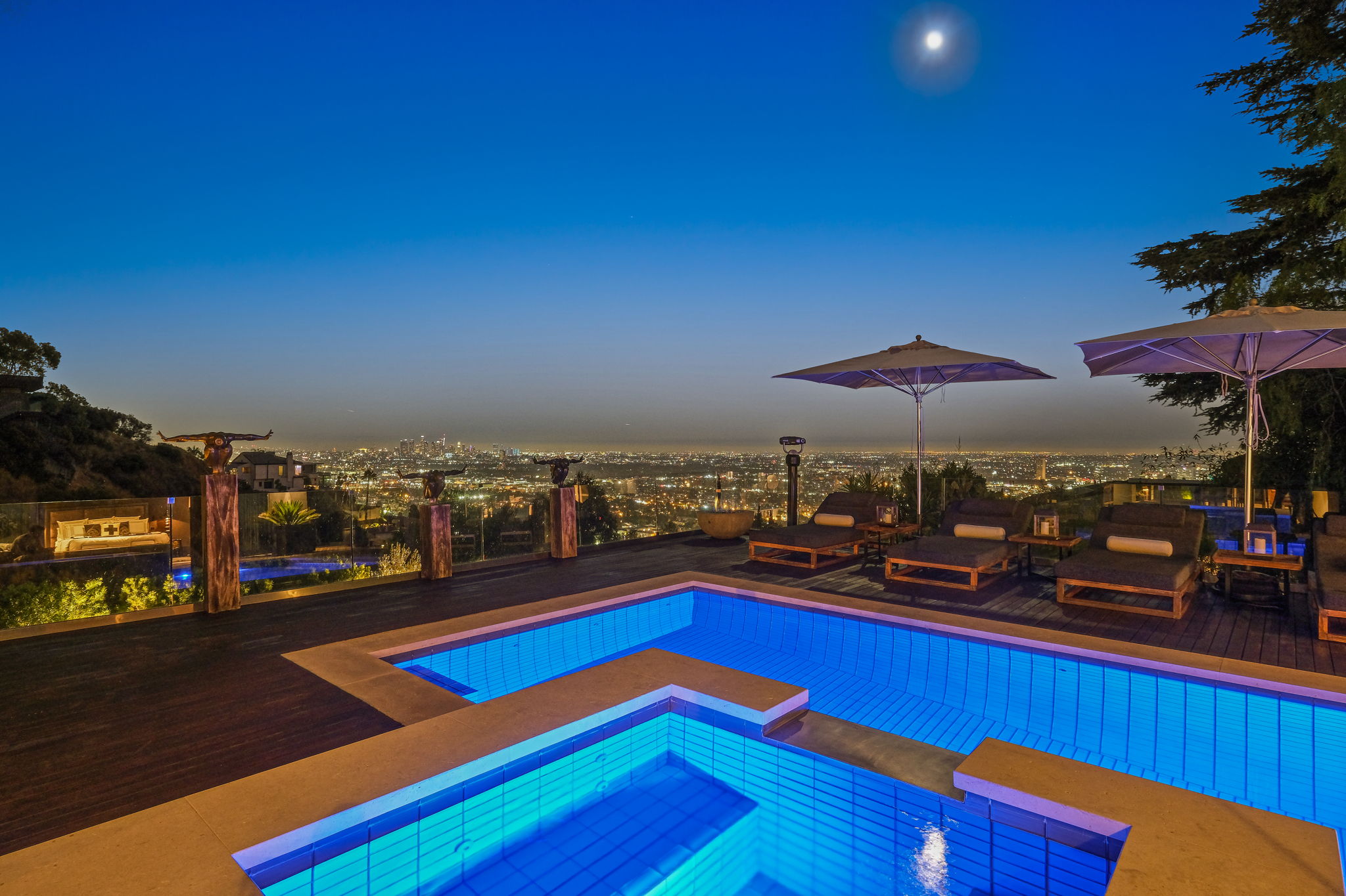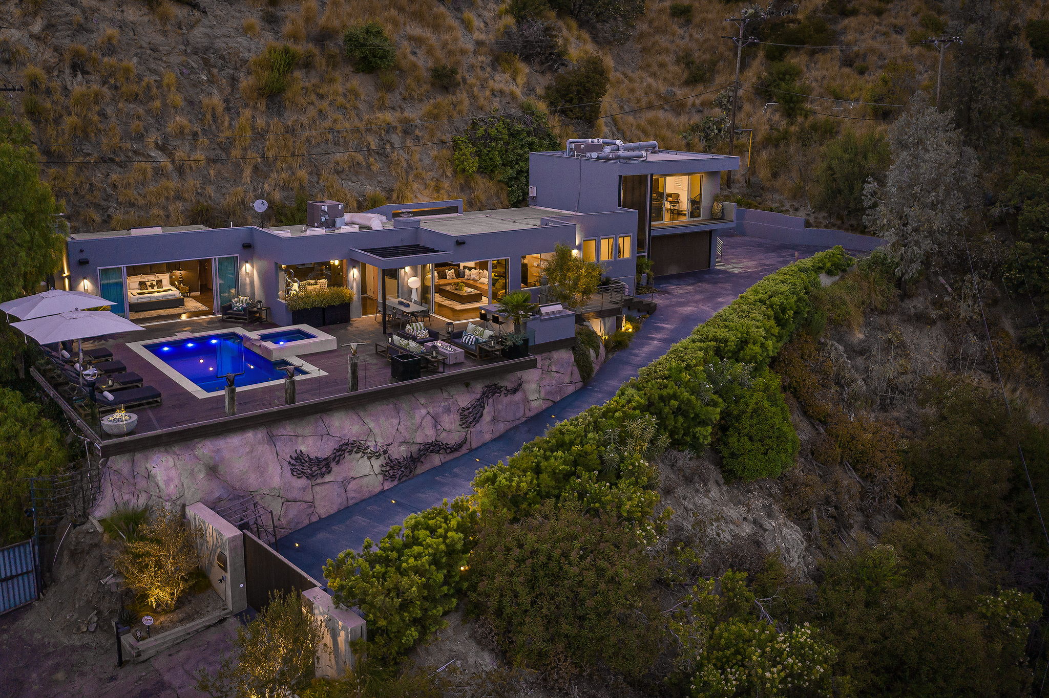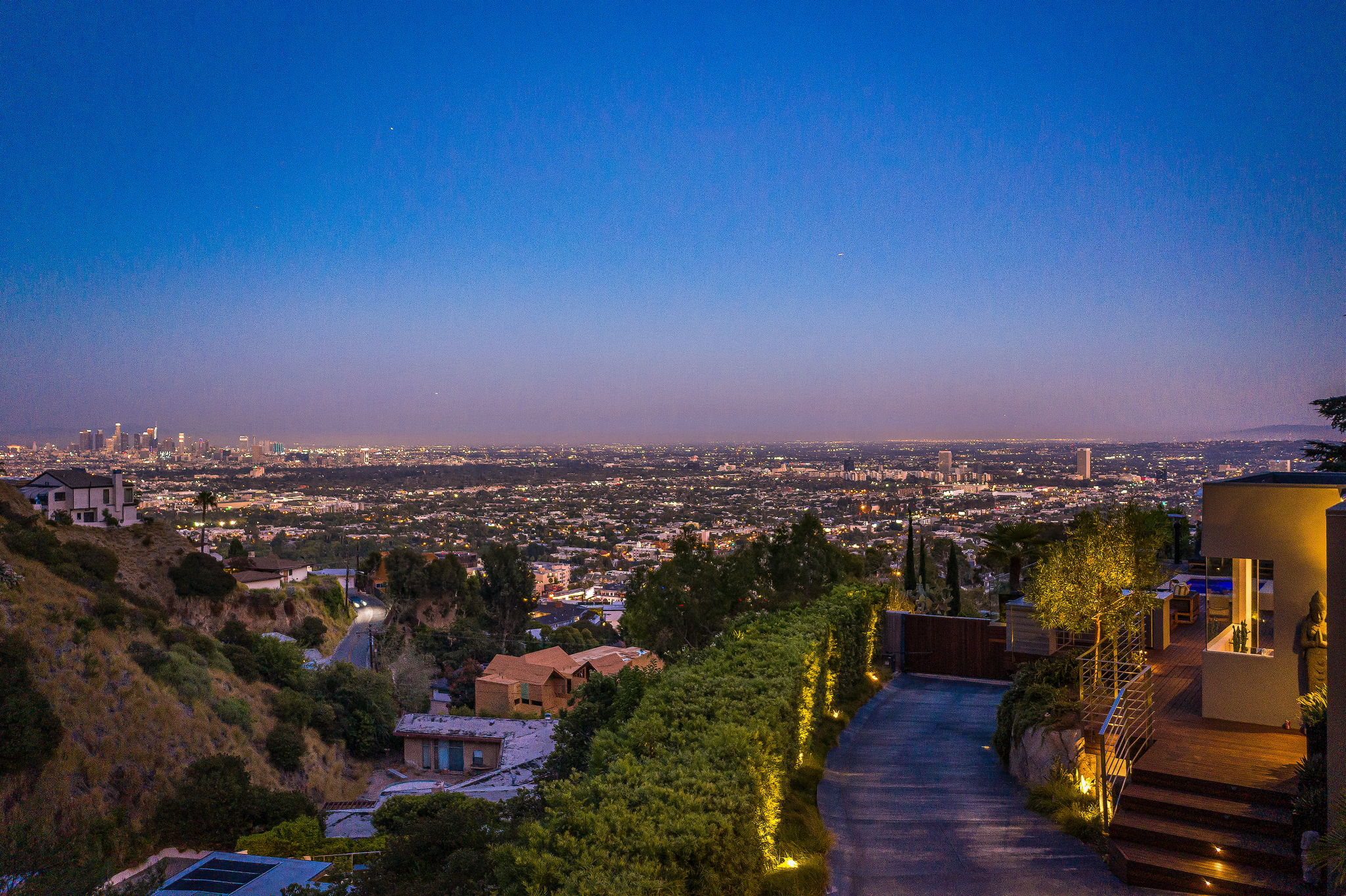 Set behind a long privately gated driveway above the Sunset Strip, this contemporary jewel box features jetliner views of the entire city. On almost one acre of land, this four-bedroom, four-bathroom estate creates the perfect indoor/outdoor lifestyle with seamless access to the gorgeous pool, spa, and massive entertainment deck replete with outdoor BBQ, multiple gas fireplaces, and shaded patio. The interior boasts an open floor plan with sliding Fleetwood doors and dramatic views, dining area, plus a chef's kitchen with beautiful wooden cabinetry, Miele/Wolf appliances, and large wine cooler. The luxurious owner's suite opens to the pool/spa and has its own fireplace with built-in library shelving, oversized drop-down theater projection screen, and a resort-like bathroom with separate steam shower and walk-in closet. Two additional bedrooms and one attached en-suite guest unit with separate entrance. 2-car garage with motor court/sport court offering additional parking up to 6 cars.