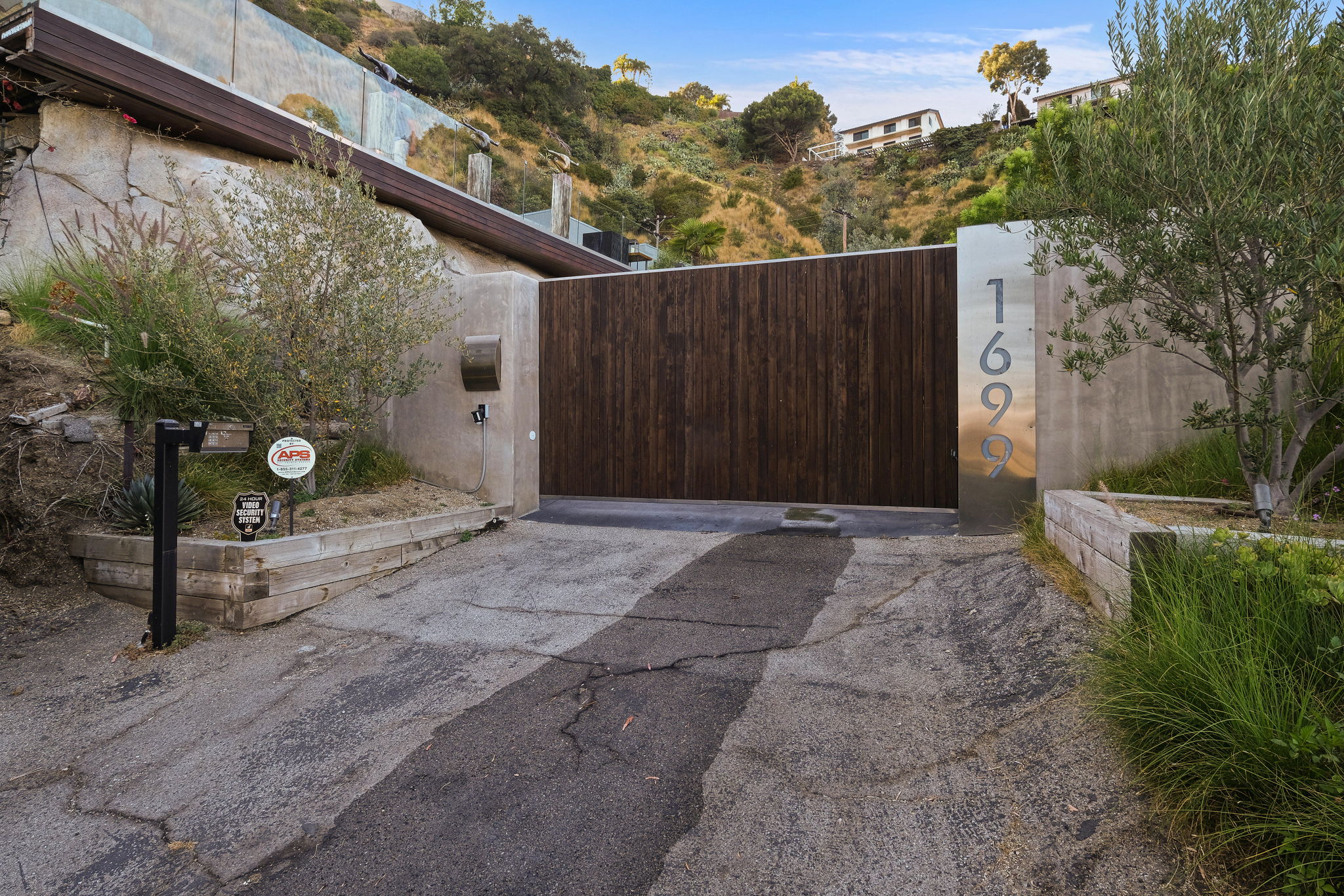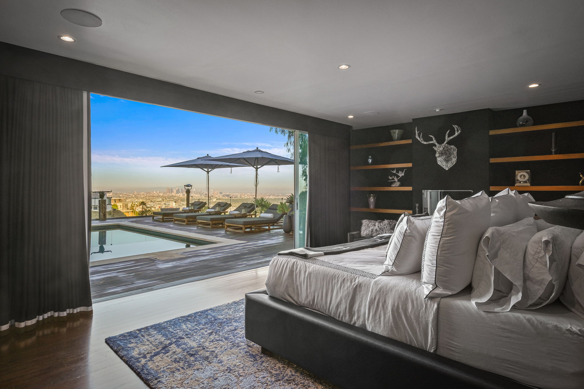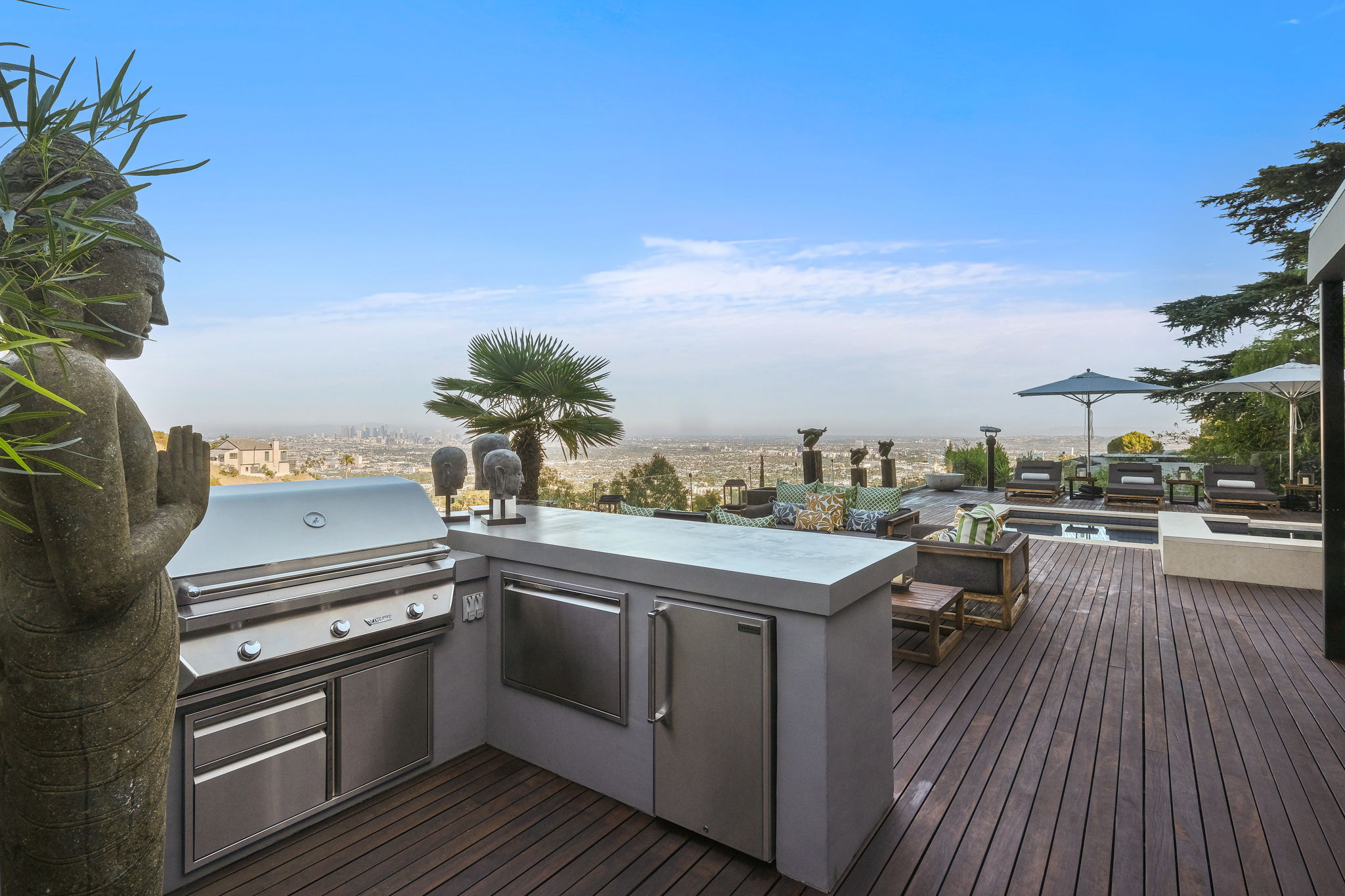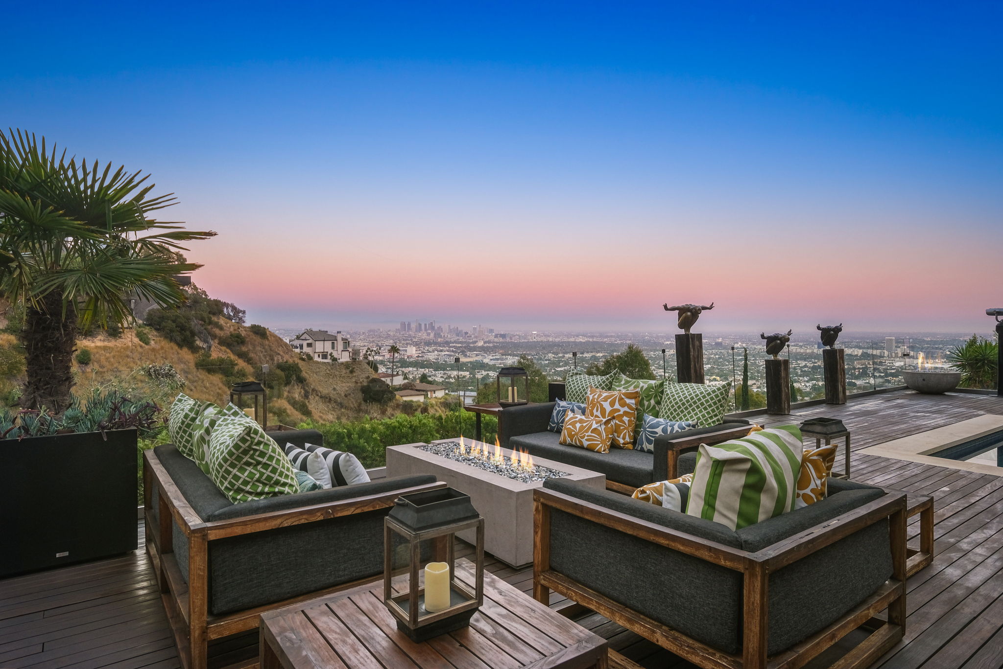 Set behind a long privately gated driveway above the Sunset Strip, this contemporary jewel box features jetliner views of the entire city. On almost one acre of land, this four-bedroom, four-bathroom estate creates the perfect indoor/outdoor lifestyle with seamless access to the gorgeous pool, spa, and massive entertainment deck replete with outdoor BBQ, multiple gas fireplaces, and shaded patio. The interior boasts an open floor plan with sliding Fleetwood doors and dramatic views, dining area, plus a chef's kitchen with beautiful wooden cabinetry, Miele/Wolf appliances, and large wine cooler. The luxurious owner's suite opens to the pool/spa and has its own fireplace with built-in library shelving, oversized drop-down theater projection screen, and a resort-like bathroom with separate steam shower and walk-in closet. Two additional bedrooms and one attached en-suite guest unit with separate entrance. 2-car garage with motor court/sport court offering additional parking up to 6 cars.