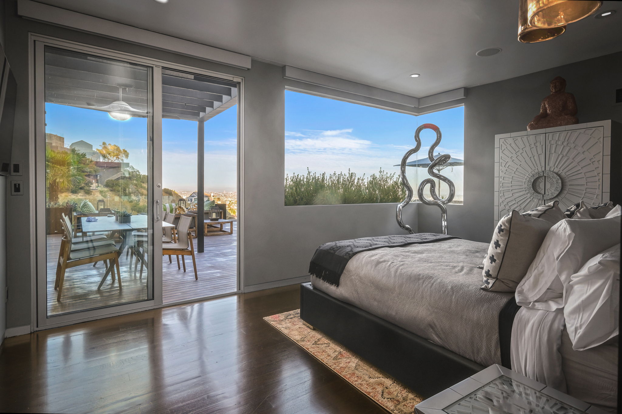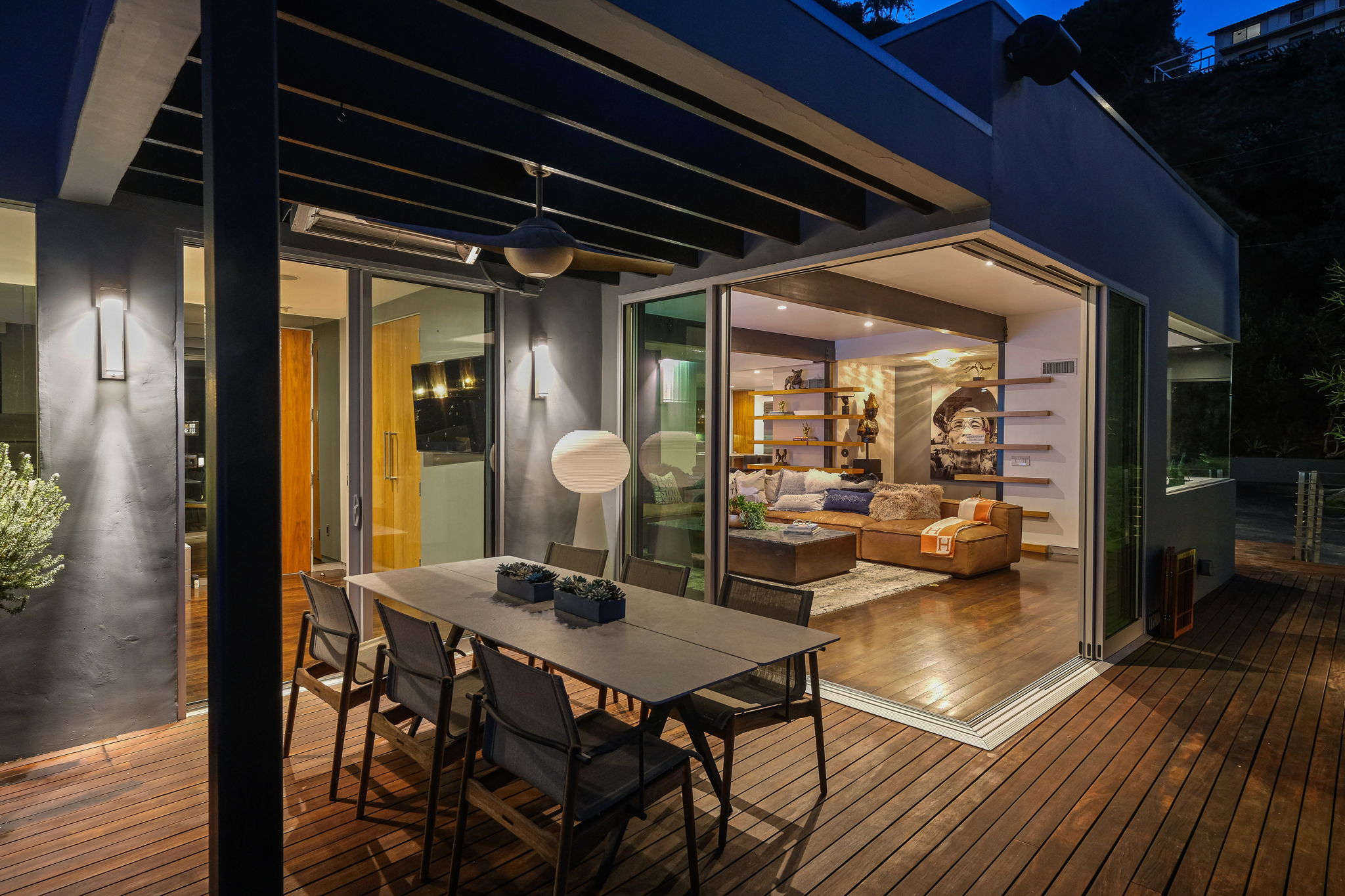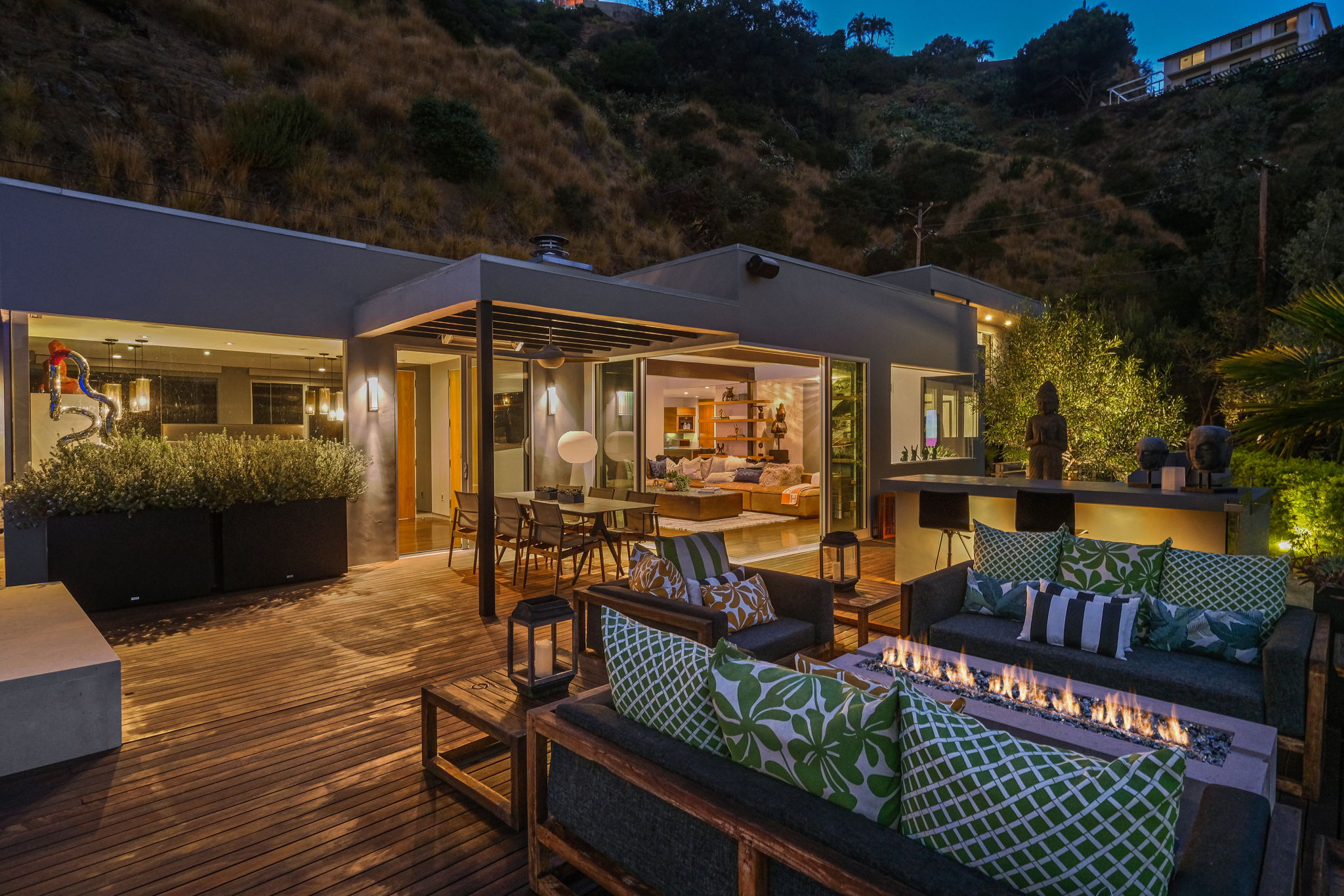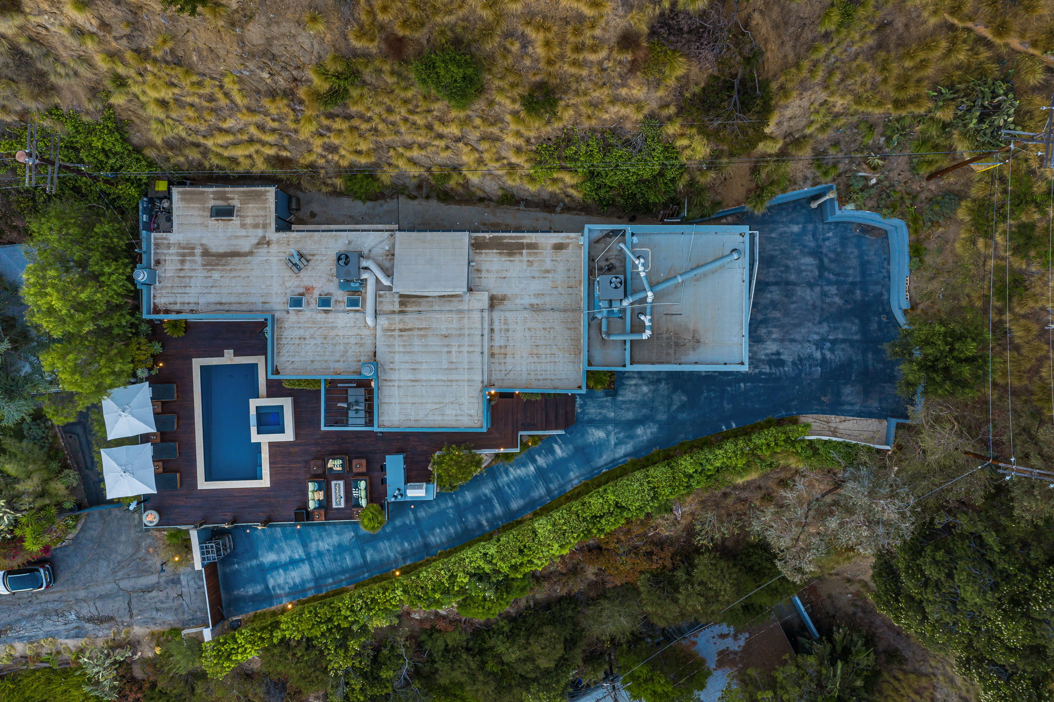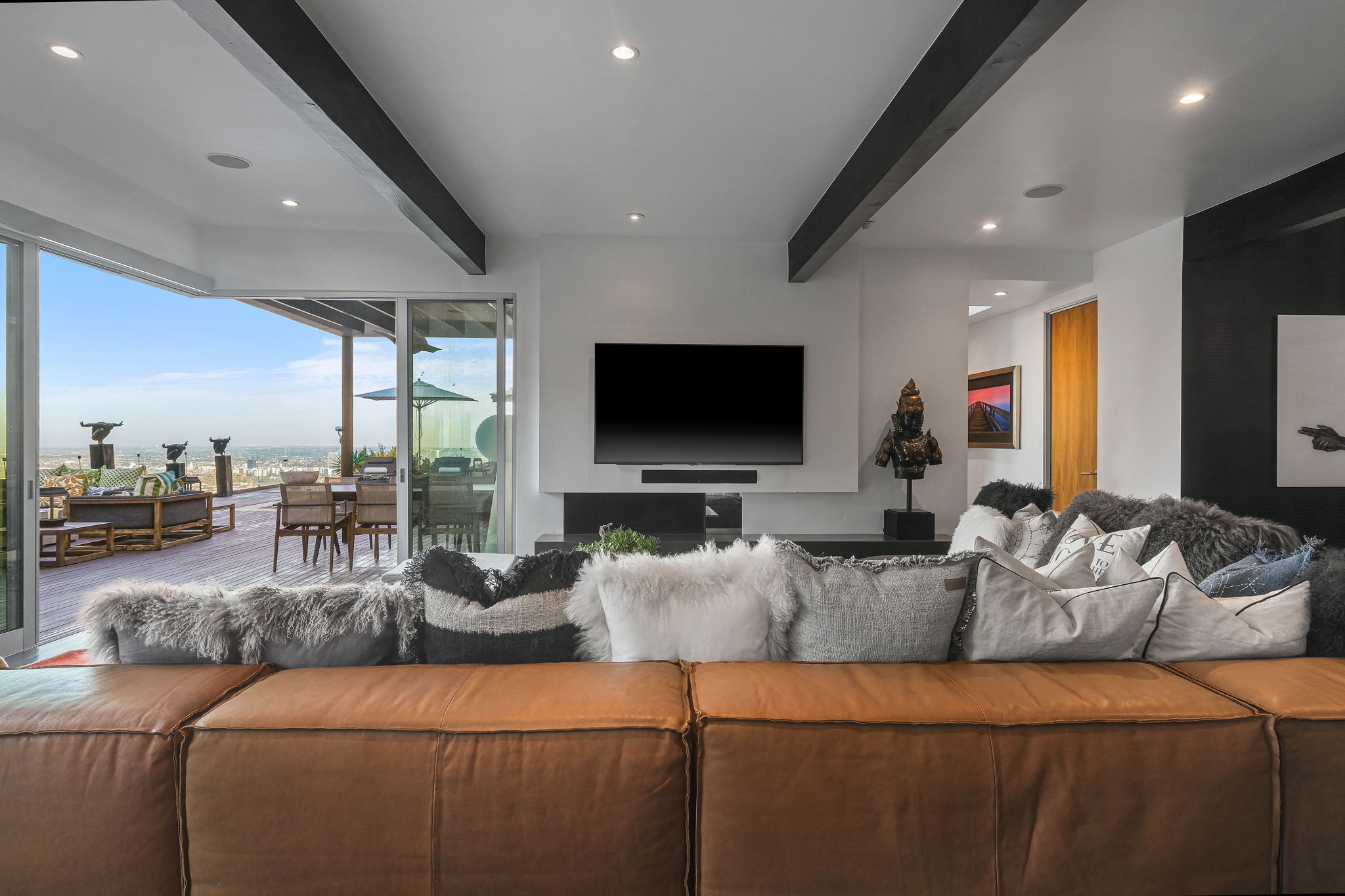 Set behind a long privately gated driveway above the Sunset Strip, this contemporary jewel box features jetliner views of the entire city. On almost one acre of land, this four-bedroom, four-bathroom estate creates the perfect indoor/outdoor lifestyle with seamless access to the gorgeous pool, spa, and massive entertainment deck replete with outdoor BBQ, multiple gas fireplaces, and shaded patio. The interior boasts an open floor plan with sliding Fleetwood doors and dramatic views, dining area, plus a chef's kitchen with beautiful wooden cabinetry, Miele/Wolf appliances, and large wine cooler. The luxurious owner's suite opens to the pool/spa and has its own fireplace with built-in library shelving, oversized drop-down theater projection screen, and a resort-like bathroom with separate steam shower and walk-in closet. Two additional bedrooms and one attached en-suite guest unit with separate entrance. 2-car garage with motor court/sport court offering additional parking up to 6 cars.