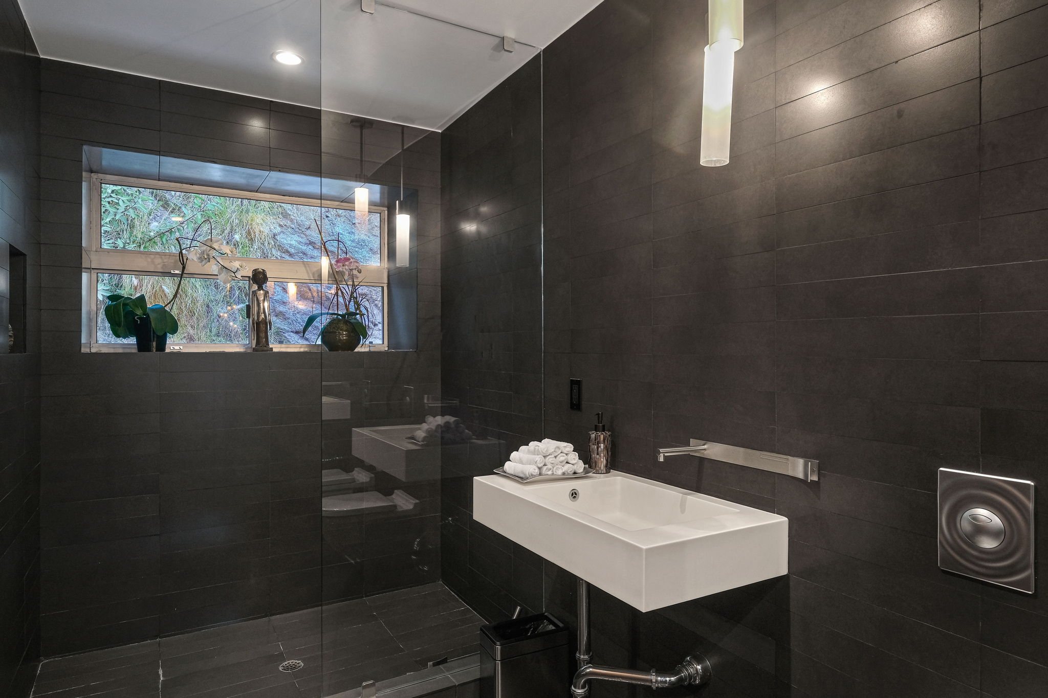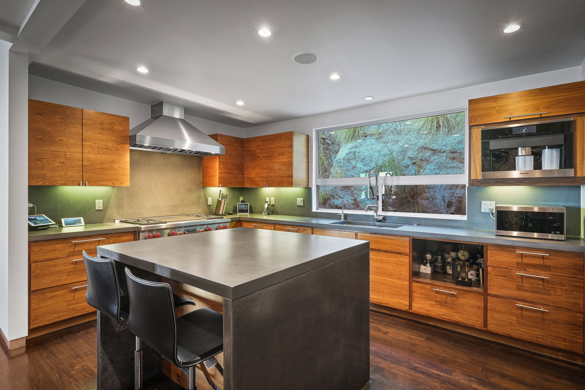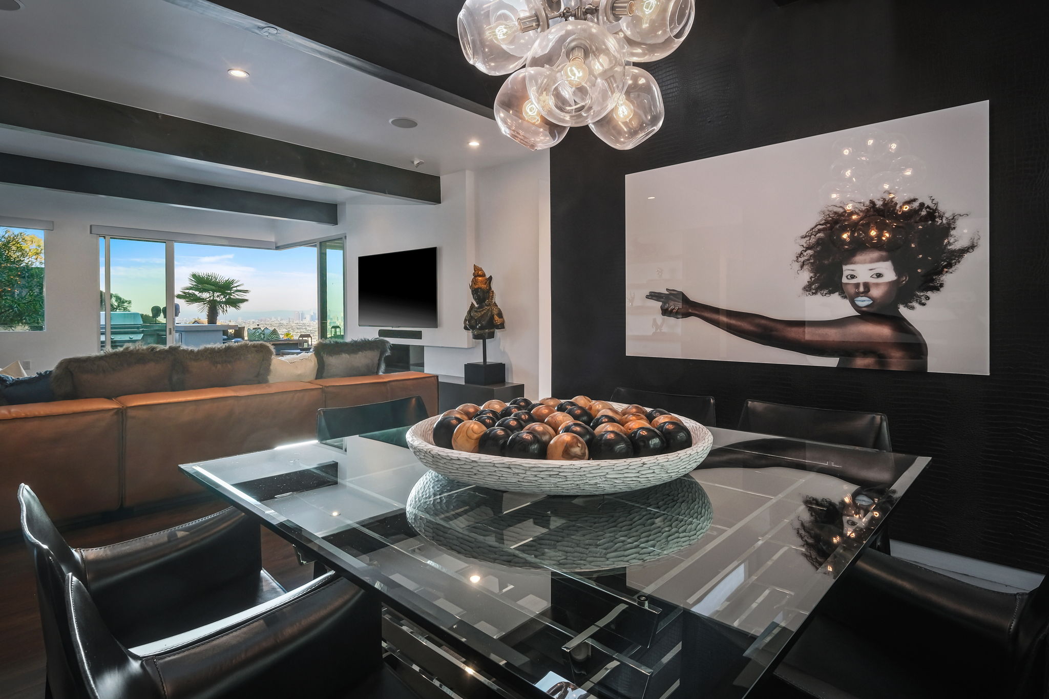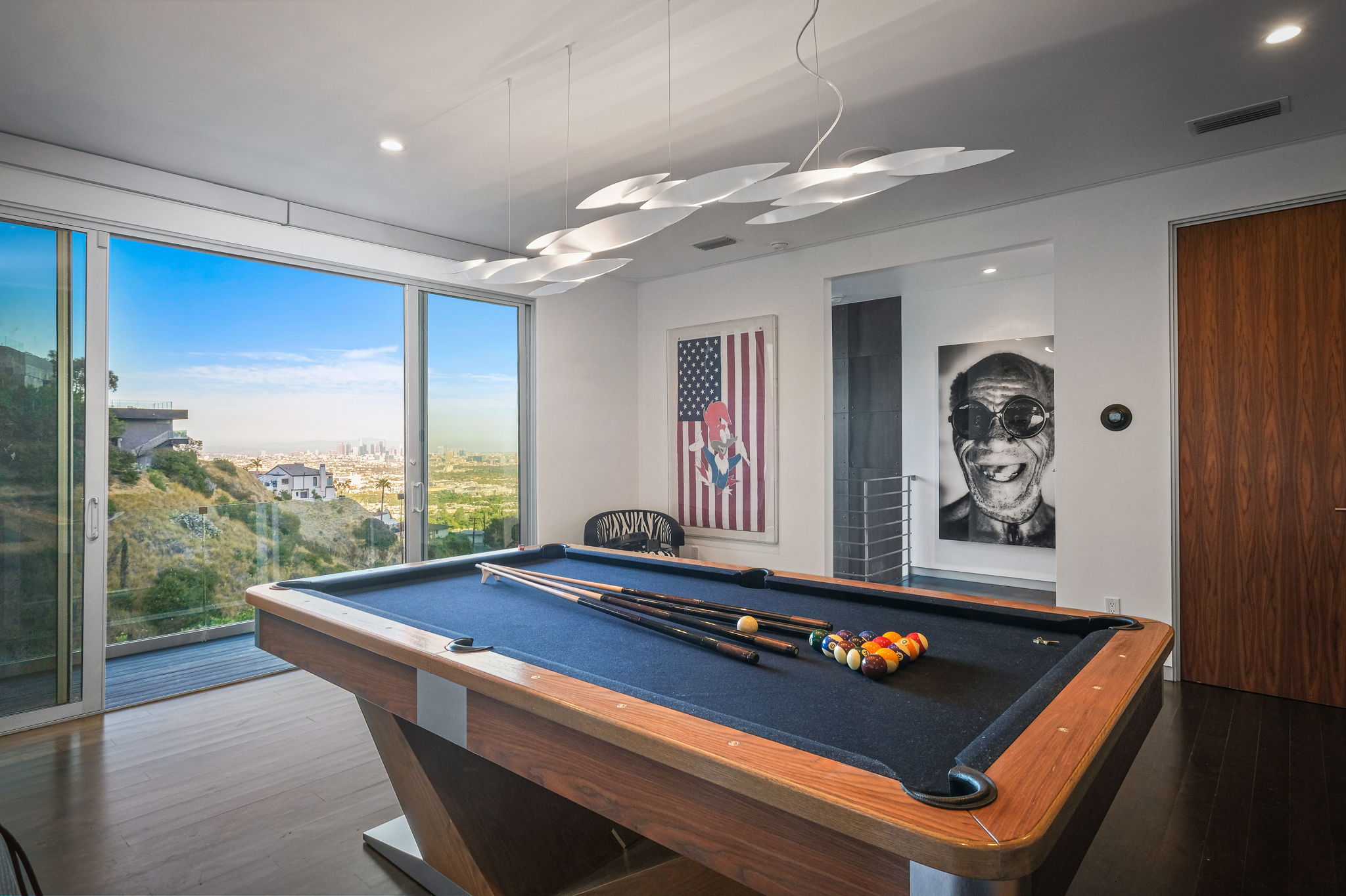Set behind a long privately gated driveway above the Sunset Strip, this contemporary jewel box features jetliner views of the entire city. On almost one acre of land, this four-bedroom, four-bathroom estate creates the perfect indoor/outdoor lifestyle with seamless access to the gorgeous pool, spa, and massive entertainment deck replete with outdoor BBQ, multiple gas fireplaces, and shaded patio. The interior boasts an open floor plan with sliding Fleetwood doors and dramatic views, dining area, plus a chef's kitchen with beautiful wooden cabinetry, Miele/Wolf appliances, and large wine cooler. The luxurious owner's suite opens to the pool/spa and has its own fireplace with built-in library shelving, oversized drop-down theater projection screen, and a resort-like bathroom with separate steam shower and walk-in closet. Two additional bedrooms and one attached en-suite guest unit with separate entrance. 2-car garage with motor court/sport court offering additional parking up to 6 cars.