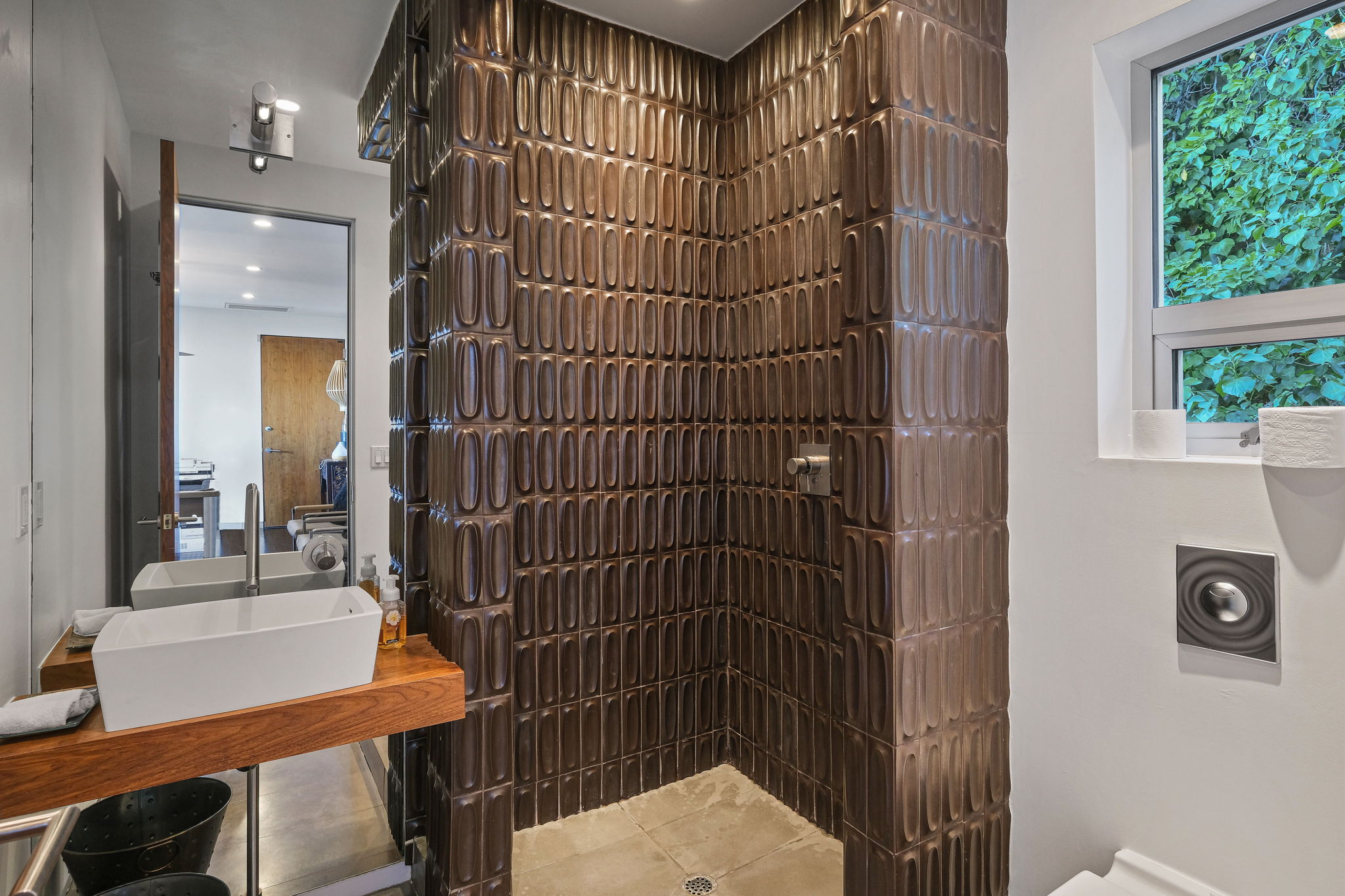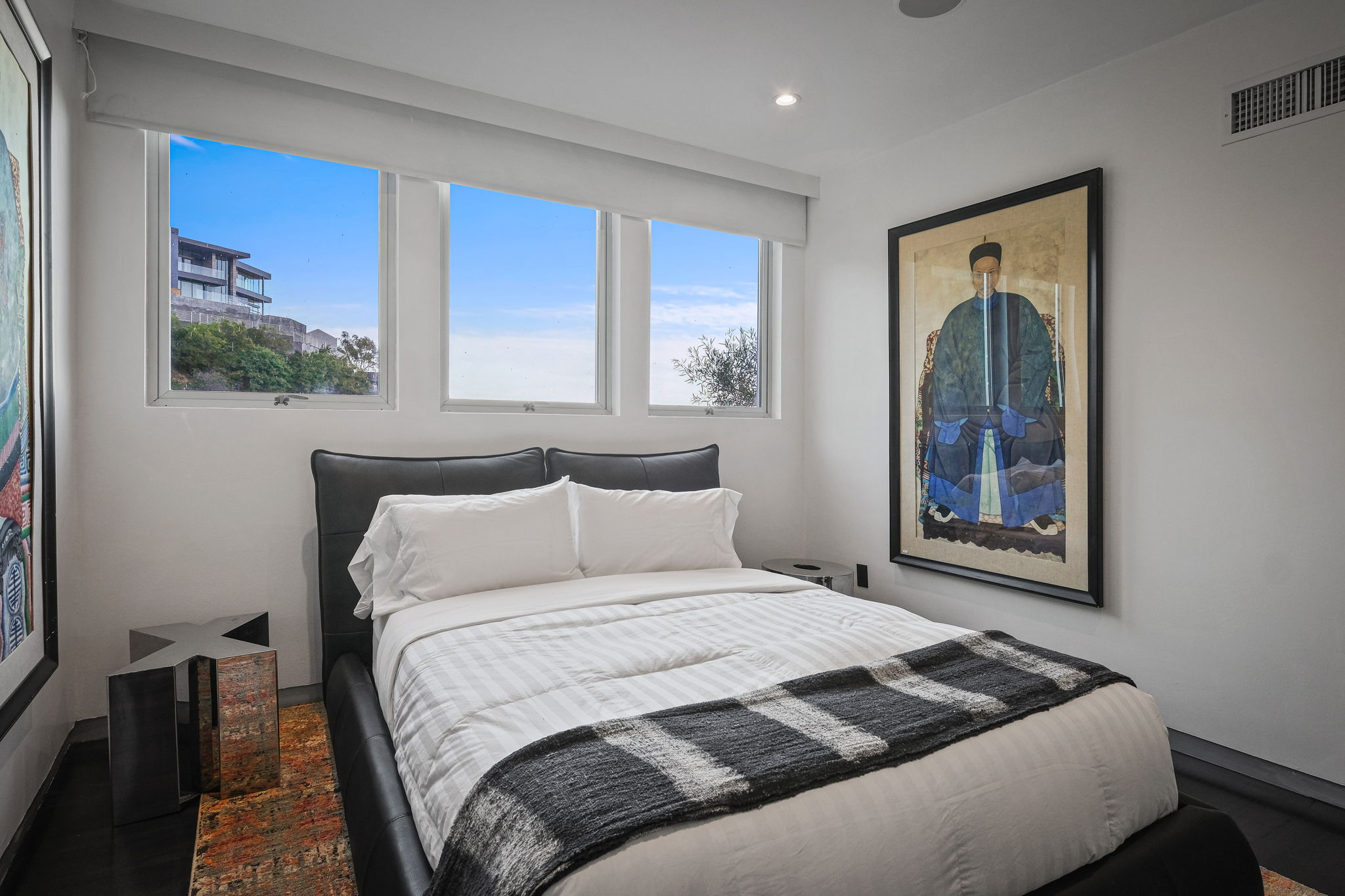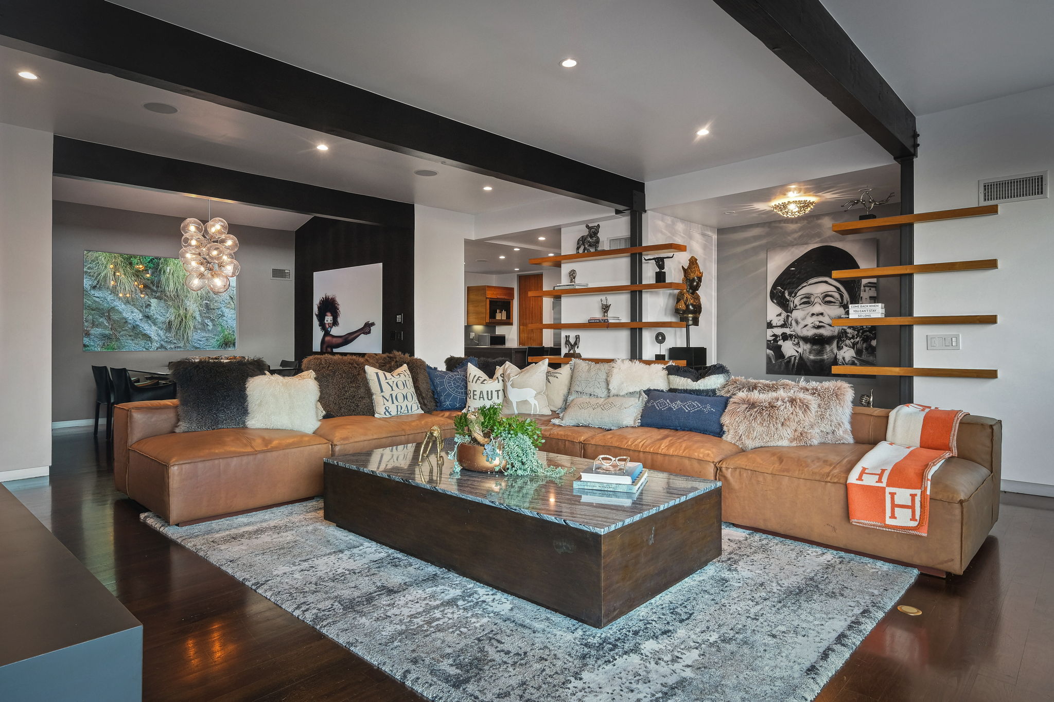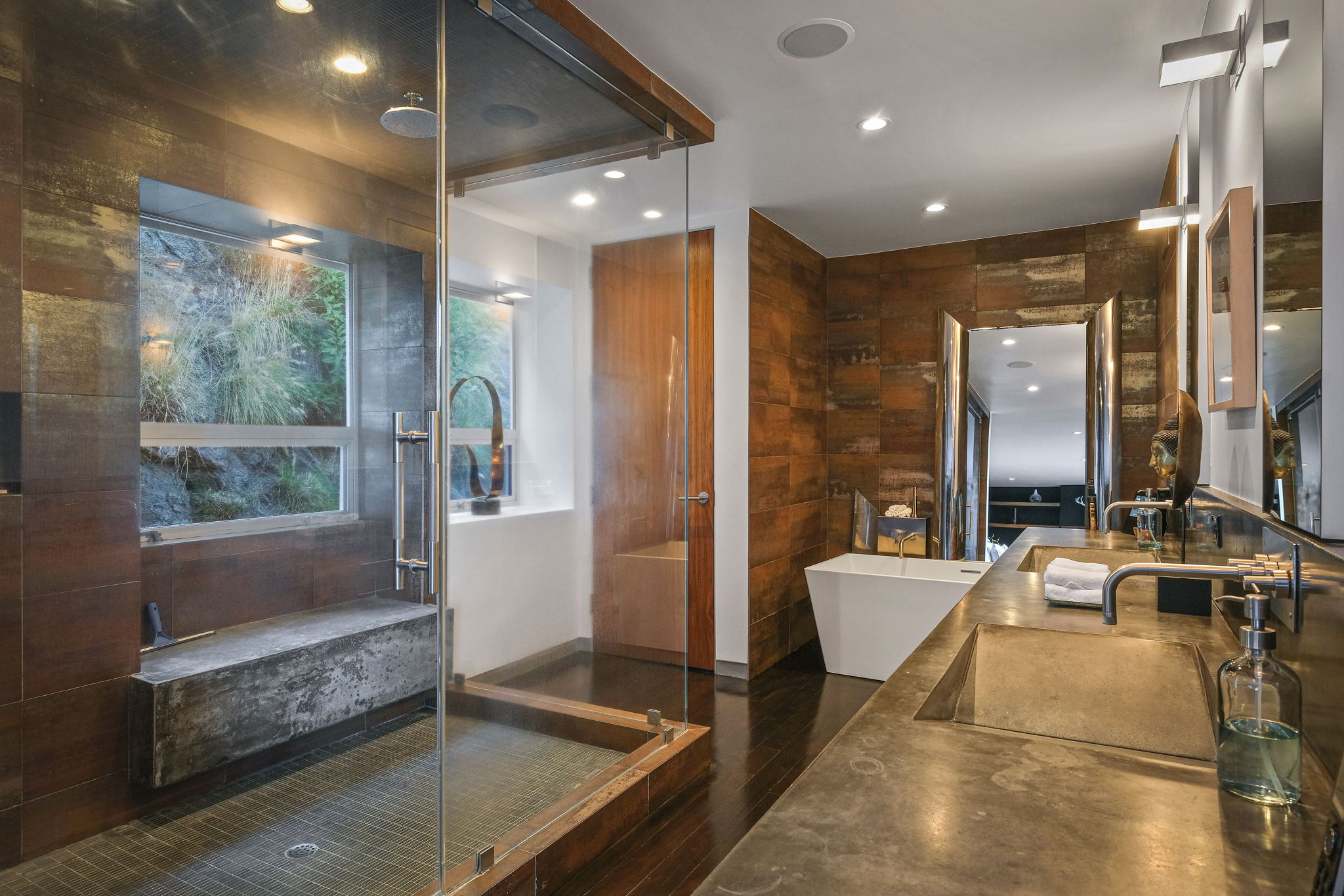 Set behind a long privately gated driveway above the Sunset Strip, this contemporary jewel box features jetliner views of the entire city. On almost one acre of land, this four-bedroom, four-bathroom estate creates the perfect indoor/outdoor lifestyle with seamless access to the gorgeous pool, spa, and massive entertainment deck replete with outdoor BBQ, multiple gas fireplaces, and shaded patio. The interior boasts an open floor plan with sliding Fleetwood doors and dramatic views, dining area, plus a chef's kitchen with beautiful wooden cabinetry, Miele/Wolf appliances, and large wine cooler. The luxurious owner's suite opens to the pool/spa and has its own fireplace with built-in library shelving, oversized drop-down theater projection screen, and a resort-like bathroom with separate steam shower and walk-in closet. Two additional bedrooms and one attached en-suite guest unit with separate entrance. 2-car garage with motor court/sport court offering additional parking up to 6 cars.