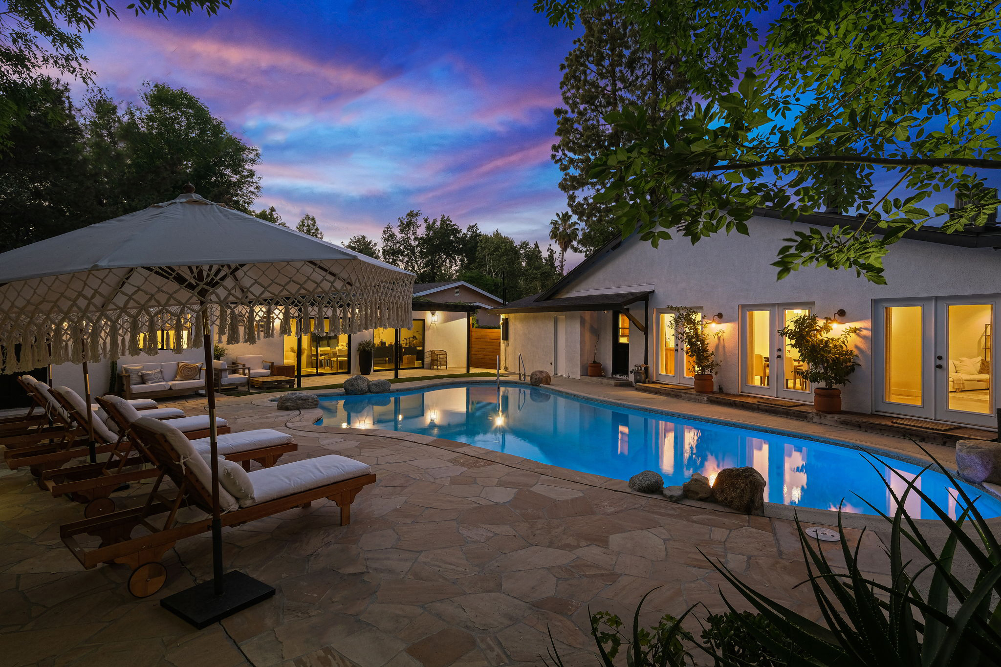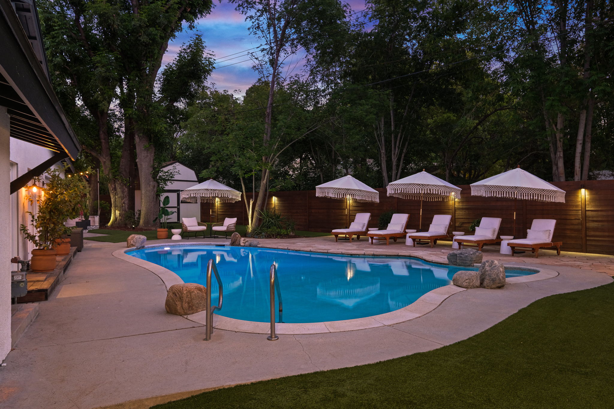 Set privately behind a gated driveway at the end of a quiet cul-de-sac street in the highly desirable Walnut Acres area, this stunning estate has been exquisitely renovated with designer finishes and the finest craftsmanship. This charming single-story home makes the most of its indoor/outdoor living spaces, boasting 4 large bedrooms and 3 fully updated bathrooms. A chef's kitchen featuring top-of-the-line appliances opens up to an adjacent living room, perfect for entertaining. The luxurious owner's suite comes replete with a walk-in closet as well as a spa-like bathroom with a large shower and soaking tub. The backyard features a saltwater swimming pool, enchanting dining and sitting areas, and a grassy yard with space to entertain. Superior smart home capabilities include Sonos, Lutron, a multi-access point wifi system, and smart thermostats. Included in the 3,804 total square feet is a 716 square foot converted garage space, separate from the main house, offers the perfect opportunity for a gym or home office. Additional attached 2-car garage complete this incredible property.