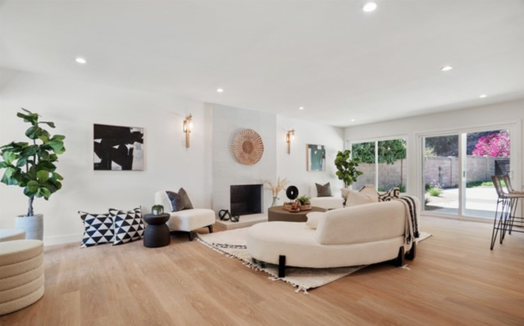 Exquisite remodel in this completely reimagined two story with a warm modern design perched up from a quiet tree lined street in the desirable Woodlands Hills area West of Valley Circle. Stunning new open layout beaming with light from every room. Massive new chef s kitchen, expanded primary suite, sweeping rear yard w/ pool and a plethora of new lavish features, including sleek flat panel cabinetry w/ quartz countertops, luxury wide plank flooring, top of line appliances and designer fixtures throughout. Well-appointed kitchen with views to the expansive backyard boasts top of the line stainless steel appliances, including a Fisher and Paykel 36 professional range, Kitchen Aid countertop-depth fridge and built-in micro, full height tile backsplash, floor-to-ceiling pantry, and multiple eat-in peninsula s w/ direct access to the forest-like rear yard. Entertain in the newly plastered pool w/ new pool heater. Formal dining room directly off the kitchen perfect for large gatherings. Exceptional 4 bed/ 3 bath layout highlighted by an enlarged primary suite containing a walk-in closet the most discerning buyer will appreciate. Vast number of upgrades were poured into this renovation including upgraded electrical and plumbing, high end lighting fixtures and Delta plumbing fixtures, and designer arranged tile throughout. Style and functionality radiate throughout from the multiple custom wood wall designs to the flowing open layout done w/ permits. New recessed lighting, updated HVAC, new wrought-iron staircase railings and pool equipment enclosure, dual pane windows, new gutters, new redwood gates, new doors, and beautiful new designer spec features in every area of this house. Award winning schools and a serene location.