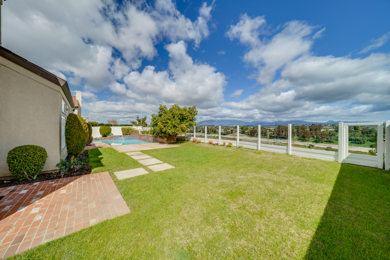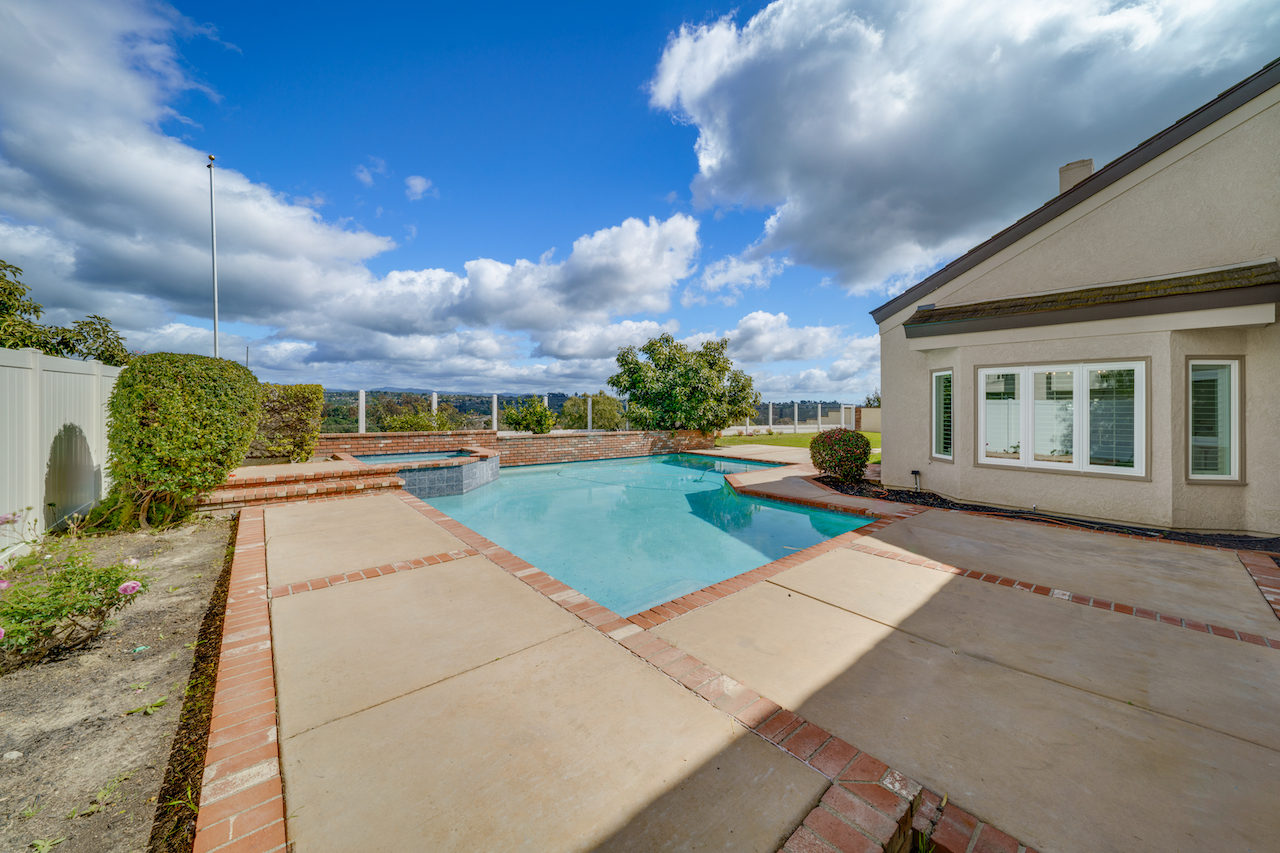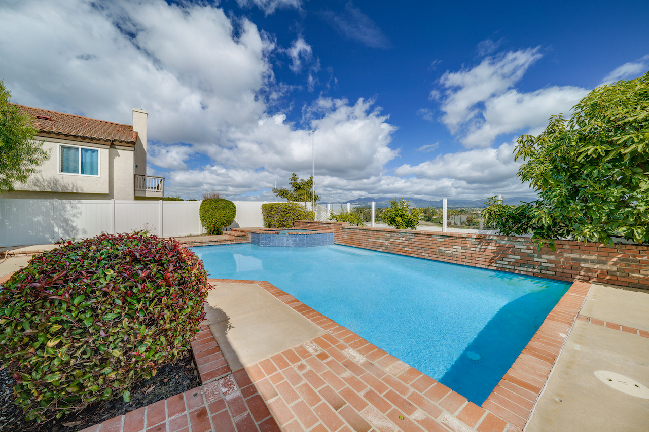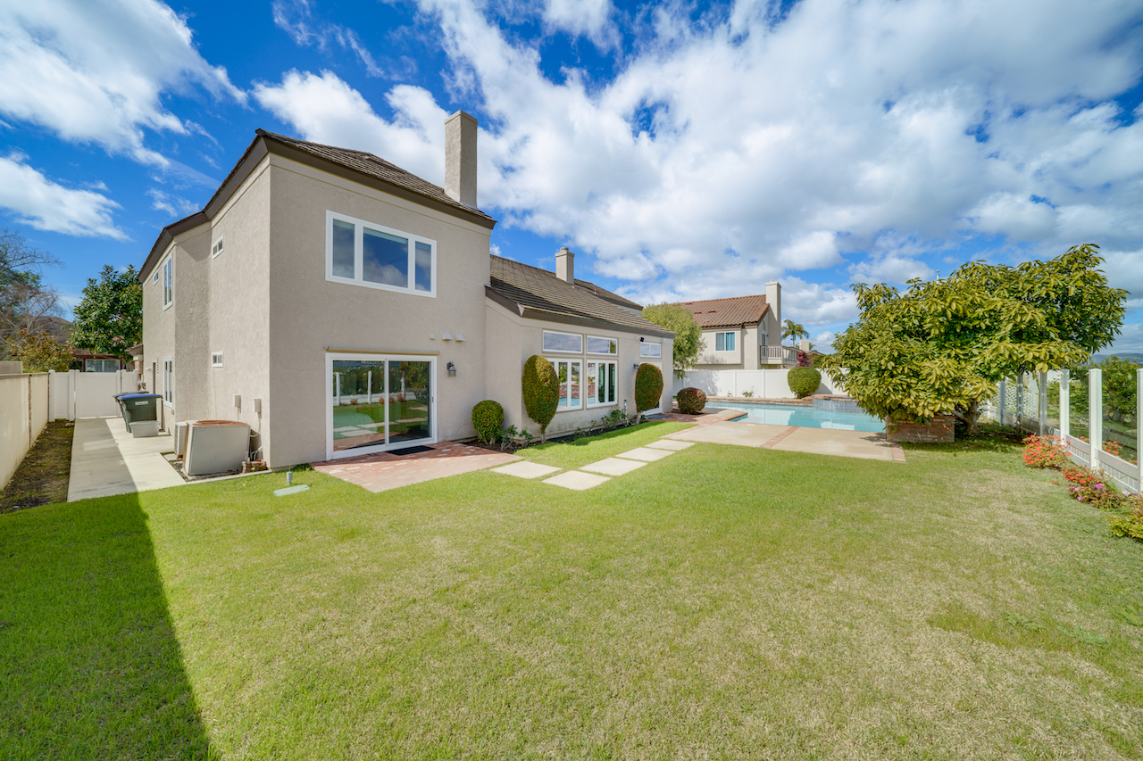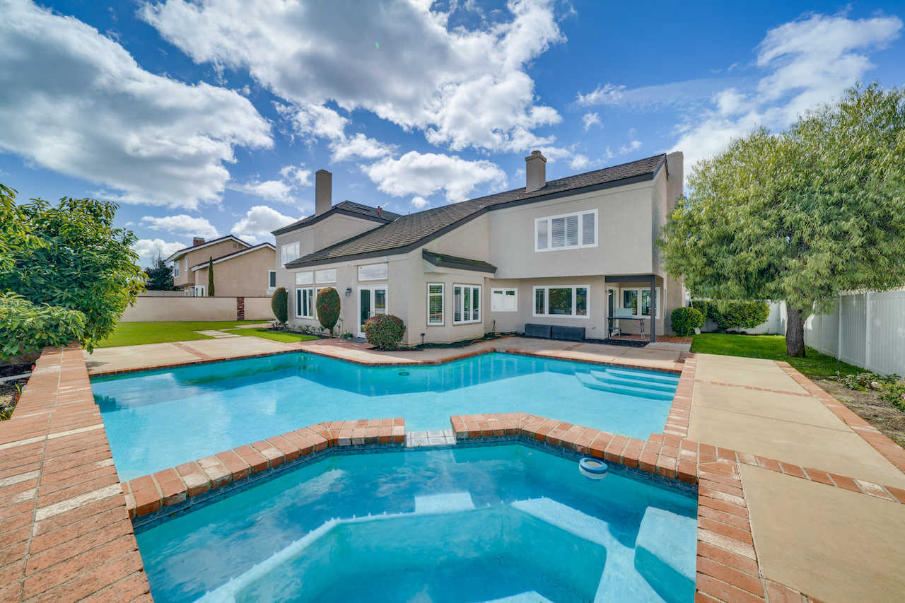 Immerse yourself in luxury at this exquisite residence in the esteemed Nellie Gail Ranch community of Laguna Hills. Meticulously updated, this home seamlessly blends elegance with contemporary comforts. Upon entry through a marble-tiled foyer, revel in the light-filled, open floor plan adorned with low-E, double-paned, tempered glass windows and doors. The state-of-the-art chef's kitchen boasts sleek quartz countertops, a central island, modern white cabinets with chic hardware, and brand-new stainless steel appliances. Flowing effortlessly into the dining and family room areas, the kitchen creates a welcoming living space anchored by a newly revamped fireplace. The ground level encompasses expansive living and dining rooms with soaring two-story ceilings, a convenient downstairs bedroom with an en-suite bathroom, and a dedicated home office. Upstairs, the sunlit primary suite features a spacious walk-in closet and a fully renovated bathroom with brushed marble floors, a custom frameless glass shower, a standalone soaking tub, and new vanities with Carrara marble countertops. Additional living areas include a generous bonus room, a junior suite with a private bathroom, and two bedrooms sharing a full bathroom. Outdoor entertainment is a delight with a newly replastered pool and spa, lush greenery, concrete decking, in-ground irrigation, and captivating views. Thoughtfully updated for comfort and tranquility, this home boasts a new roof, copper piping, elegant lighting fixtures, luxury vinyl flooring, recessed lights, custom cabinetry, smart home features, and fresh paint throughout. Experience the epitome of luxury living in a peaceful setting.