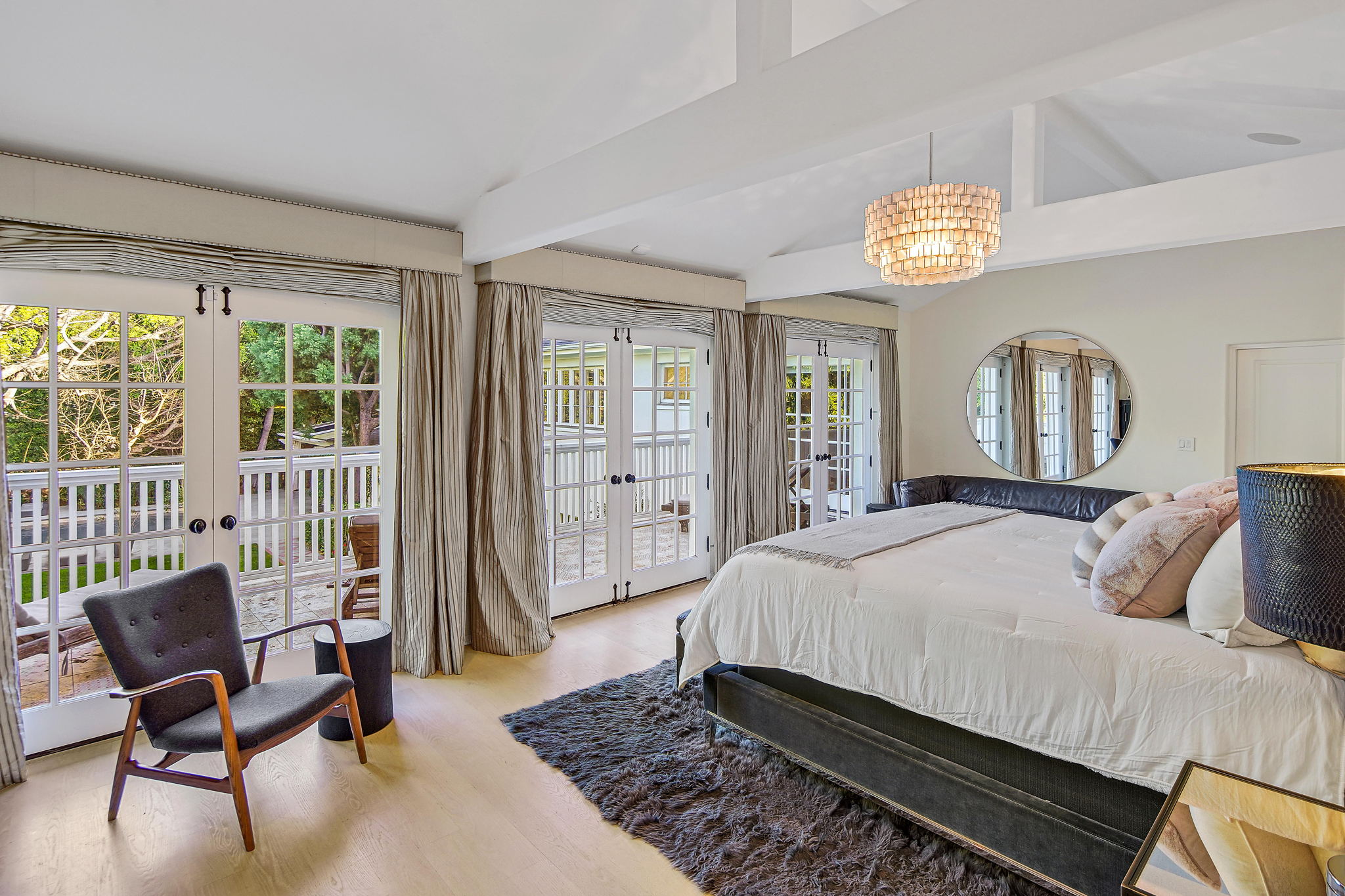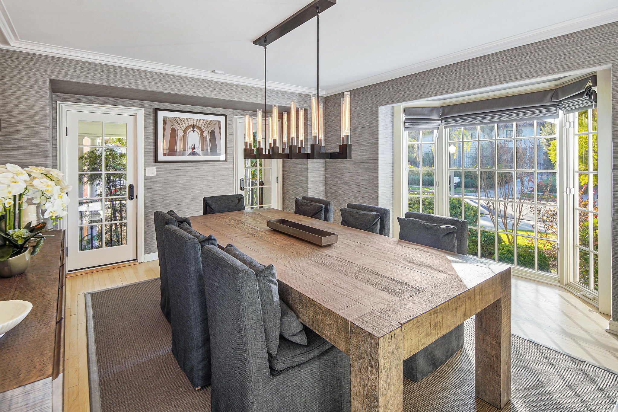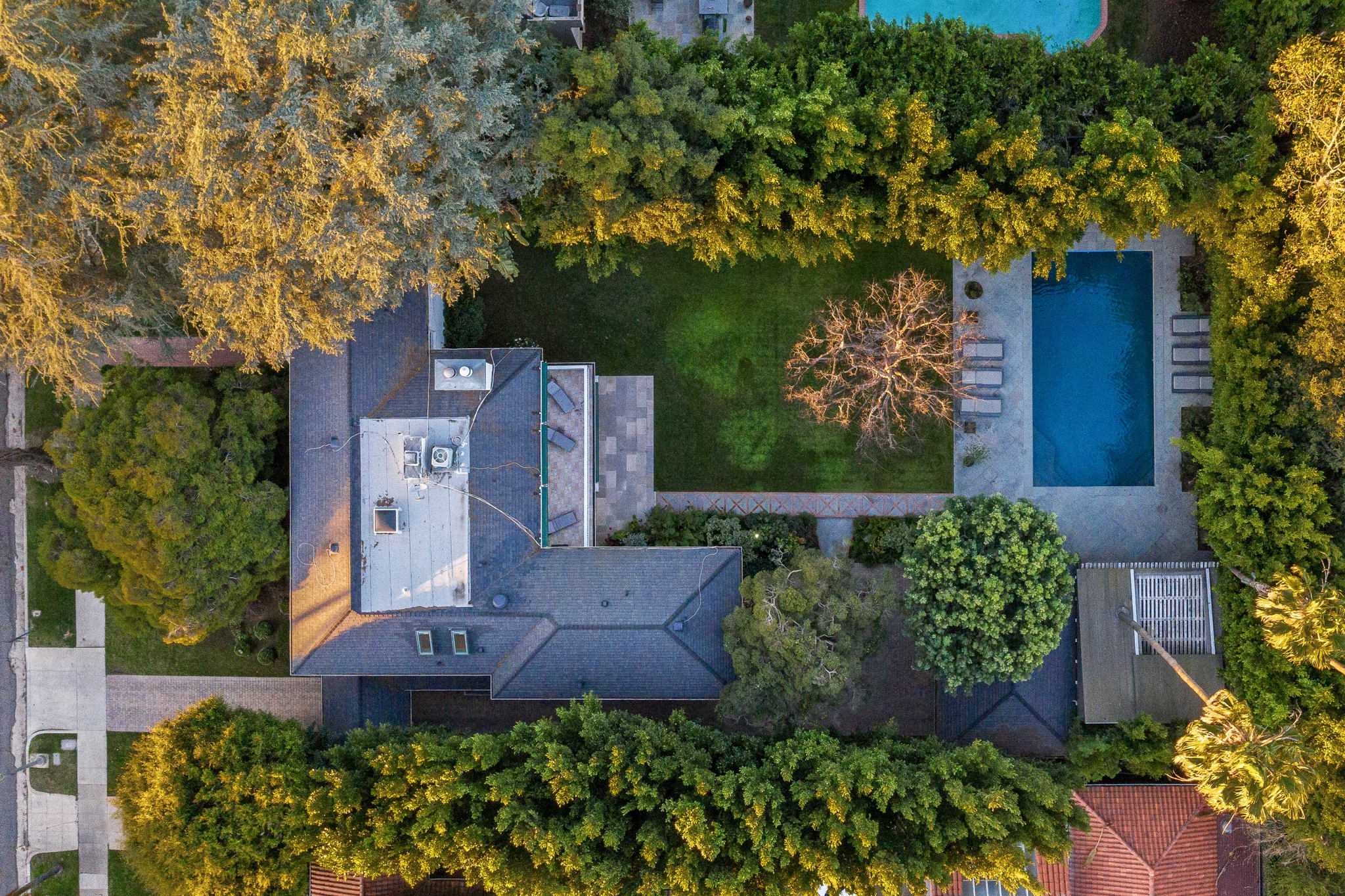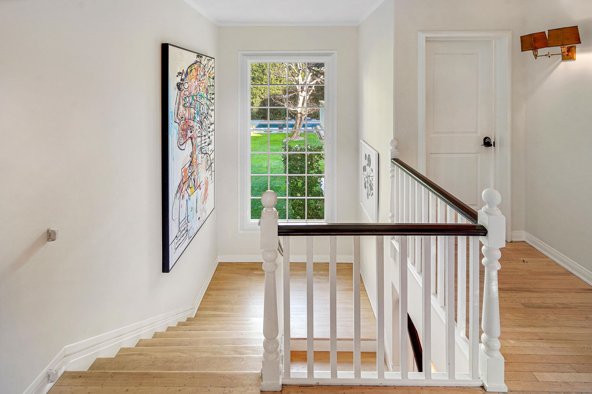 Centrally located on a tree-lined street in Hancock Park, this stunning 6 bed and 6 bath home sits on close to half an acre of flat land. Lounge and entertain in the outdoor gazebo or enjoy the spacious pool and hot tub in the serene, grassy backyard. Downstairs includes both a formal and informal living room, each featuring fireplaces and large glass french doors to let in ample light. The bright kitchen has a central island with white quartz countertops, new Viking range oven, and separate eating area. One bedroom and two bathrooms, a formal dining room, and the laundry area complete the downstairs. Five bedrooms upstairs include the primary suite with a balcony overlooking the peaceful backyard, fireplace, large walk-in closet, and modern bathroom with soaking tub and walk-in shower. Fully-automated smart home. Detached three-car garage with long gated driveway.