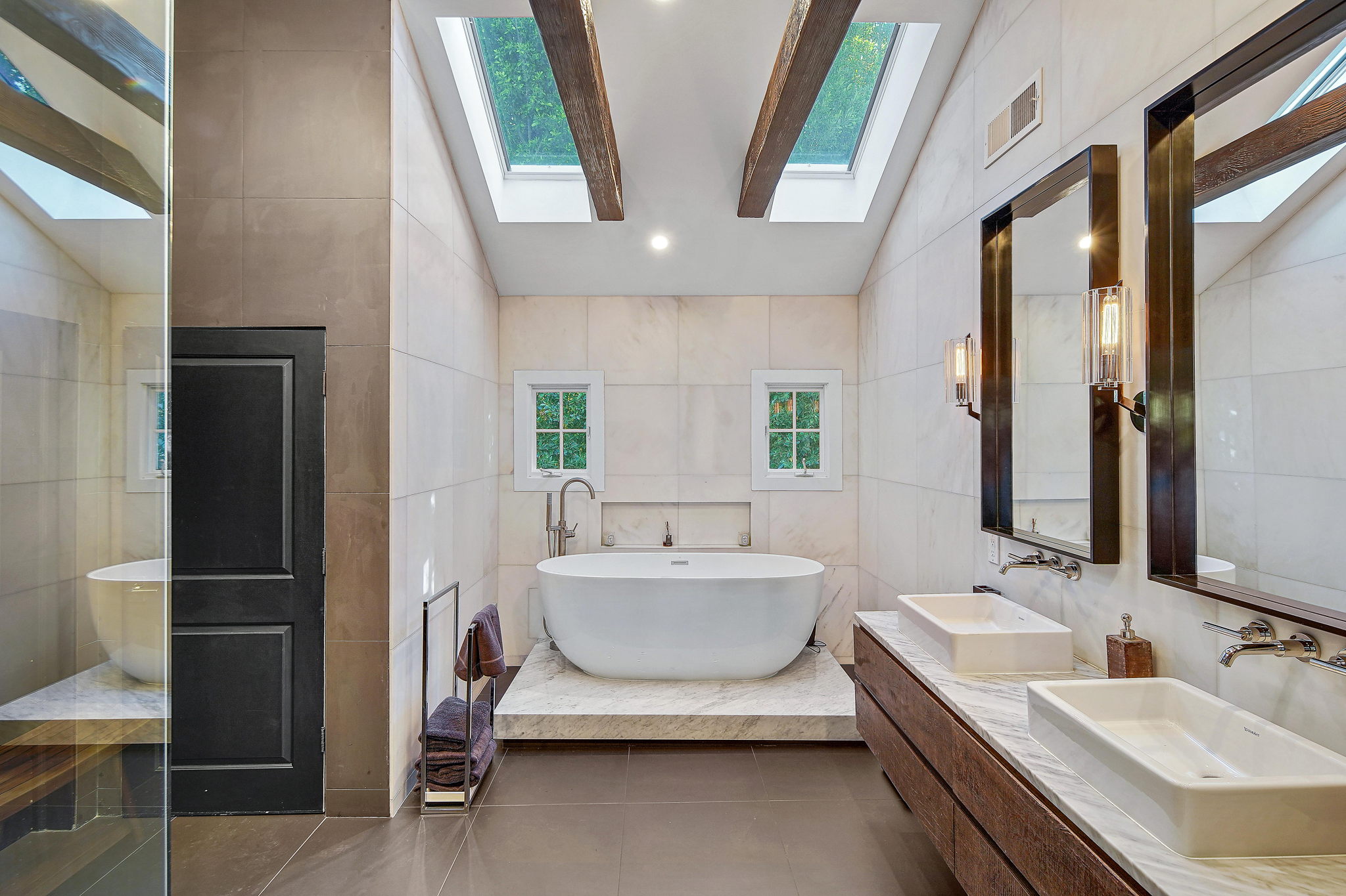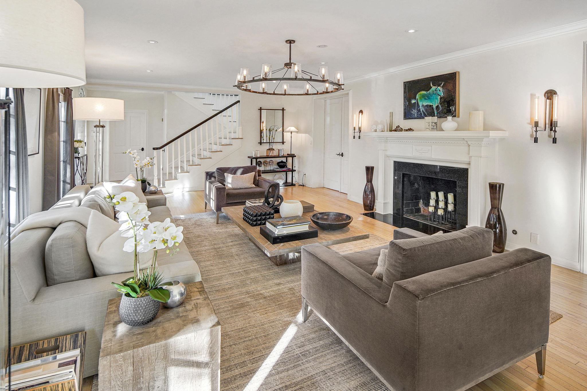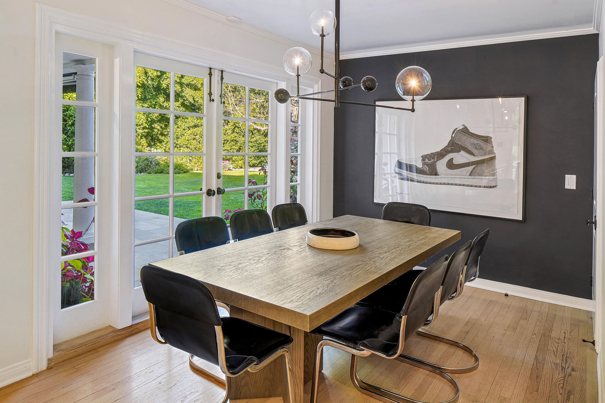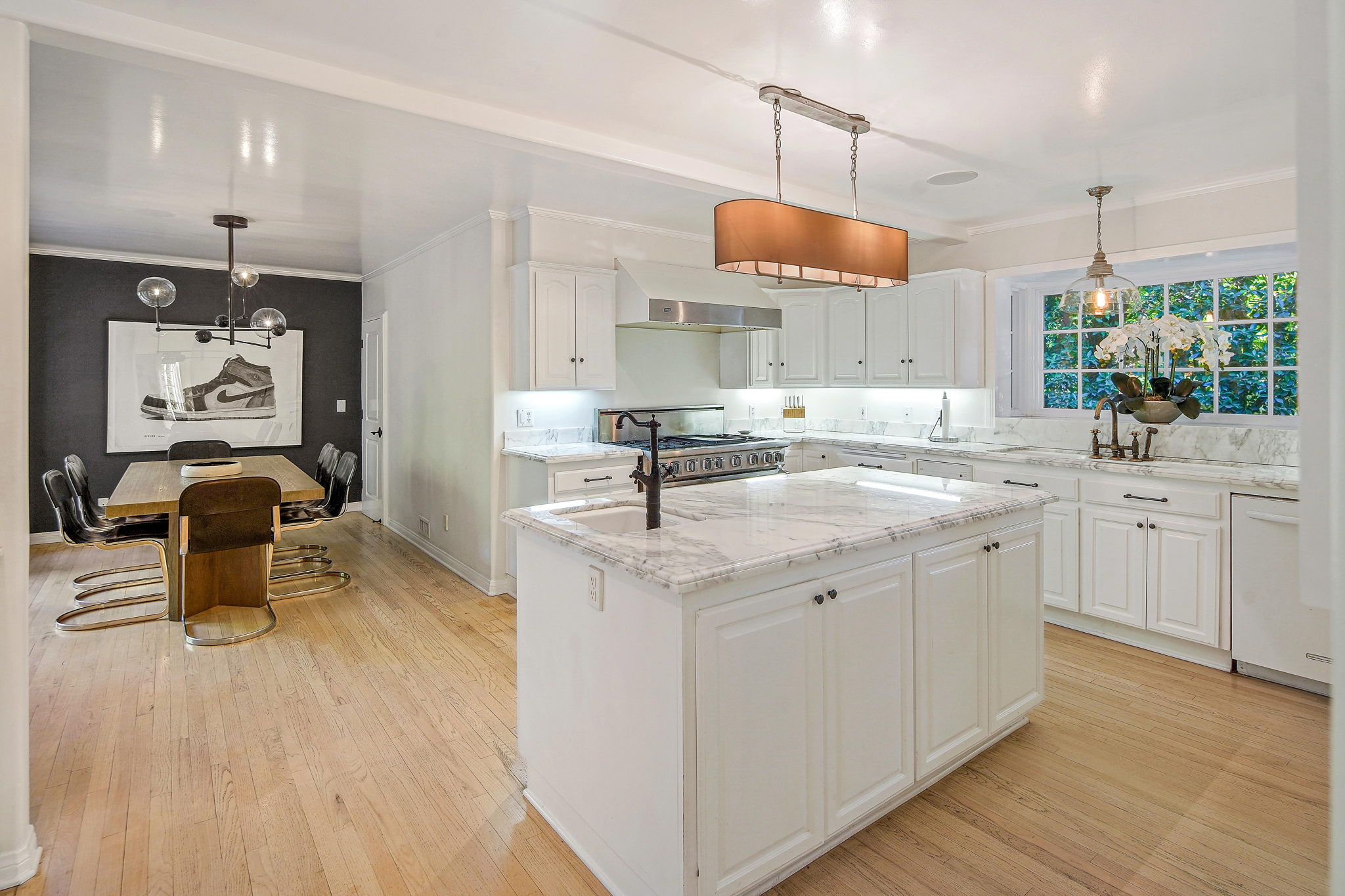 Centrally located on a tree-lined street in Hancock Park, this stunning 6 bed and 6 bath home sits on close to half an acre of flat land. Lounge and entertain in the outdoor gazebo or enjoy the spacious pool and hot tub in the serene, grassy backyard. Downstairs includes both a formal and informal living room, each featuring fireplaces and large glass french doors to let in ample light. The bright kitchen has a central island with white quartz countertops, new Viking range oven, and separate eating area. One bedroom and two bathrooms, a formal dining room, and the laundry area complete the downstairs. Five bedrooms upstairs include the primary suite with a balcony overlooking the peaceful backyard, fireplace, large walk-in closet, and modern bathroom with soaking tub and walk-in shower. Fully-automated smart home. Detached three-car garage with long gated driveway.