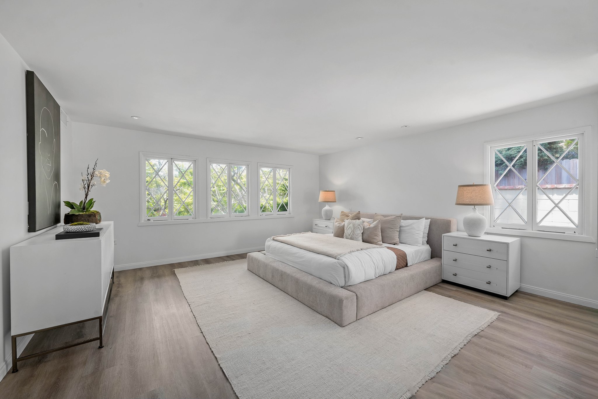 As you step inside, the seamless open-concept layout guides you through a thoughtfully remodeled interior that showcases stunning, custom built-ins providing ample storage solutions throughout the home. The four built-ins from San Diego’s acclaimed Design Studio West are one-of-a kind creations that beautifully enhance the space.