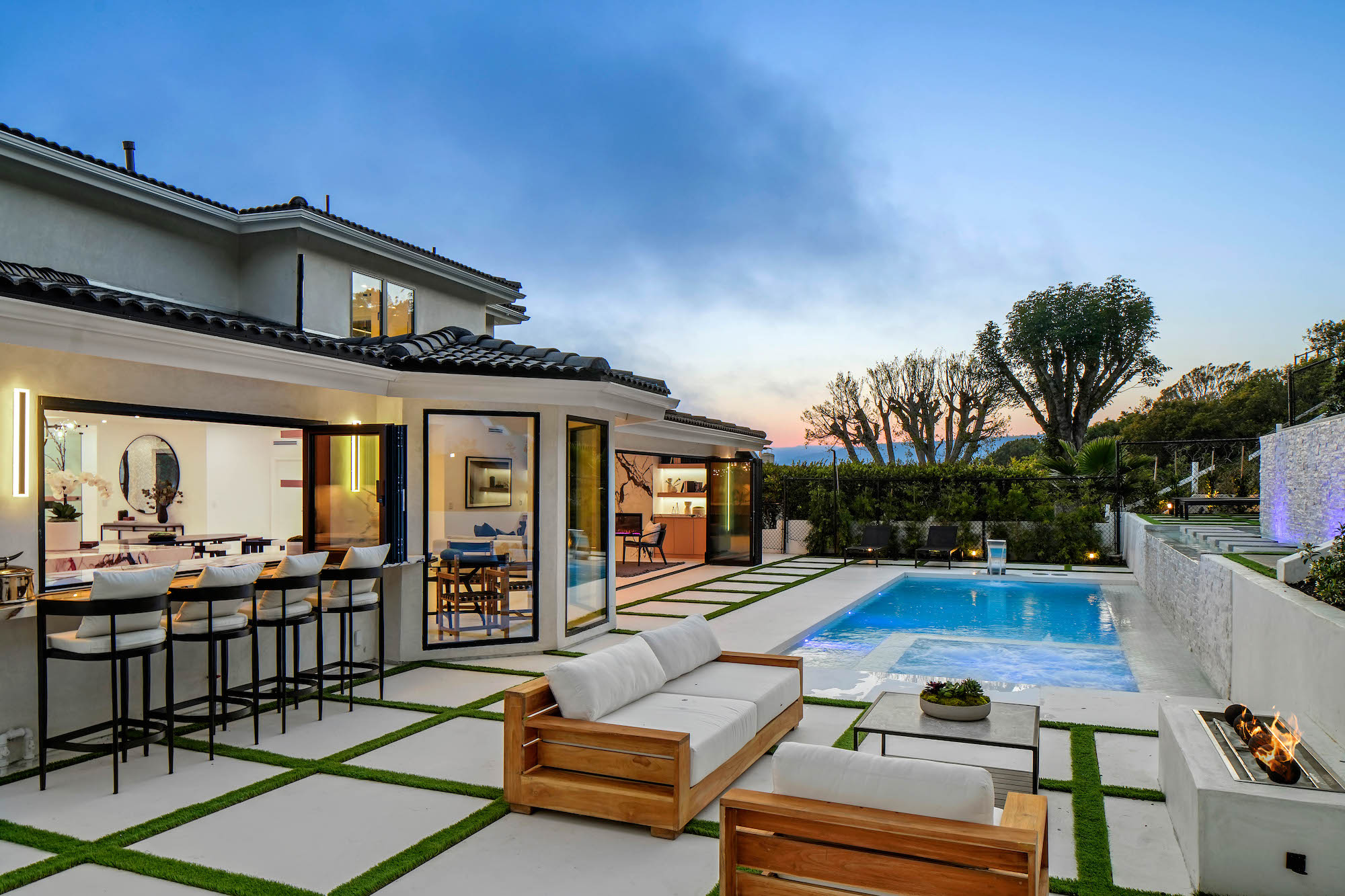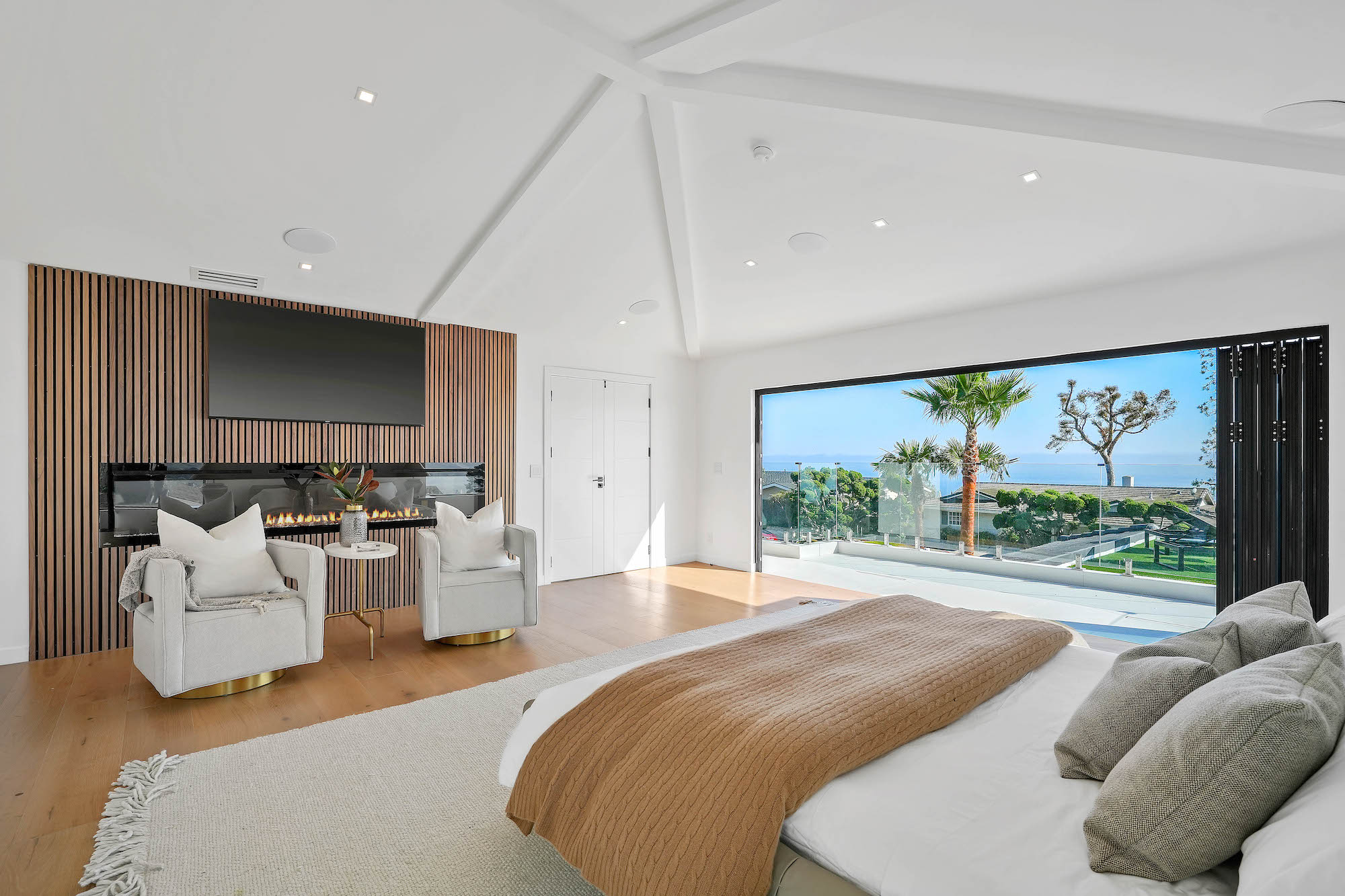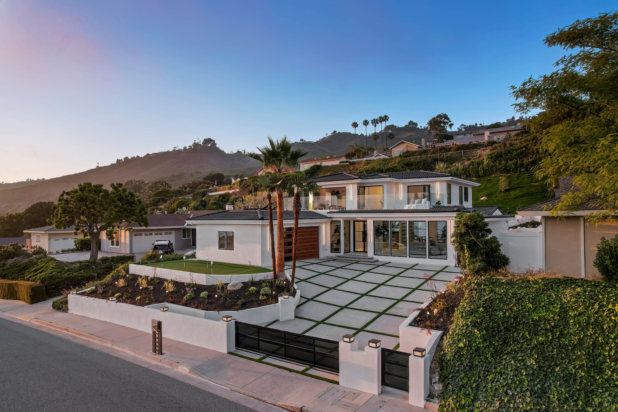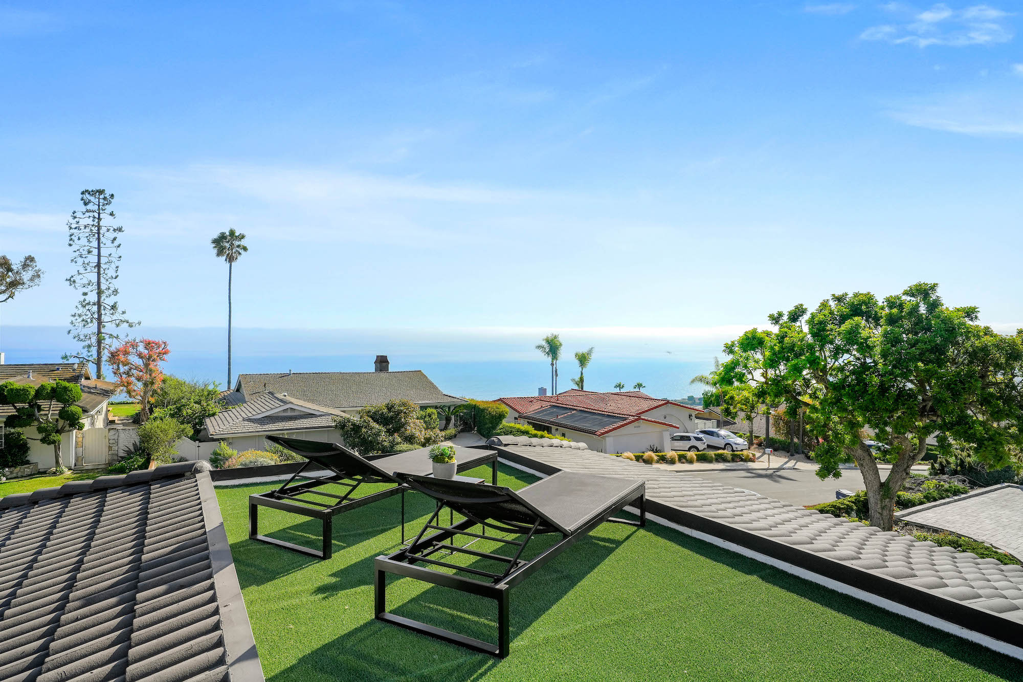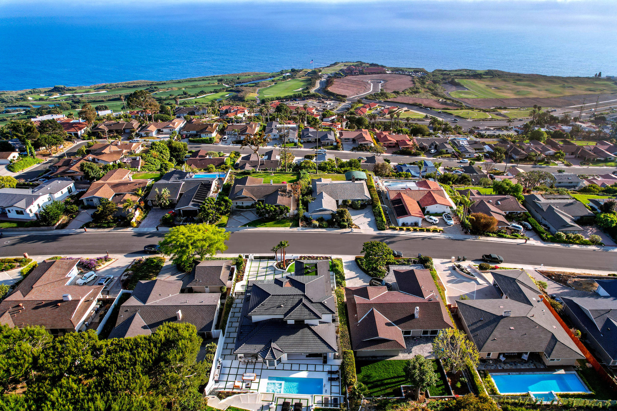 The most exquisitely designed and meticulously crafted home with expansive views of the ocean, right across from Trump National Golf course. A truly unique contemporary home in Palos Verdes with an open floor plan and an abundance of natural light. Enter into a spacious Great Room with vaulted beamed ceilings, beautiful Italian porcelain tile flooring, a custom designed Gourmet Snaidro Kitchen with new-line Thermador appliances, an impressive floating steel/wood staircase, and ambient LED lighting base boards. The main level features 3 en-suite guest bedrooms plus a stunning home office, a beautiful wine cellar, and wet bar. Upstairs, the spacious Primary Suite awaits complete with a fireplace, lavish spa-like bath, and dual walk-in closets. An additional spacious en-suite guest bedroom is also upstairs with a huge balcony to enjoy the panoramic ocean views. Outside, the private entertainer's backyard is replete with a newly built pool and spa, new landscaping, full outdoor kitchen and bar, fire pit, and built-in pizza oven. 2-car garage lined with storage and epoxy flooring, with room for an additional 10 cars in the front yard and side of the house. This truly smart home seamlessly integrates technology and comfort, offering an immersive experience and peace of mind with its sophisticated security system controlled via phone, and an expansive built-in speaker system and advanced smart lighting in every room, extending to the backyard. Experience the pinnacle of modern living in this luxurious Californian property. This one has it all!