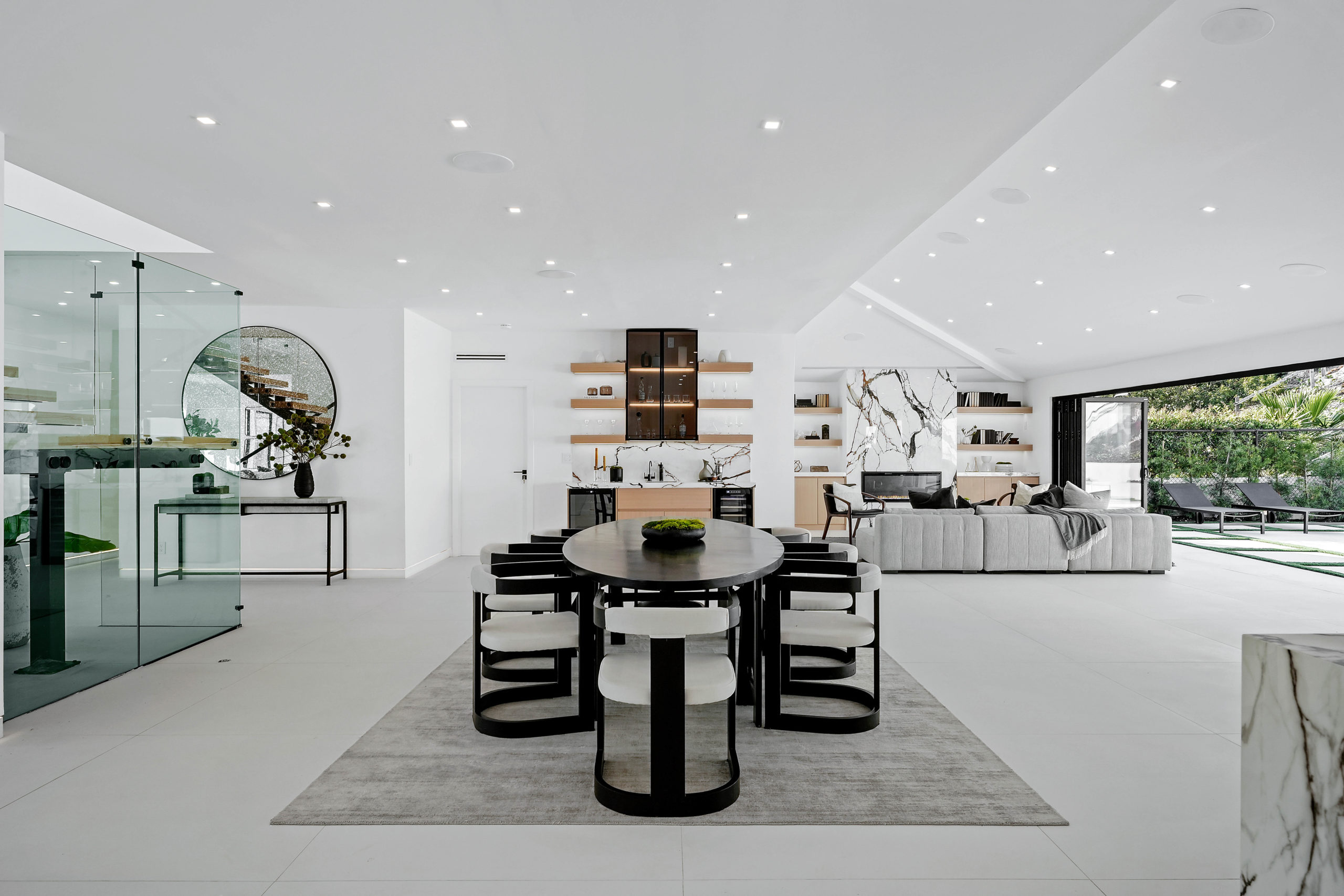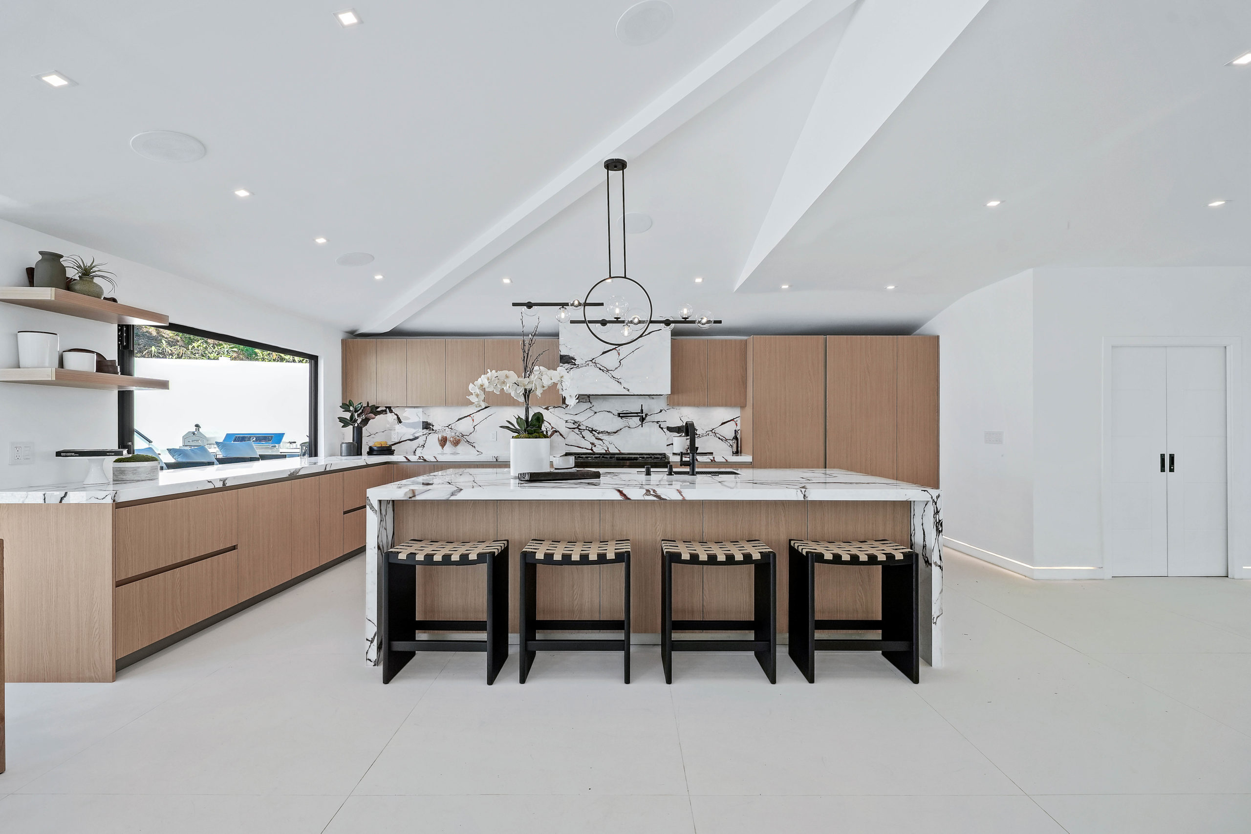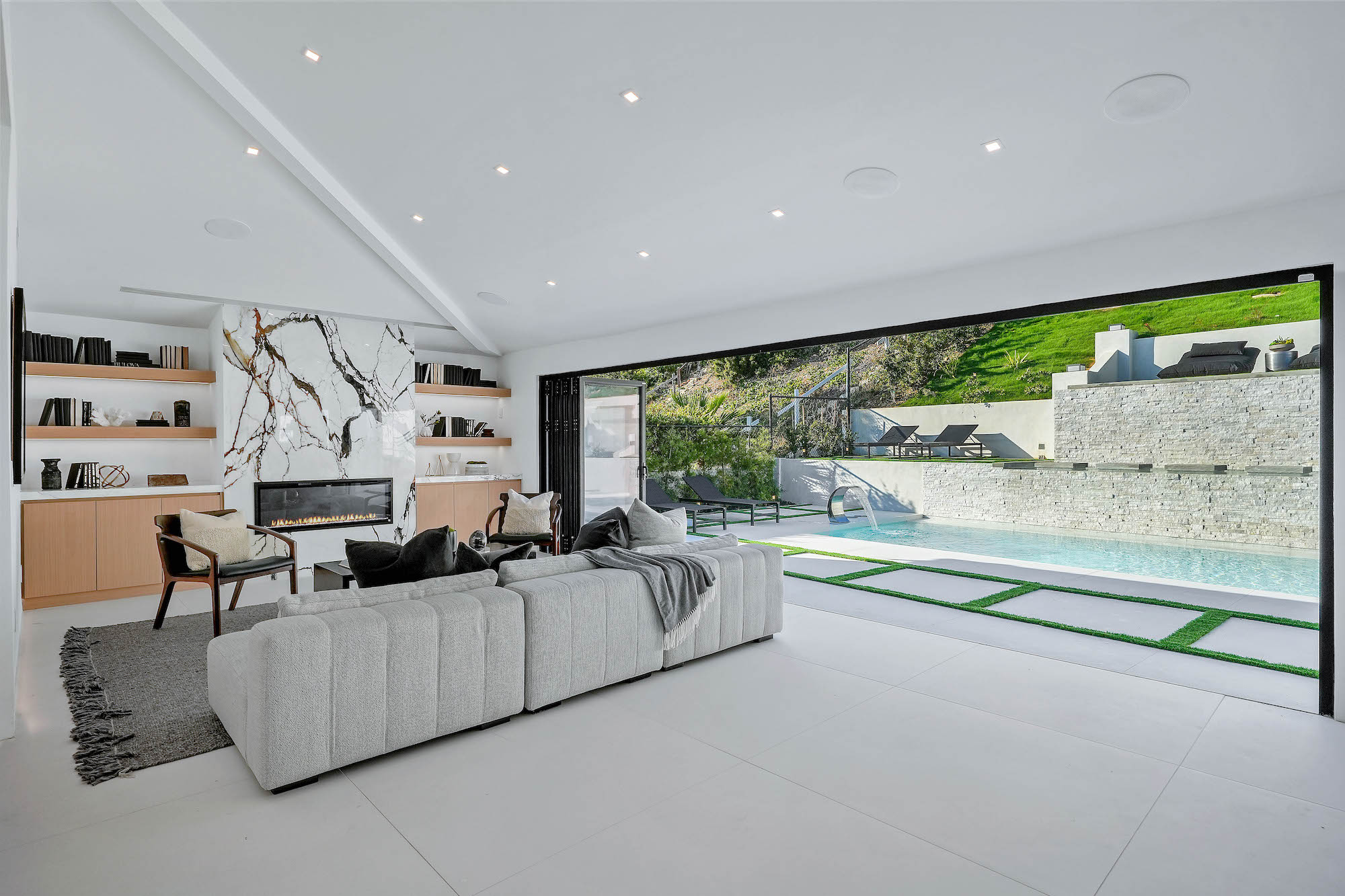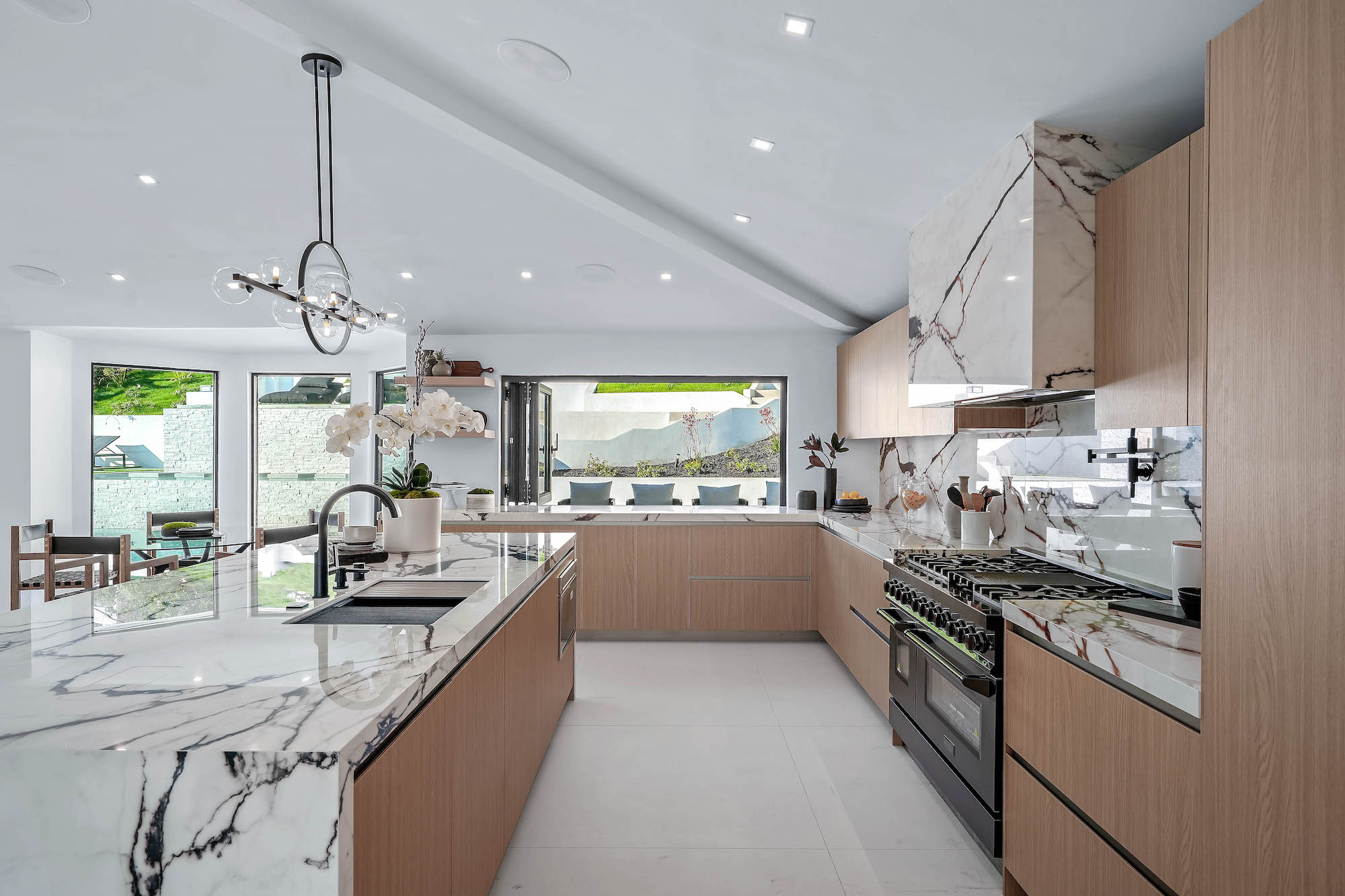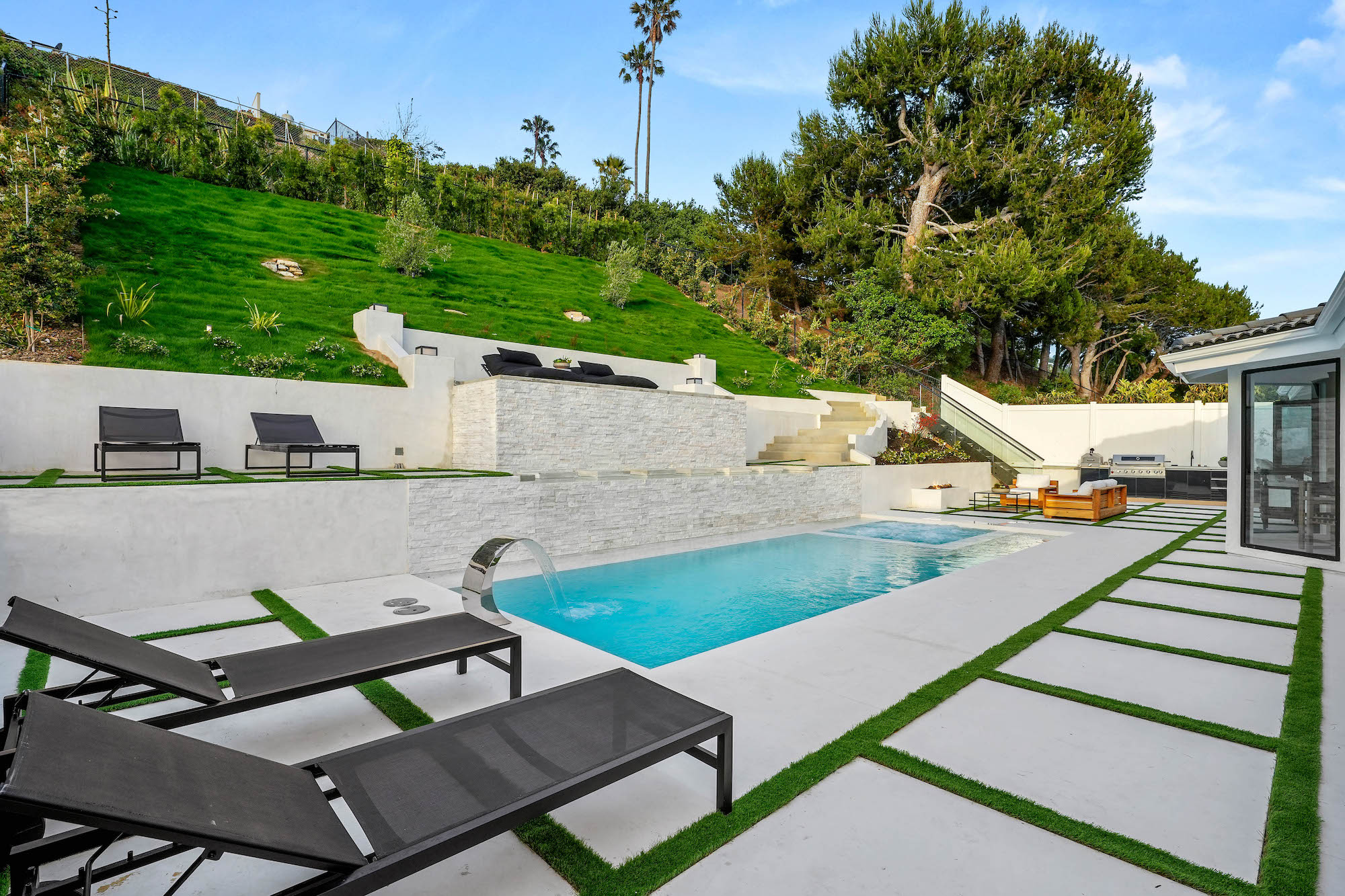 The most exquisitely designed and meticulously crafted home with expansive views of the ocean, right across from Trump National Golf course. A truly unique contemporary home in Palos Verdes with an open floor plan and an abundance of natural light. Enter into a spacious Great Room with vaulted beamed ceilings, beautiful Italian porcelain tile flooring, a custom designed Gourmet Snaidro Kitchen with new-line Thermador appliances, an impressive floating steel/wood staircase, and ambient LED lighting base boards. The main level features 3 en-suite guest bedrooms plus a stunning home office, a beautiful wine cellar, and wet bar. Upstairs, the spacious Primary Suite awaits complete with a fireplace, lavish spa-like bath, and dual walk-in closets. An additional spacious en-suite guest bedroom is also upstairs with a huge balcony to enjoy the panoramic ocean views. Outside, the private entertainer's backyard is replete with a newly built pool and spa, new landscaping, full outdoor kitchen and bar, fire pit, and built-in pizza oven. 2-car garage lined with storage and epoxy flooring, with room for an additional 10 cars in the front yard and side of the house. This truly smart home seamlessly integrates technology and comfort, offering an immersive experience and peace of mind with its sophisticated security system controlled via phone, and an expansive built-in speaker system and advanced smart lighting in every room, extending to the backyard. Experience the pinnacle of modern living in this luxurious Californian property. This one has it all!