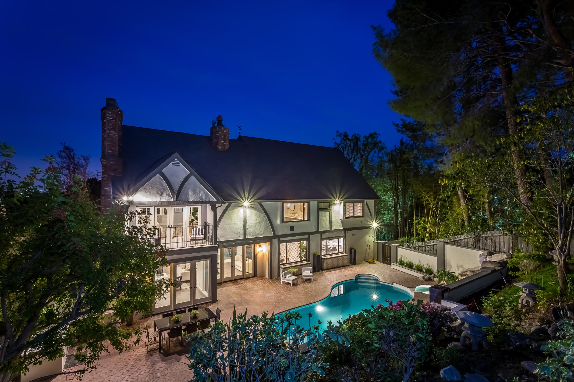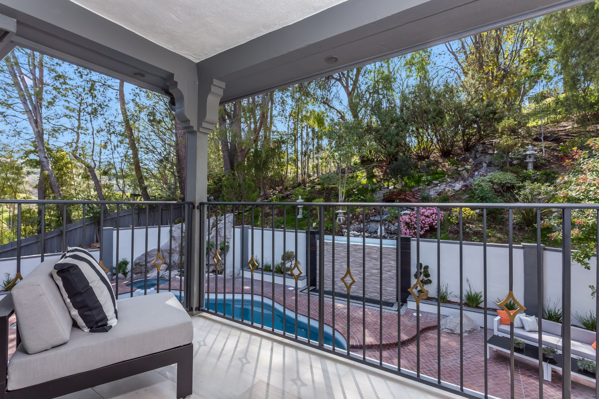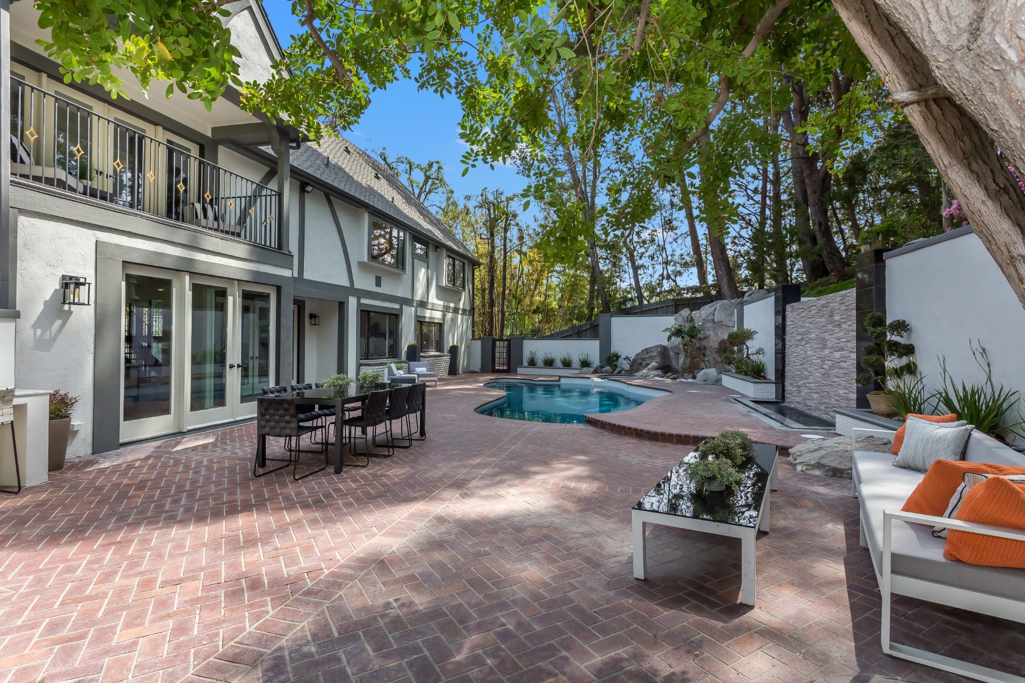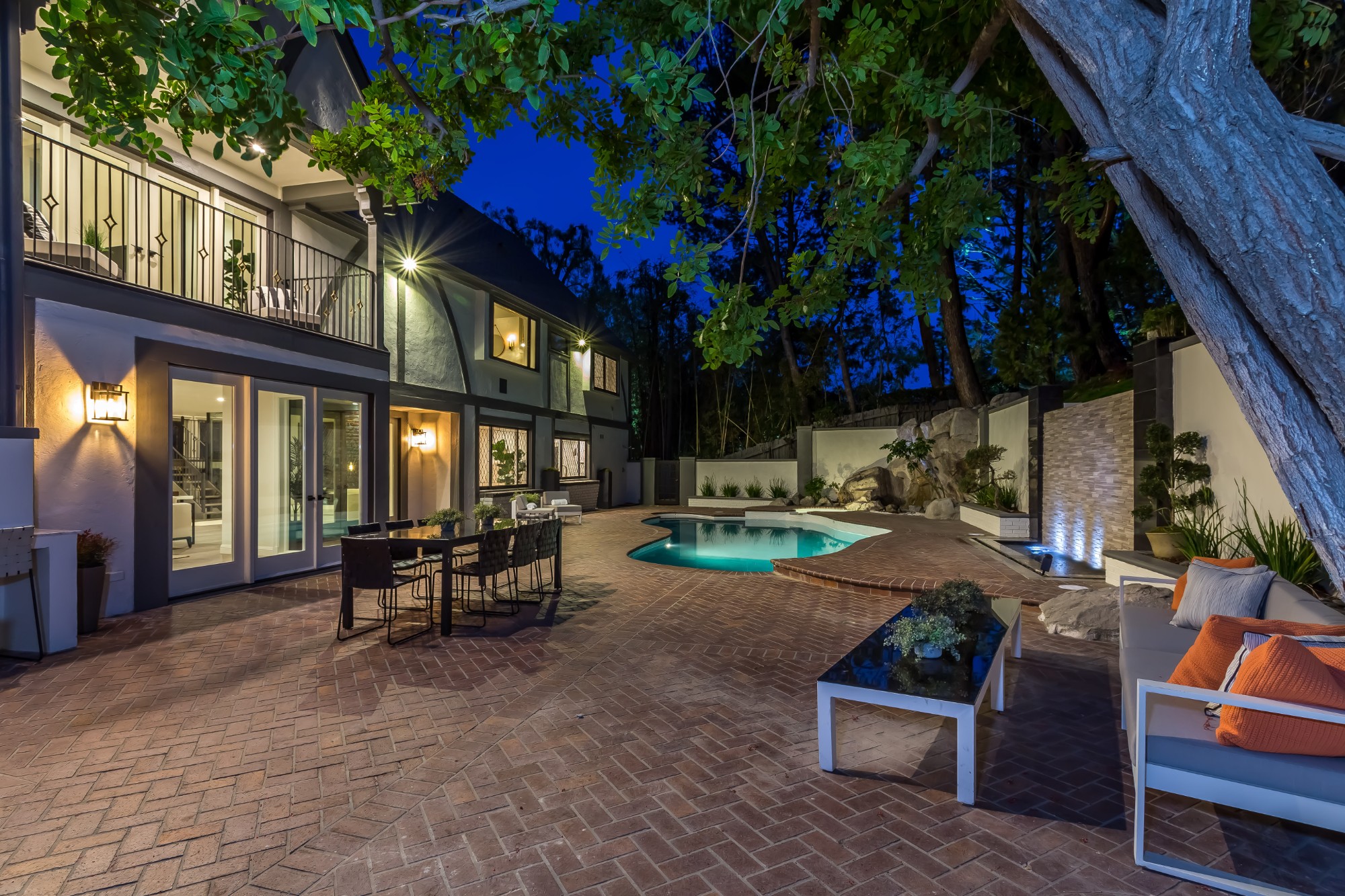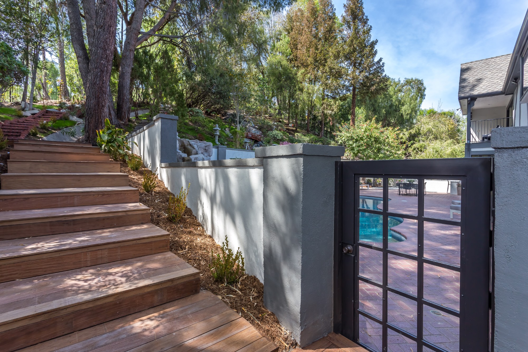 A beautifully remodeled designer residence in coveted Clark Gable Estates, set at the end of a quiet cul-de-sac behind private gates. Boasting greenbelt views, a shared tennis court and large grass field, elevator, sauna, pool, spa, outdoor barbecue area, Japanese garden with multiple water features, movie theater, wine room, and 3-car garage. Smart home technology includes Lutron, Sonos and Alexa. Private overnight neighborhood security officer with patrol car. Award-winning local public elementary school - Lanai Road.