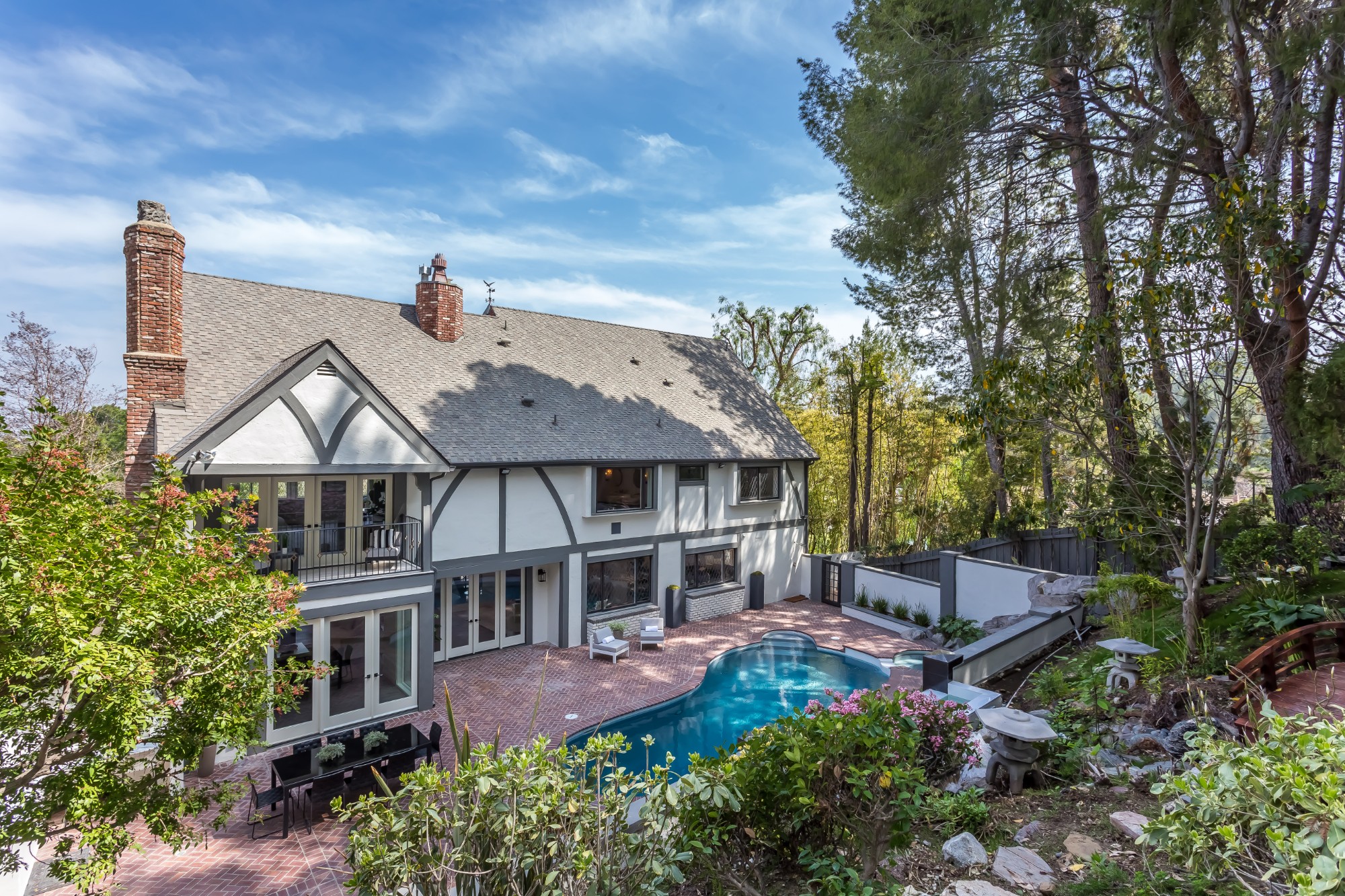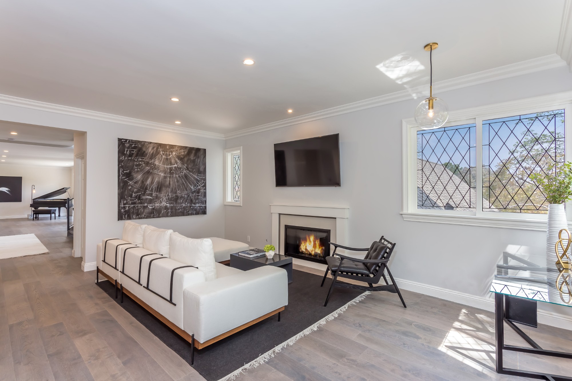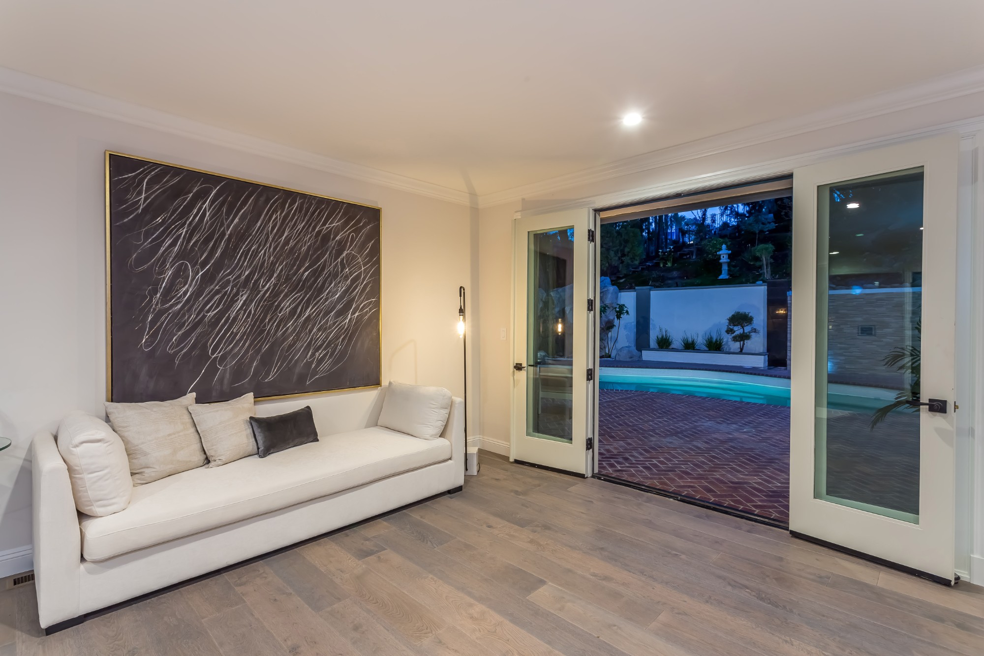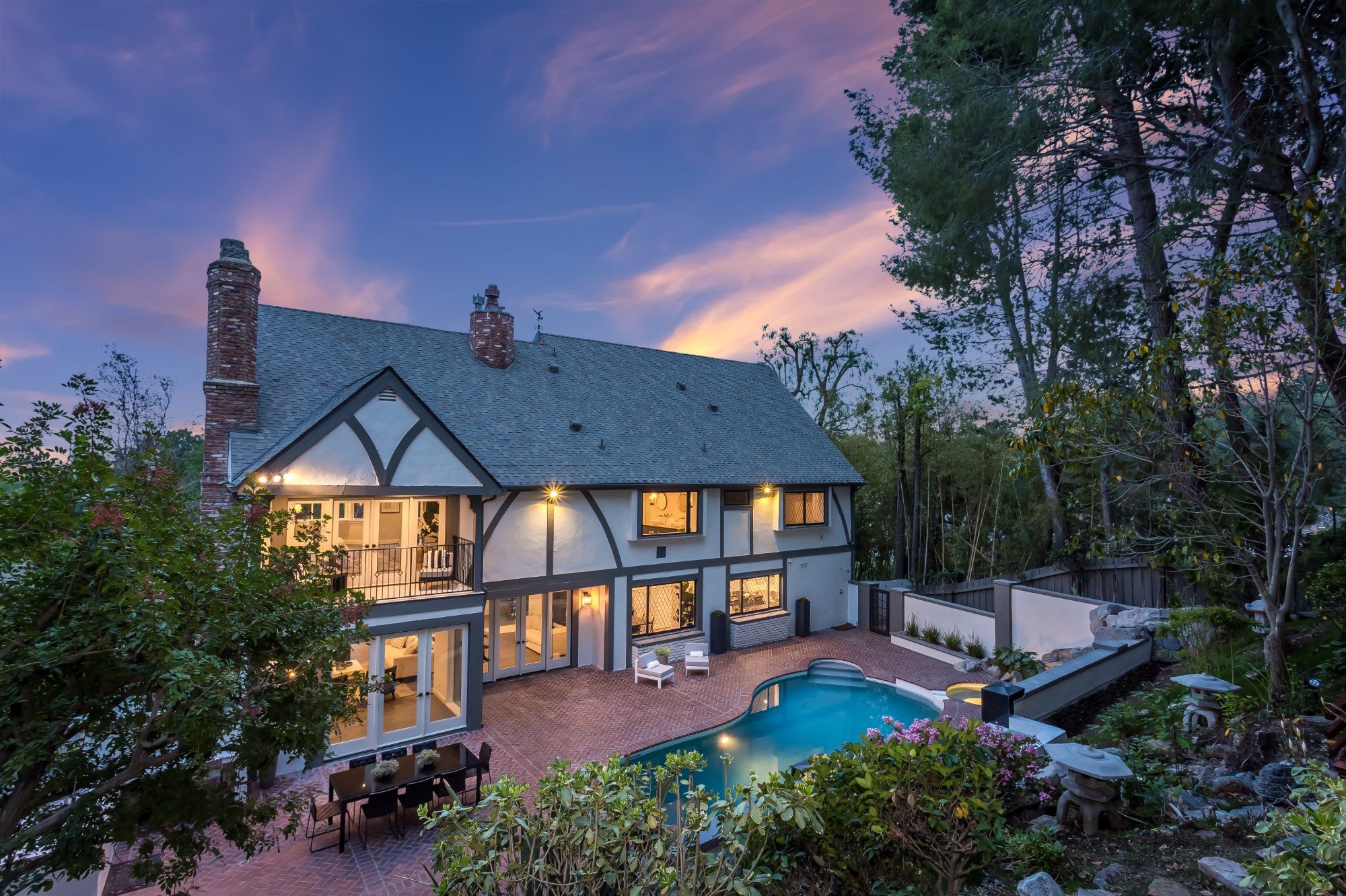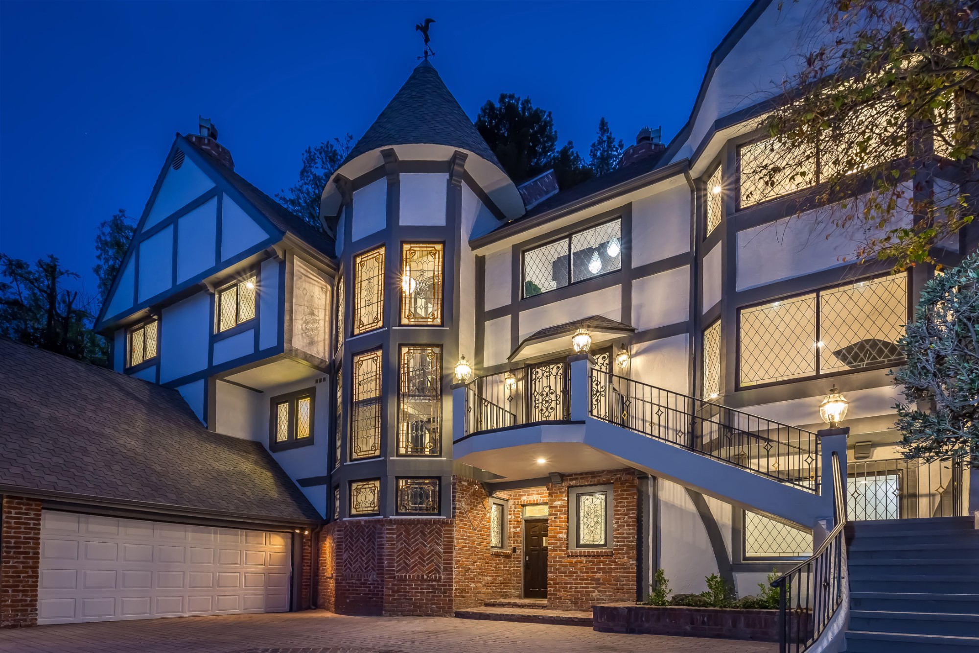 A beautifully remodeled designer residence in coveted Clark Gable Estates, set at the end of a quiet cul-de-sac behind private gates. Boasting greenbelt views, a shared tennis court and large grass field, elevator, sauna, pool, spa, outdoor barbecue area, Japanese garden with multiple water features, movie theater, wine room, and 3-car garage. Smart home technology includes Lutron, Sonos and Alexa. Private overnight neighborhood security officer with patrol car. Award-winning local public elementary school - Lanai Road.