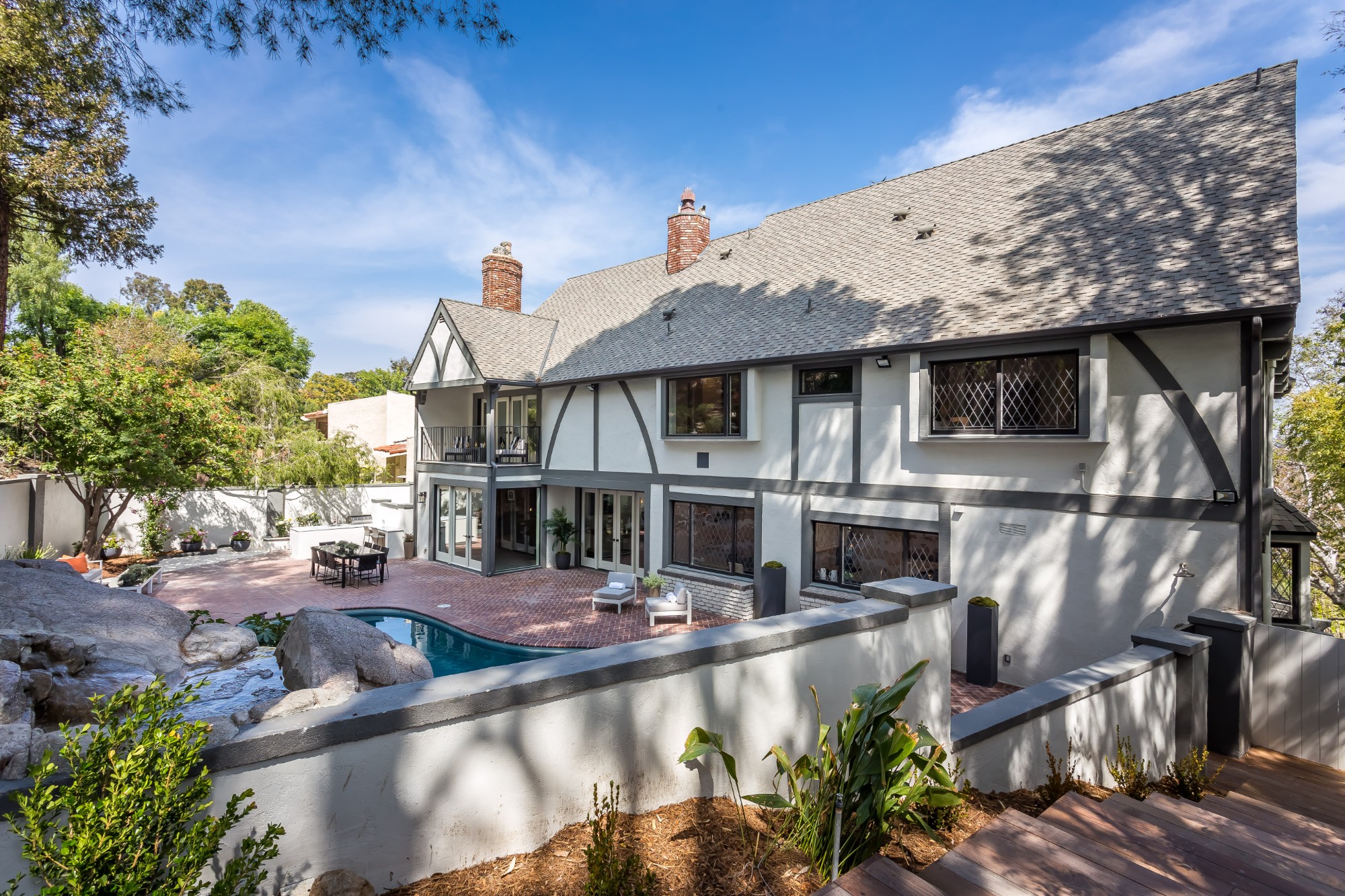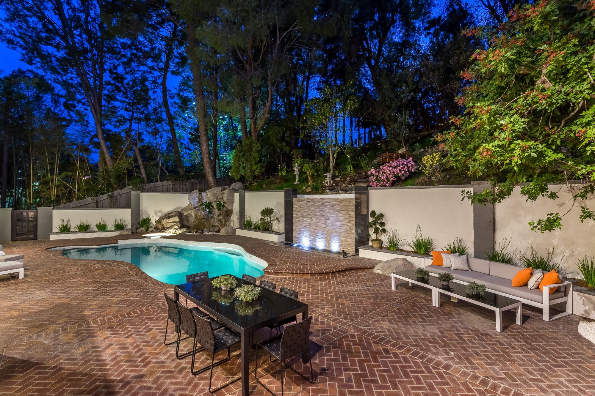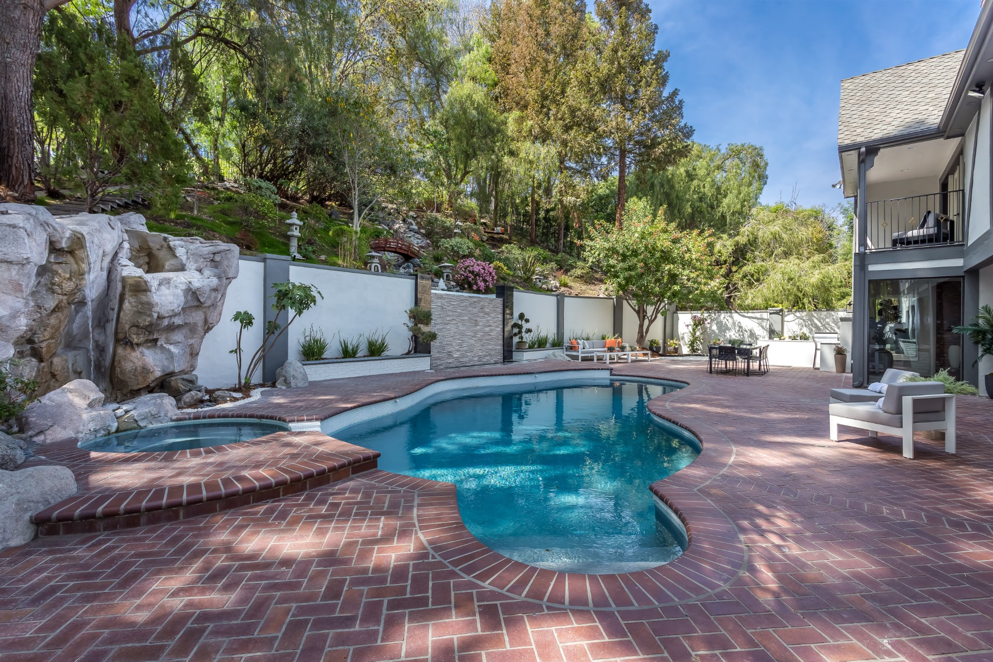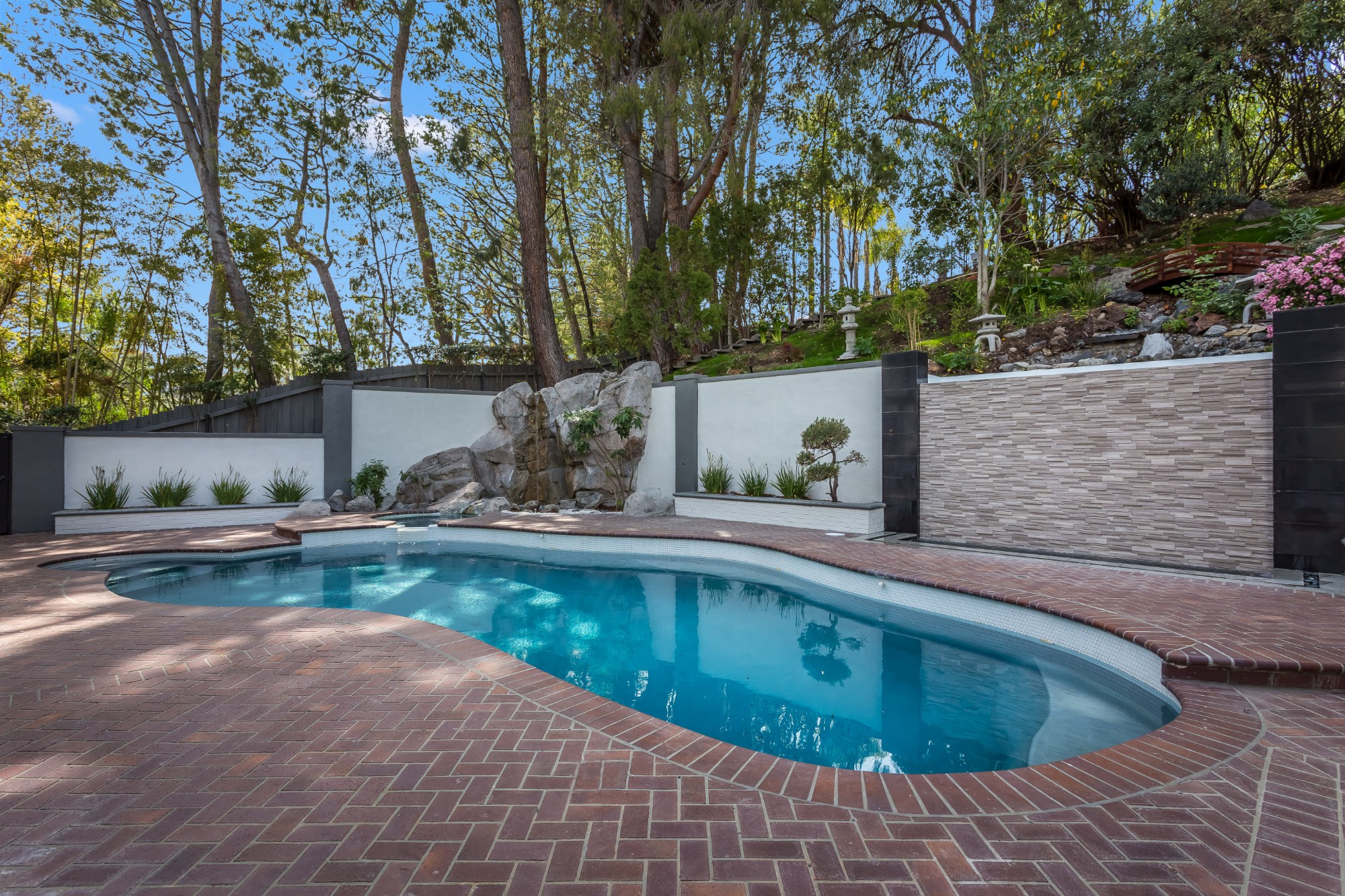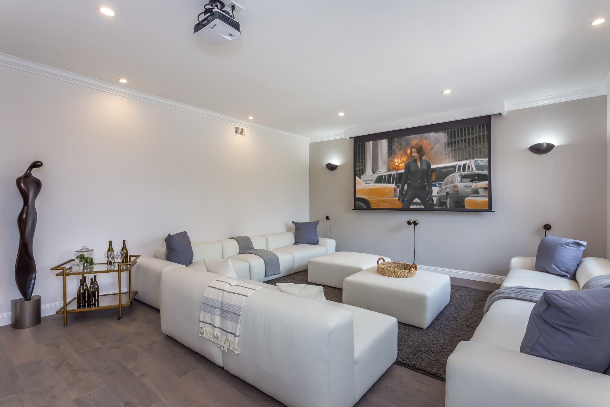 A beautifully remodeled designer residence in coveted Clark Gable Estates, set at the end of a quiet cul-de-sac behind private gates. Boasting greenbelt views, a shared tennis court and large grass field, elevator, sauna, pool, spa, outdoor barbecue area, Japanese garden with multiple water features, movie theater, wine room, and 3-car garage. Smart home technology includes Lutron, Sonos and Alexa. Private overnight neighborhood security officer with patrol car. Award-winning local public elementary school - Lanai Road.