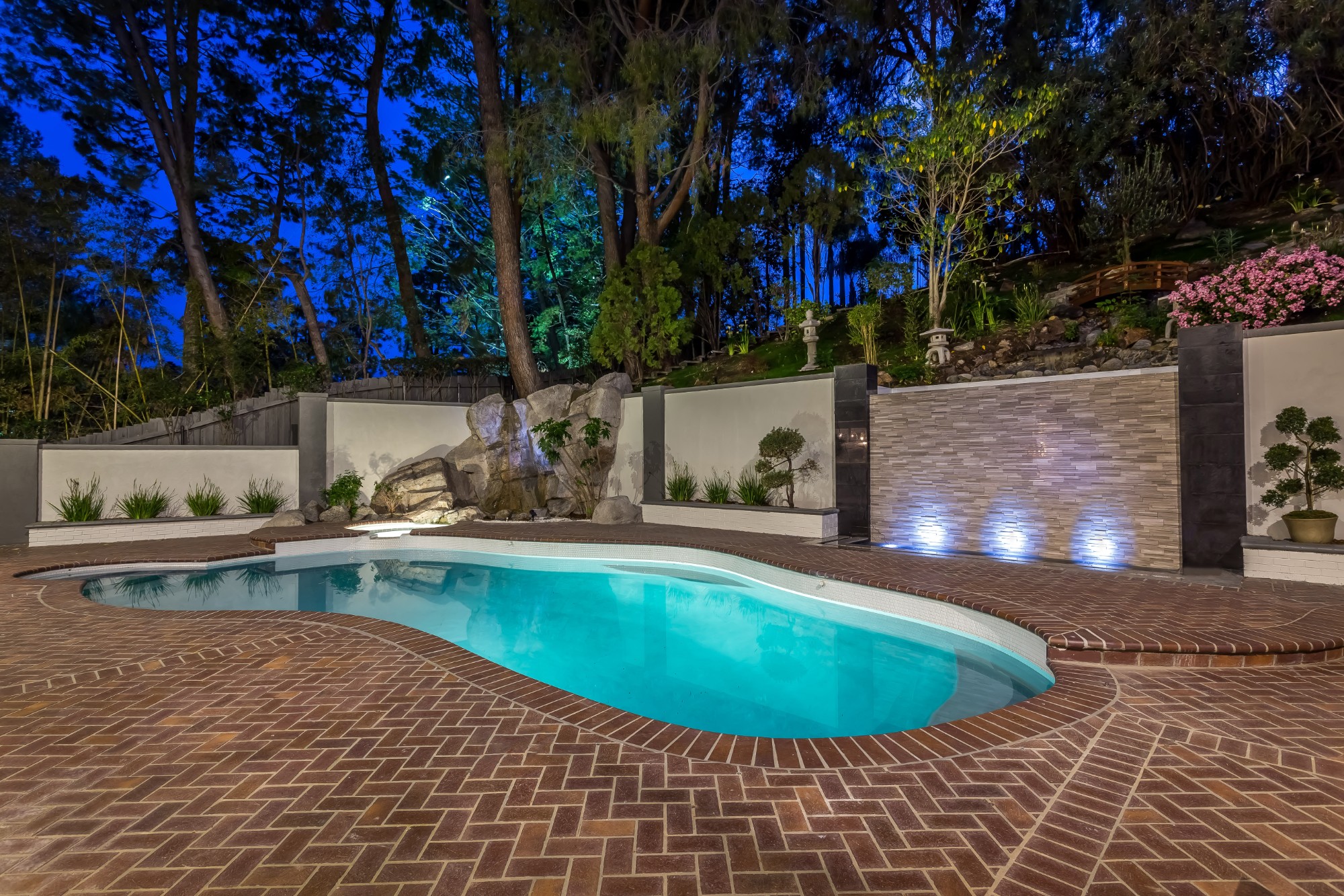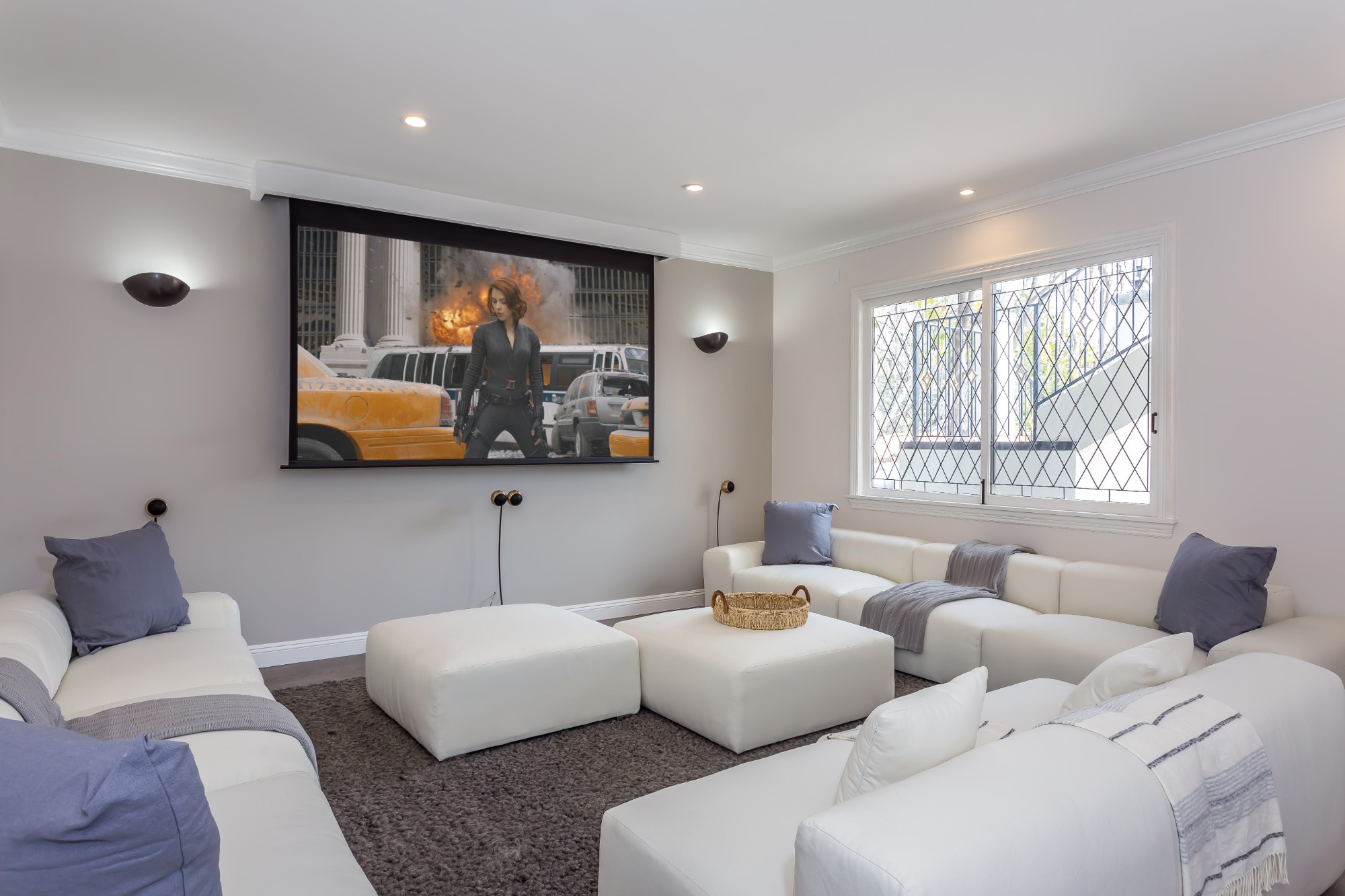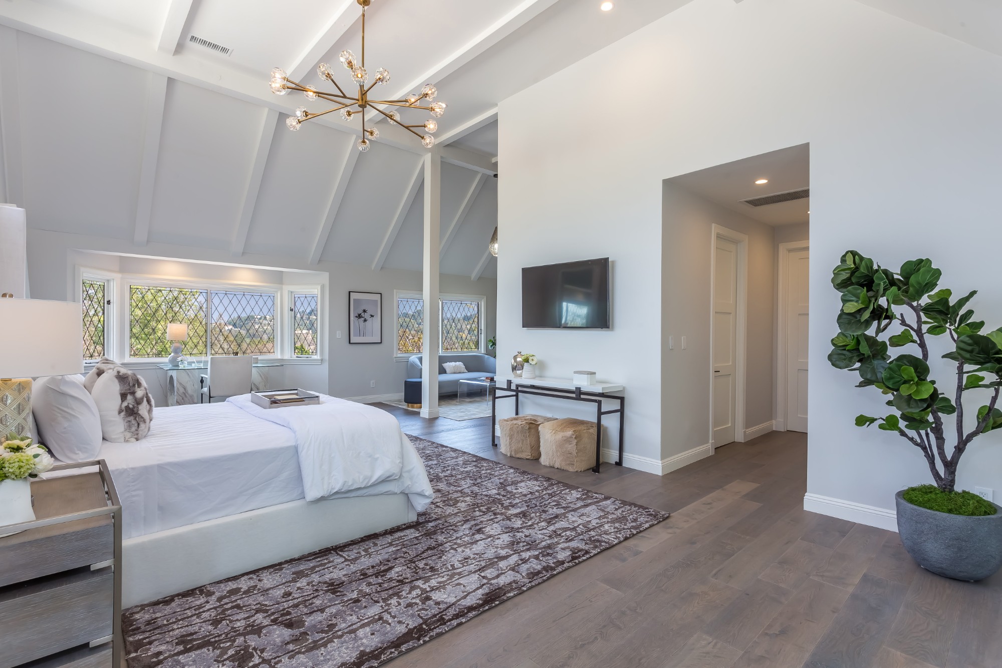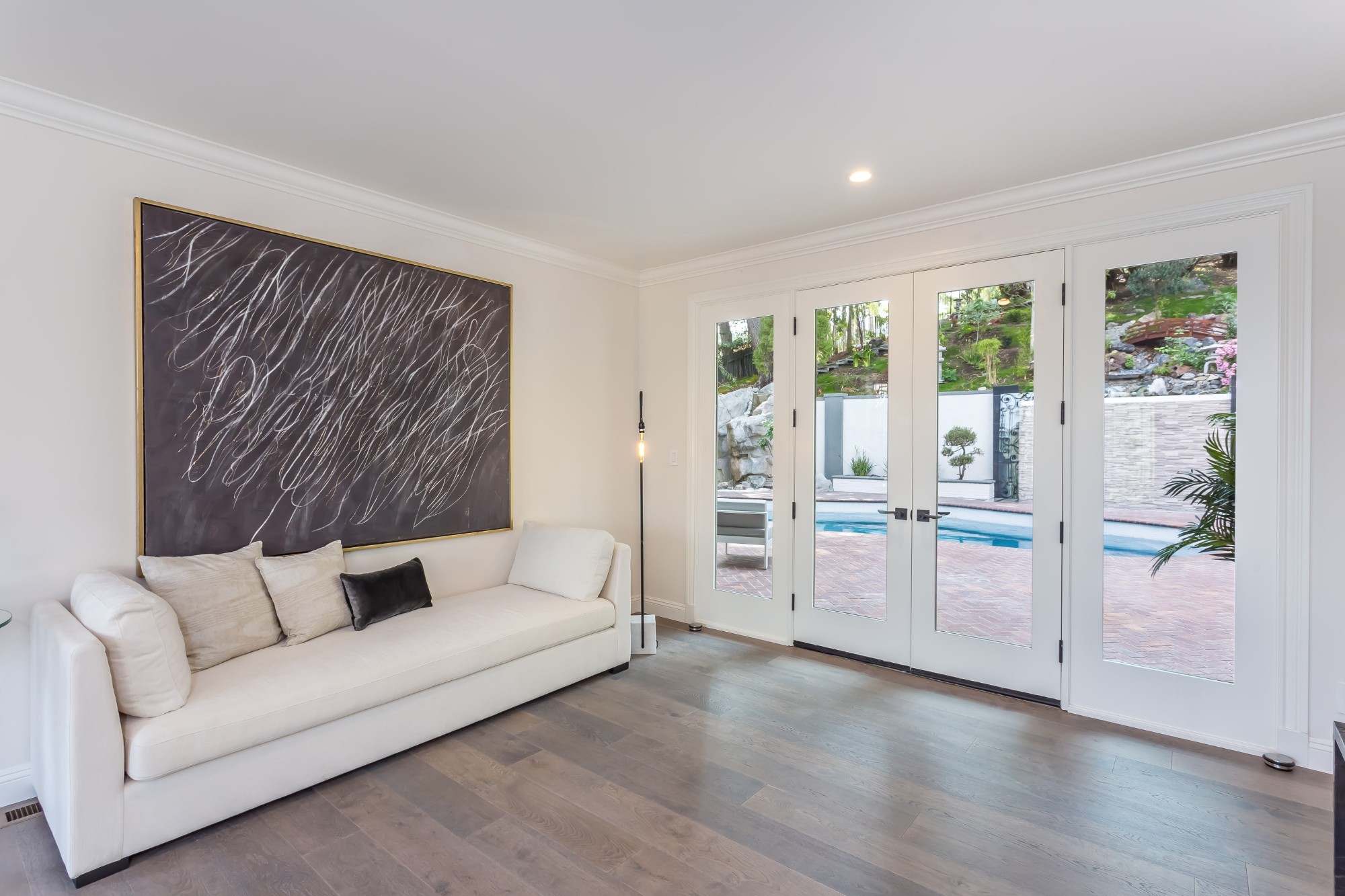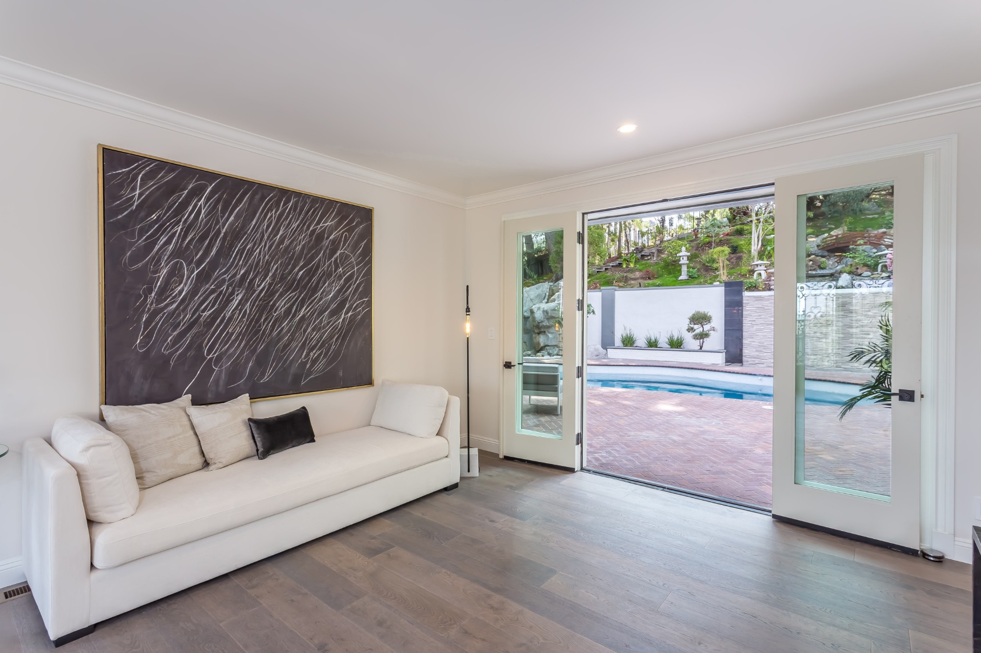 A beautifully remodeled designer residence in coveted Clark Gable Estates, set at the end of a quiet cul-de-sac behind private gates. Boasting greenbelt views, a shared tennis court and large grass field, elevator, sauna, pool, spa, outdoor barbecue area, Japanese garden with multiple water features, movie theater, wine room, and 3-car garage. Smart home technology includes Lutron, Sonos and Alexa. Private overnight neighborhood security officer with patrol car. Award-winning local public elementary school - Lanai Road.