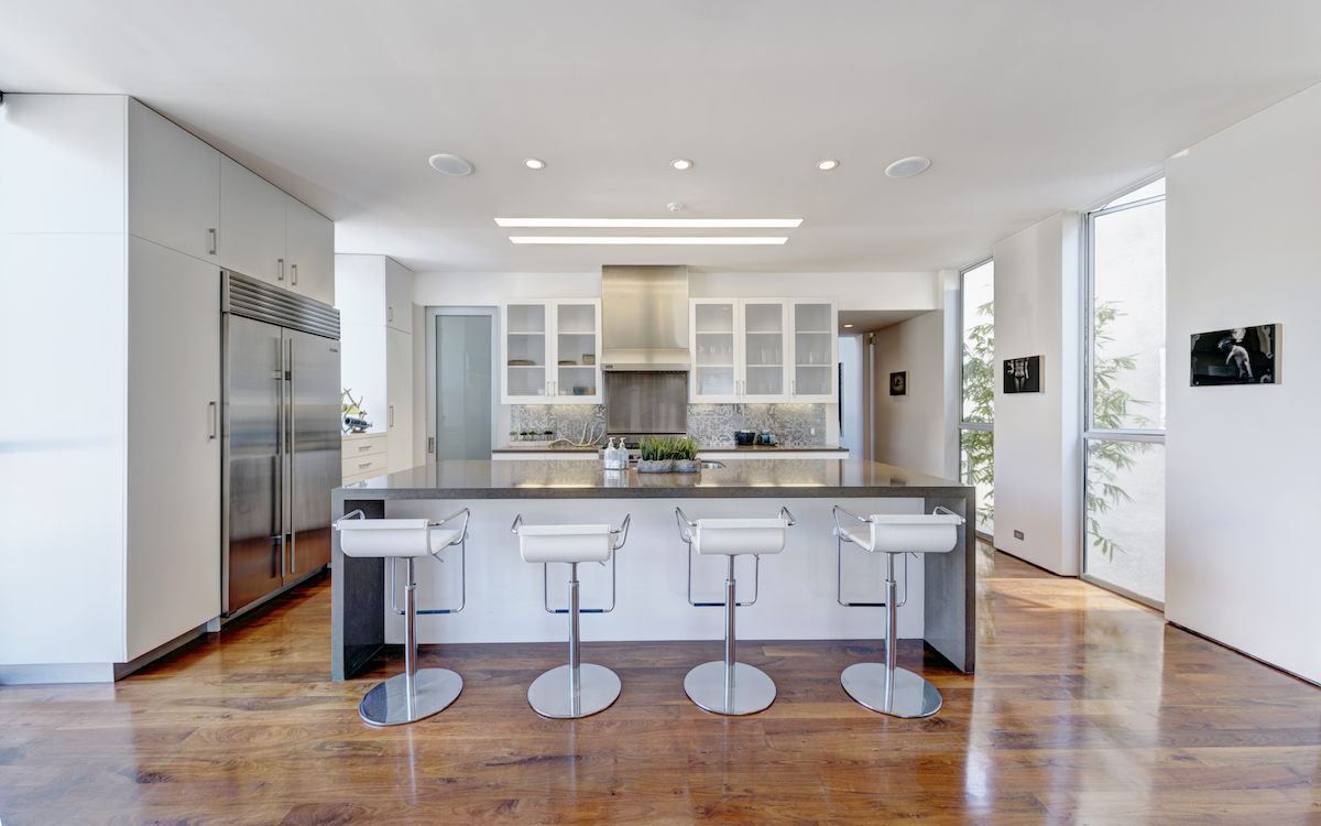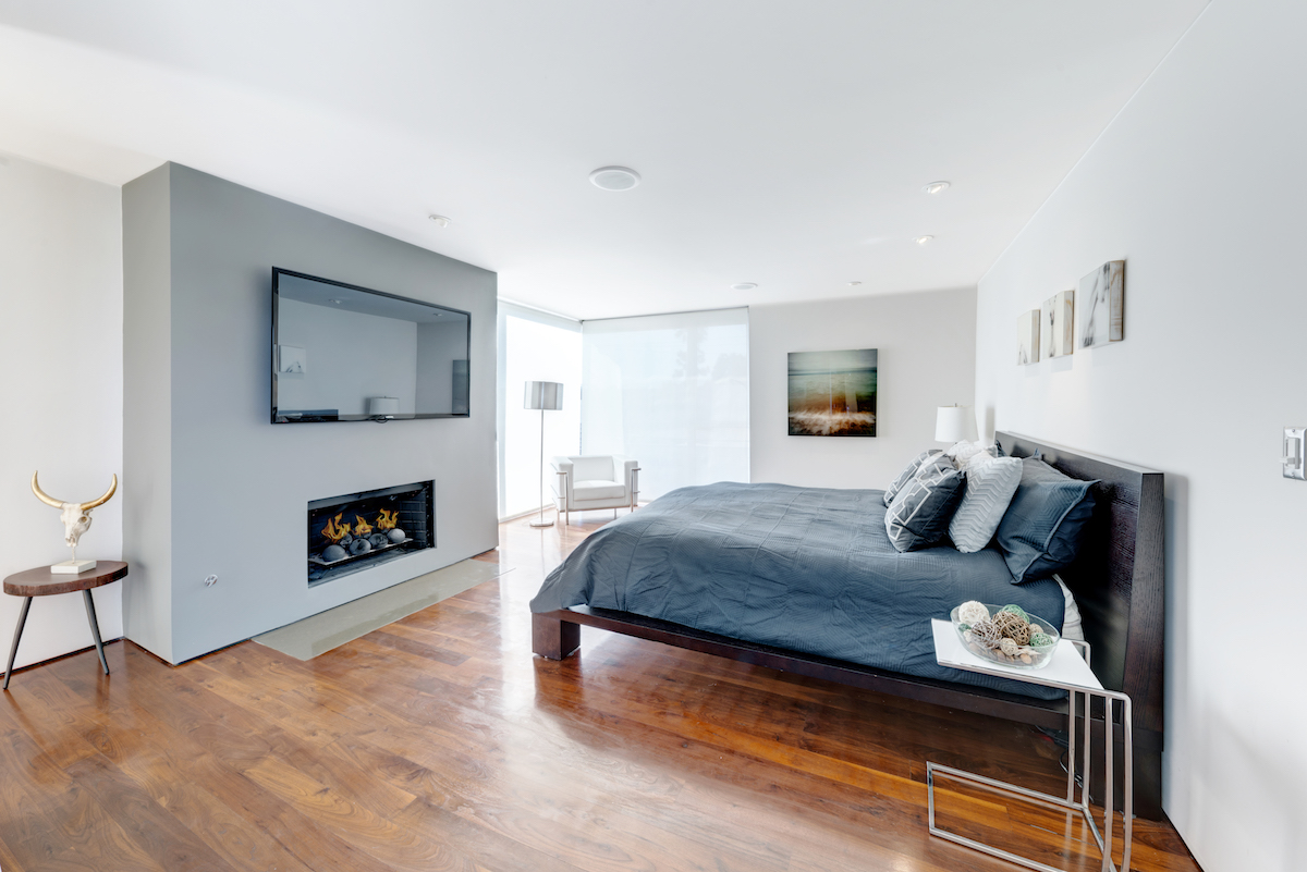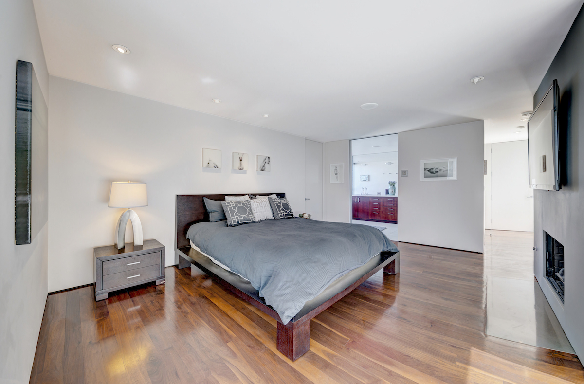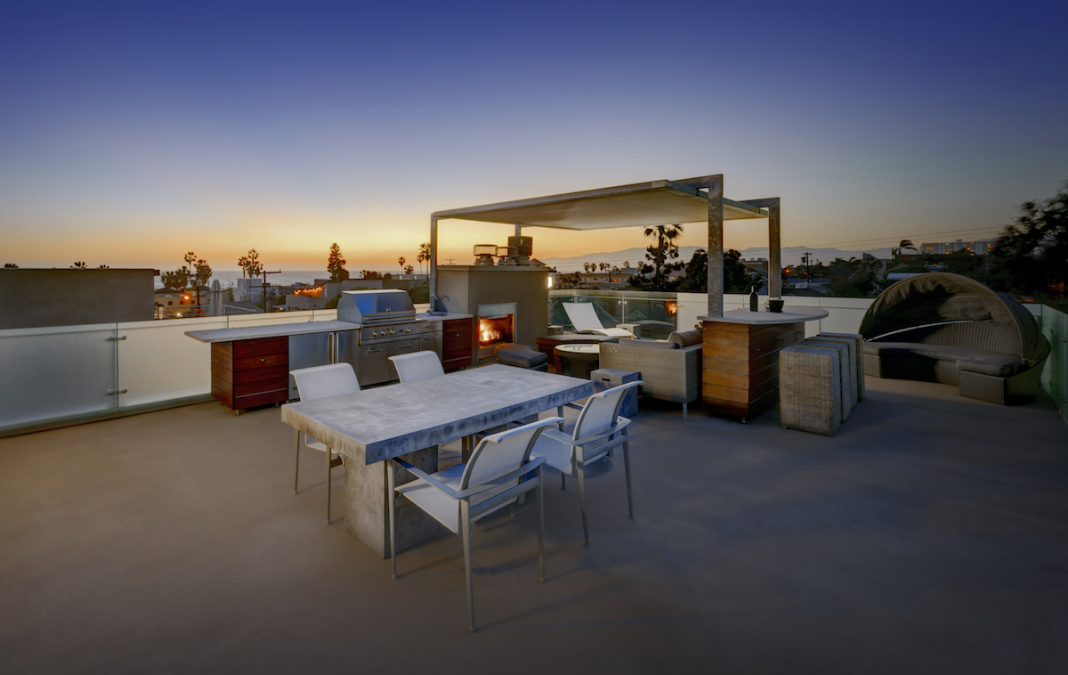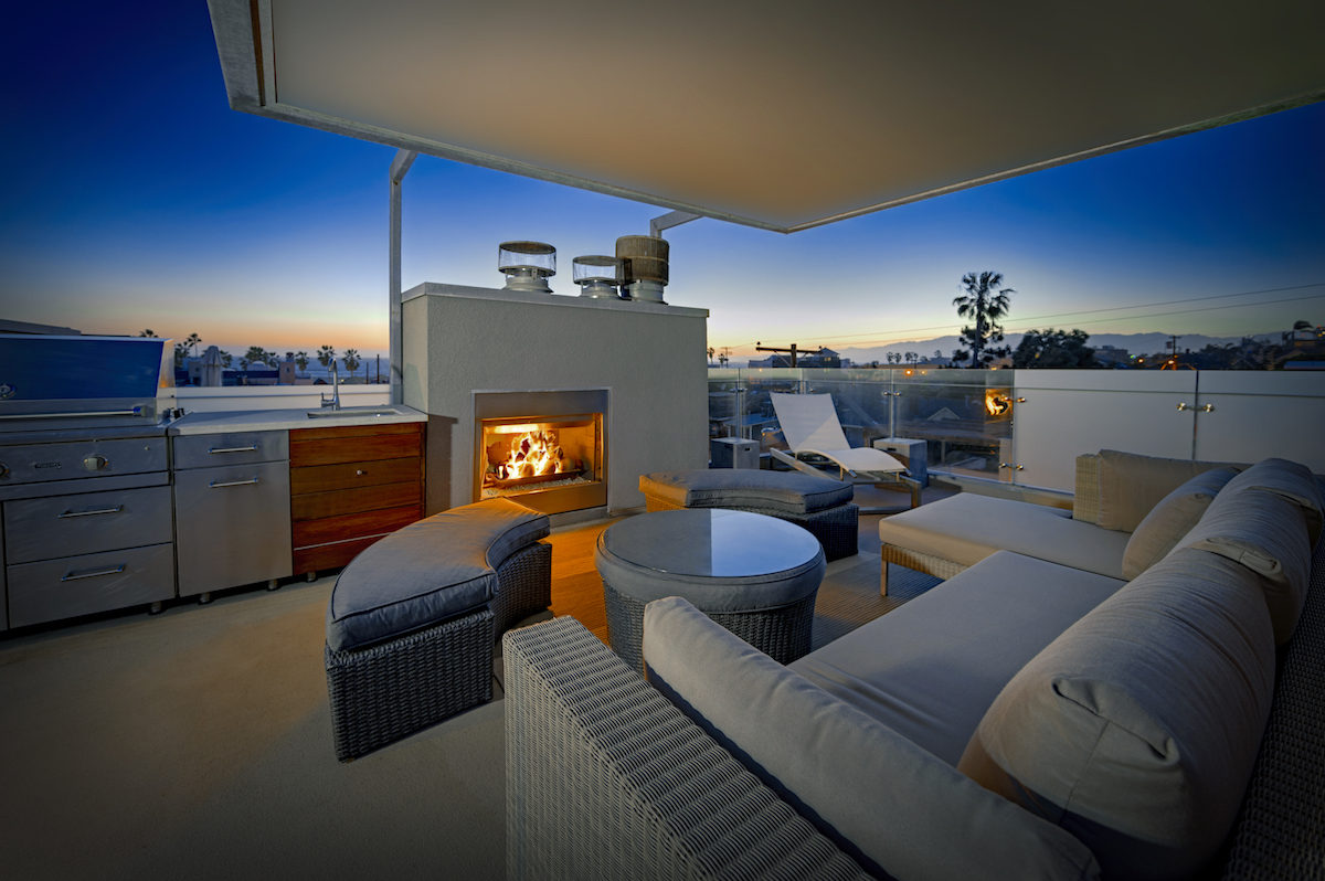 Stunning James Schmidt architectural loft style town home located one block from the famous Venice Boardwalk, Main Street & Abbot Kinney. This 2 bed/2.5 bath features walnut floors, a gourmet kitchen, Caesarstone counter tops, three fireplaces, roof top deck and a private 2 car tandem garage. With seamless windows which flood the home with light, high ceilings, radiant floor heating and custom finishes throughout, this property epitomizes modern sophistication. Master Suite complete with fireplace, large walk-in closet and spacious ensuite bath with a steam shower and free standing bathtub. The expansive roof top sun deck with 360 degree ocean and mountain views, custom-made trellis, an outdoor kitchen and grill equipped with Viking appliances and a built-in fireplace provide the perfect space for entertaining.