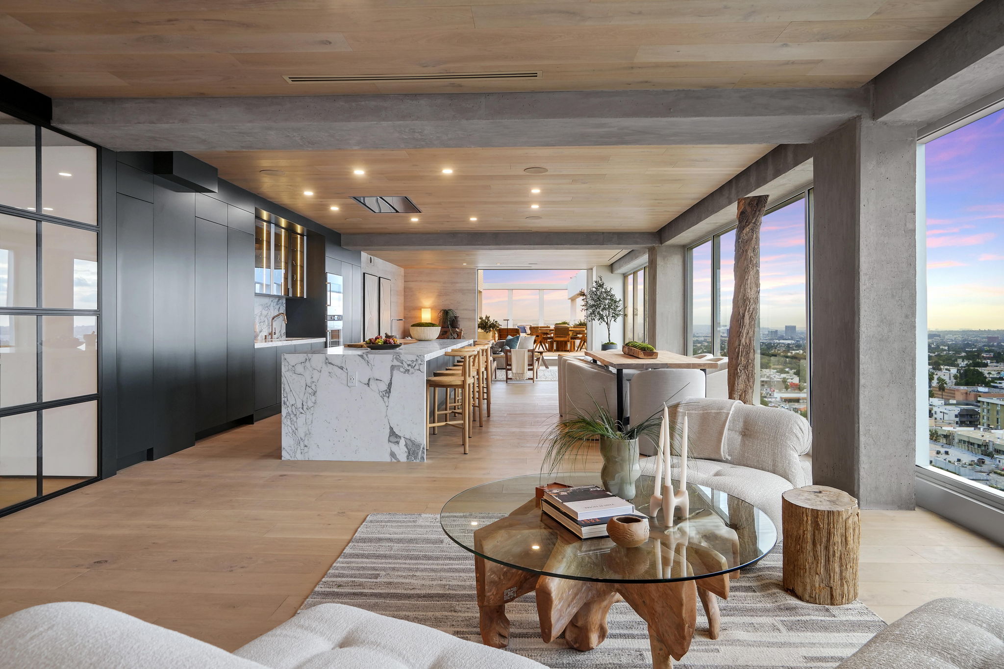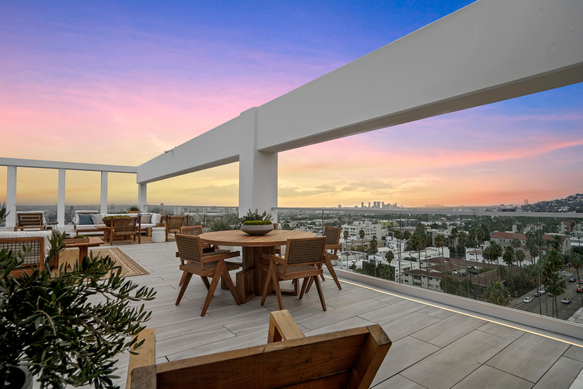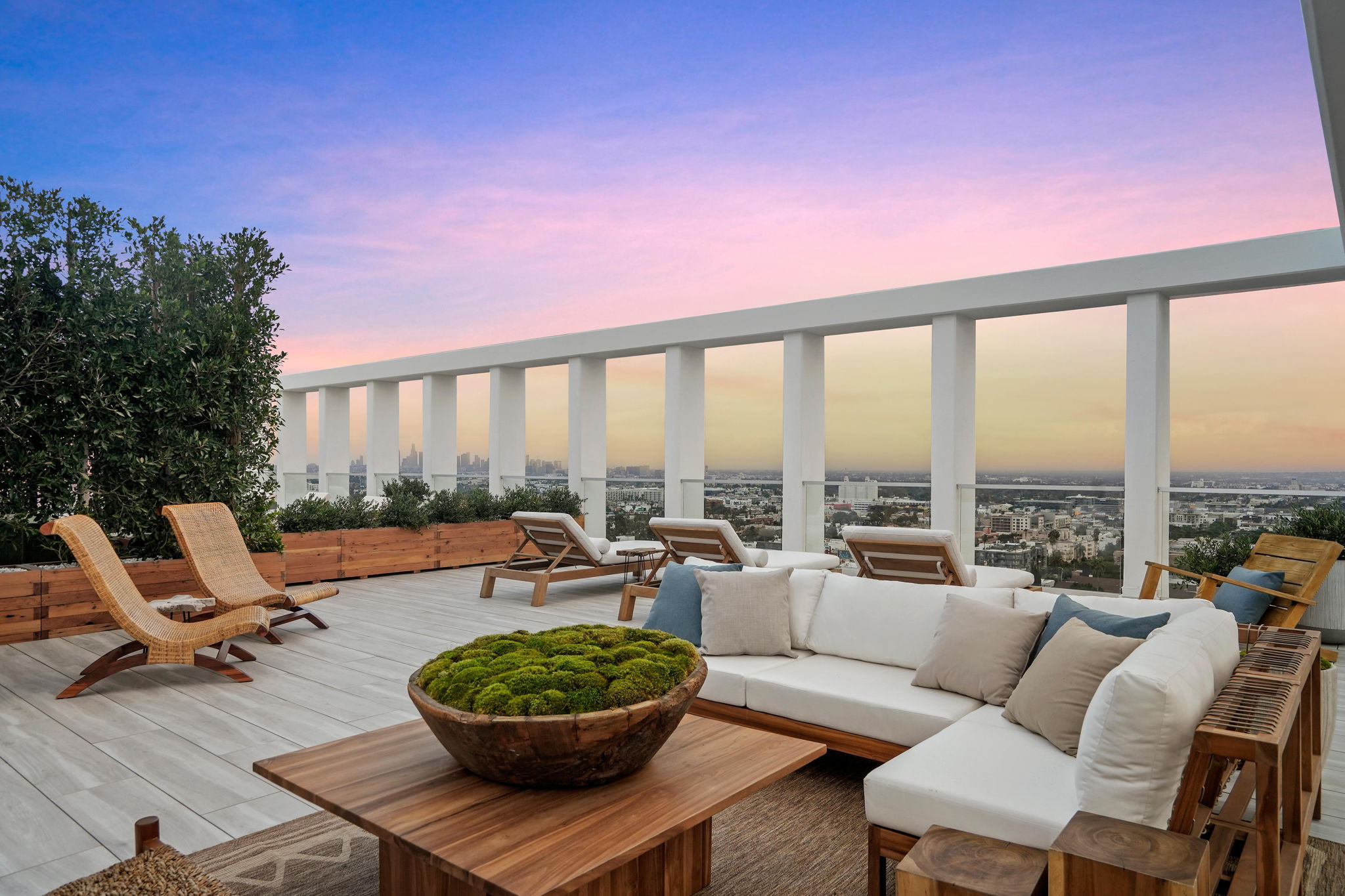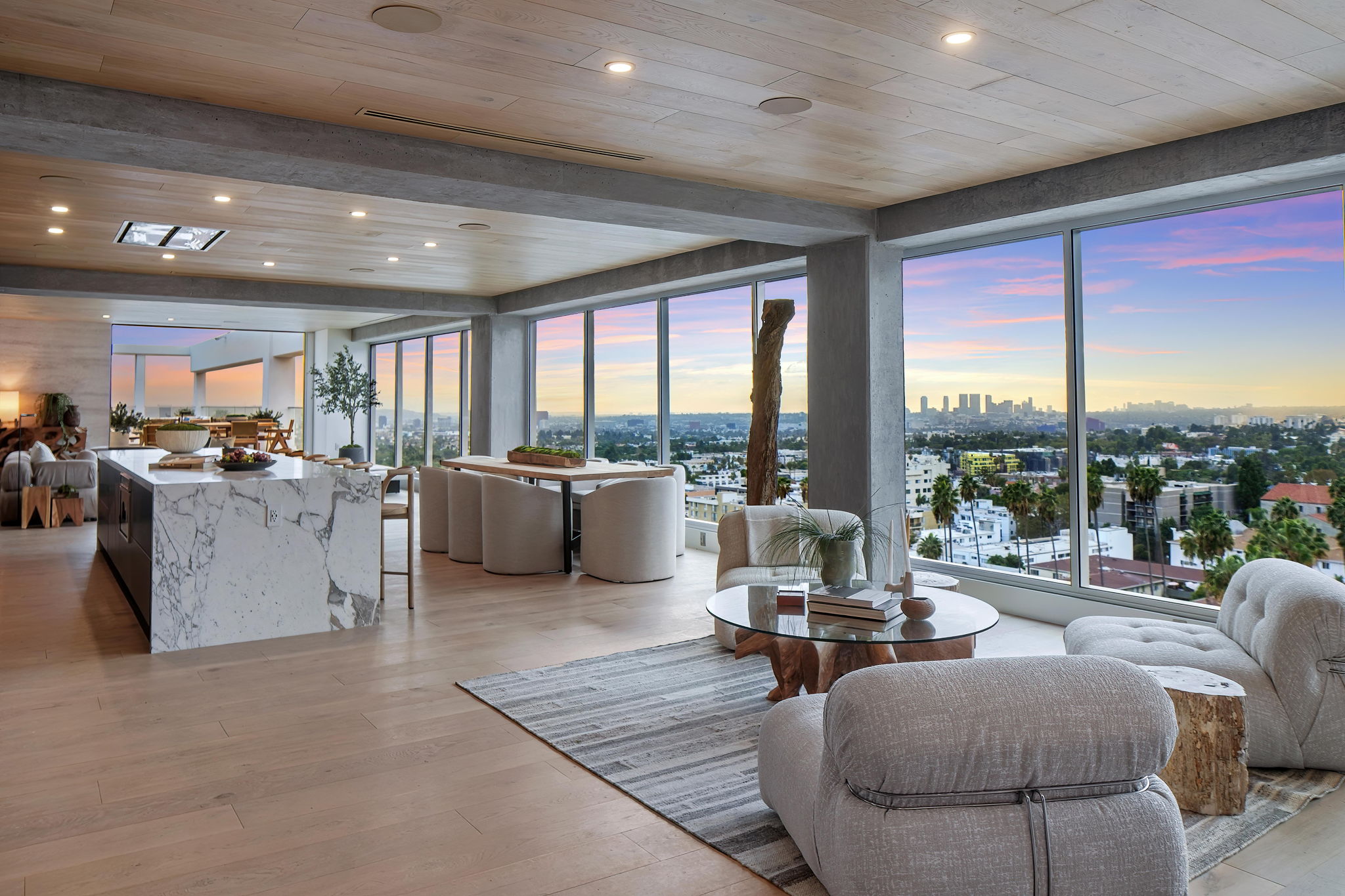 The most unique and exquisitely finished penthouse in all of Los Angeles, showcasing jetliner 360-degree views from the Hollywood sign to downtown and the ocean, as well as 1,685 sq. ft. of private outdoor deck space. Spanning half of the entire top floor in Hollywood's most exclusive full-service building with a newly remodeled lobby (w/valet, doorman, and 24-hour security), Penthouse East has undergone a painstaking 2-year remodel in which every inch has been meticulously curated to perfection, creating the most sophisticated and mesmerizing residence in the entire city. Enter into 3,820 sq. ft. of interior living space, including 3 bedrooms, an office, 4 bathrooms, and an open living/dining room with a built-in bar, all surrounded by floor-to-ceiling glass windows and sliding doors. With the most luxuriously appointed finishes, from wide European oak flooring, to exposed concrete beams, to giant slabs of honed Calacatta Vagli marble and Travertine limestone throughout. A chef's kitchen is fitted with Gaggenau appliances and custom European cabinetry. The luxurious owner's suite boasts a separate sitting area, fireplace, and ensuite bathroom with a free-standing soaking tub, spa-like shower, custom-cut Travertine sink, and an oversized showroom-style walk-in closet with automatic LED lights and privacy glass. The Penthouse offers complete smart home technology and two movie projector systems that drop from the ceiling, in both the living room and primary bedroom, with built-in surround sound. The level of craftsmanship and quality, with a combination of a well-thought-out floor plan and breathtaking amenities, is truly astonishing. 4 dedicated parking spaces are included with the PH. Building amenities include a 24-hour valet, doorman, security, swimming pool, recreation room, fitness center, dog park, and more. An unrivaled offering compared to other luxury condos when considering the design and quality of finishes, size/scale, unobstructed views from the Griffith Observatory to the Pacific Ocean, and outdoor deck space that will not only speak to you but impact you in the most profound way possible. Penthouse East (3,580 sq. ft. of interior living space with 2,885 sq. ft. exterior deck) is also available to purchase for an additional $7,495,000, completing the entire top floor of the building.