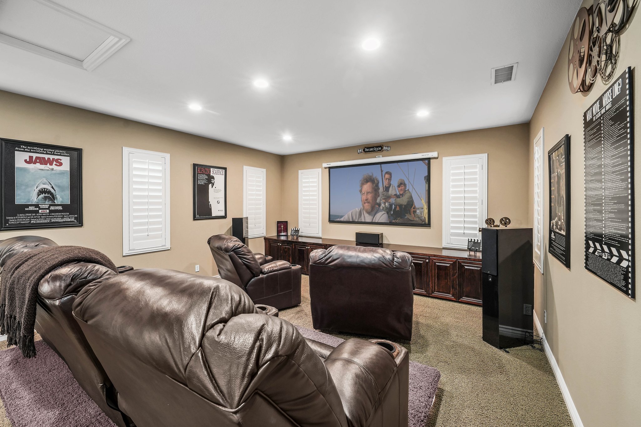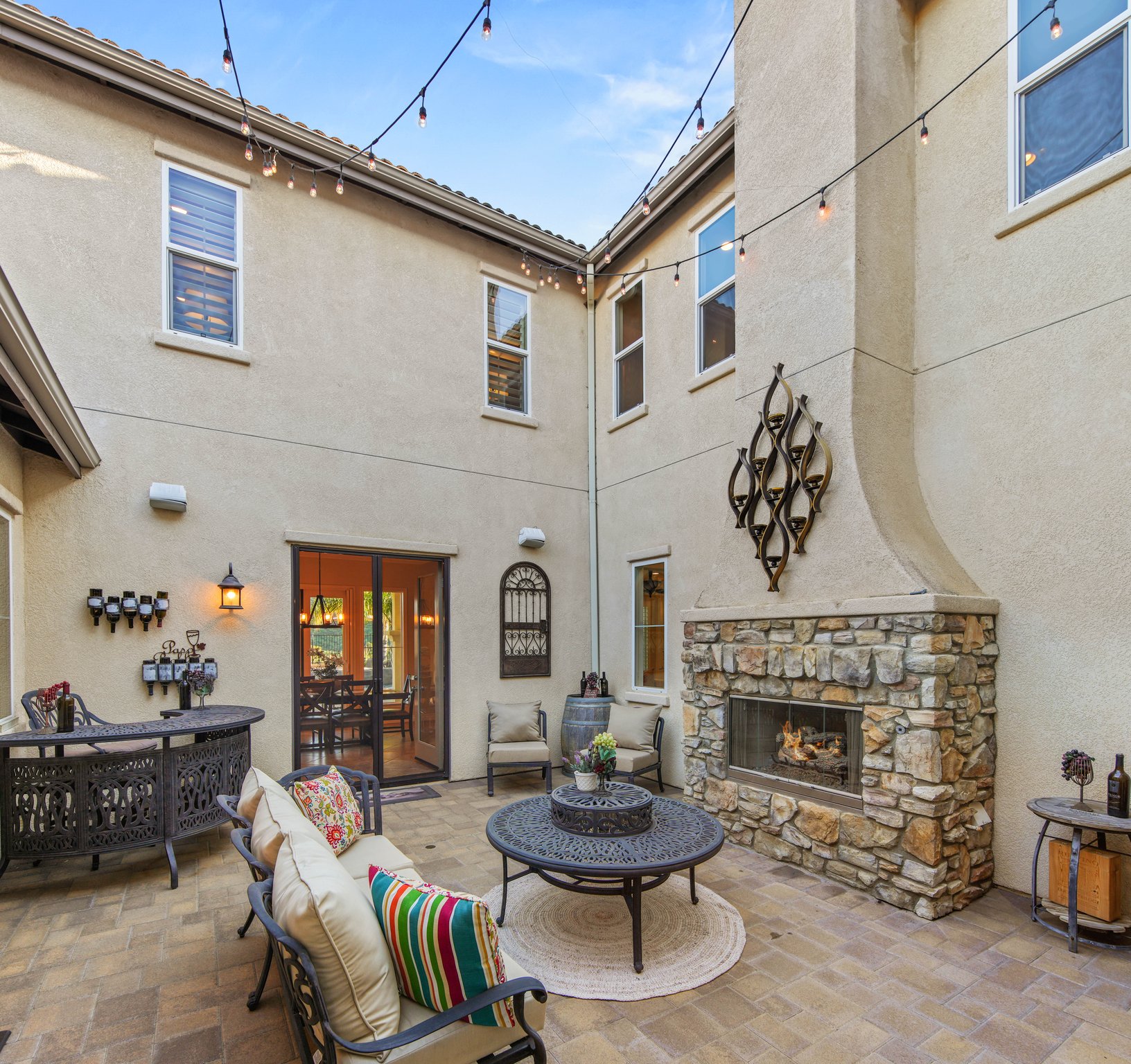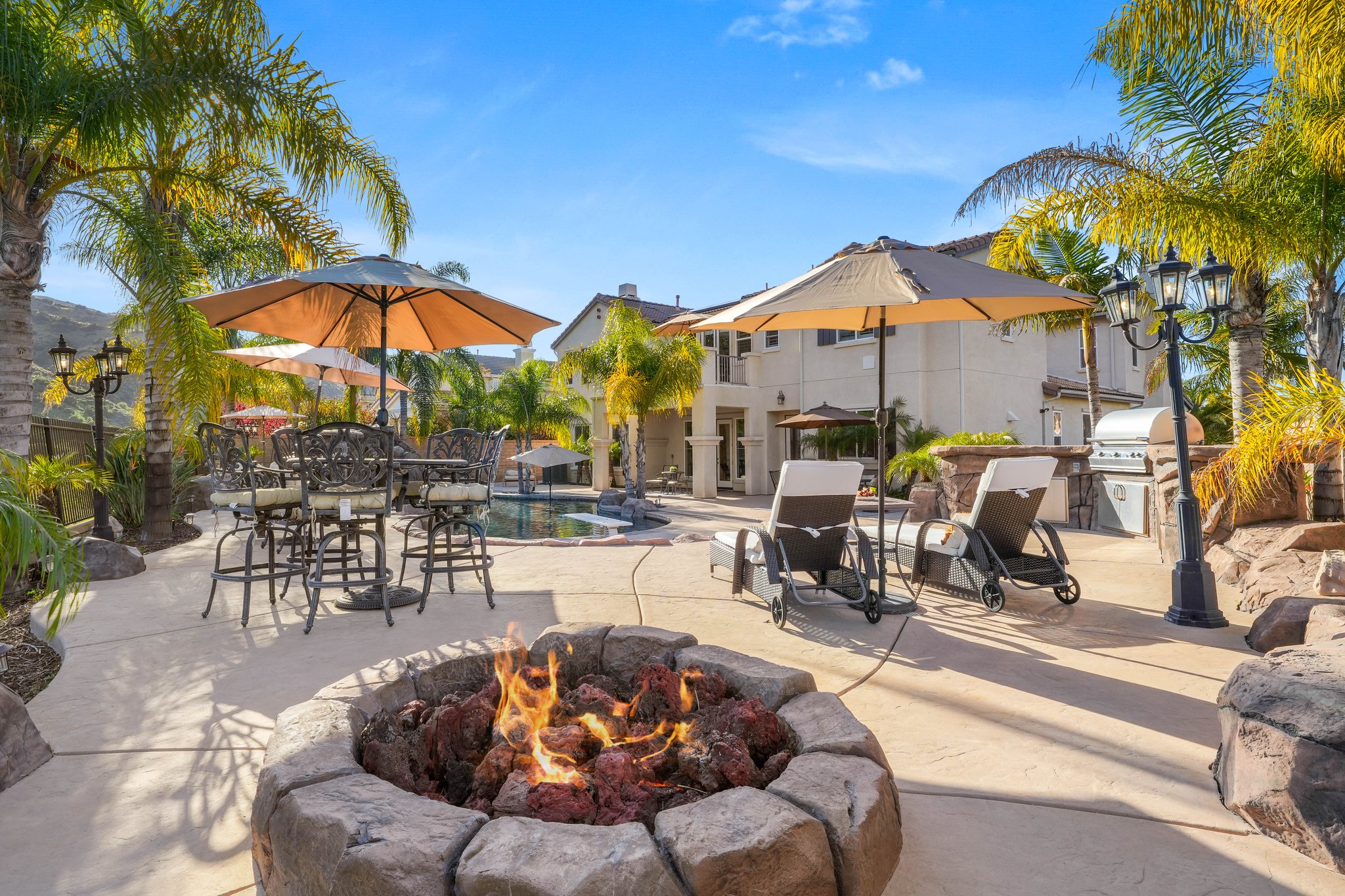 Welcome to the pinnacle of luxurious living amidst a breathtaking backdrop of the mountains within the exclusive gated community of The Retreat. This extraordinary property seamlessly blends ample space with functional design and premium amenities. The open concept main floor showcases a great room, impressive outdoor atrium/courtyard, expansive dining area, home office, wine cellar, family room, and a well-equipped gourmet kitchen which is the heart of the home with its expansive central island and convenient breakfast area. Through the sliding glass doors lies your own private backyard sanctuary, featuring a sprawling pool, spa, and barbecue area perfect for entertaining. The primary bedroom boasts a generously-sized walk-in closet and a spa-like primary bath, complete with dual vanities, a luxurious jacuzzi tub, and a tri-head shower. For the ultimate entertainment experience, this residence includes a dedicated home theater adorned with surround sound speakers, perfect for hosting unforgettable movie nights.