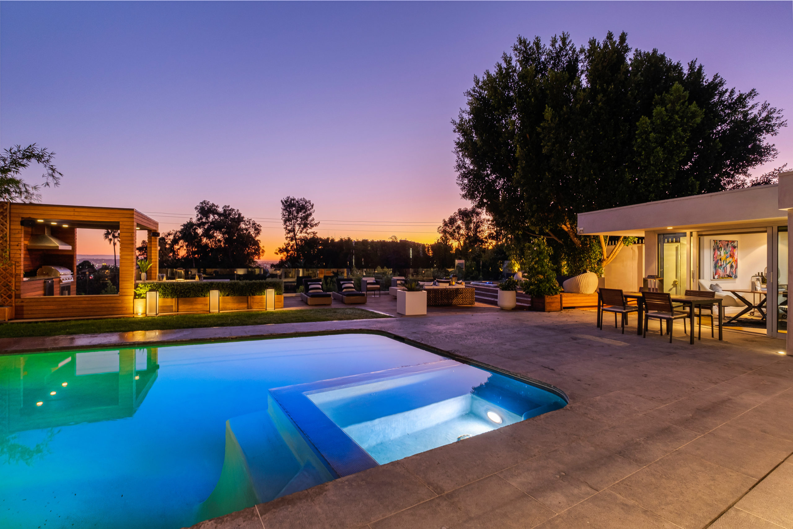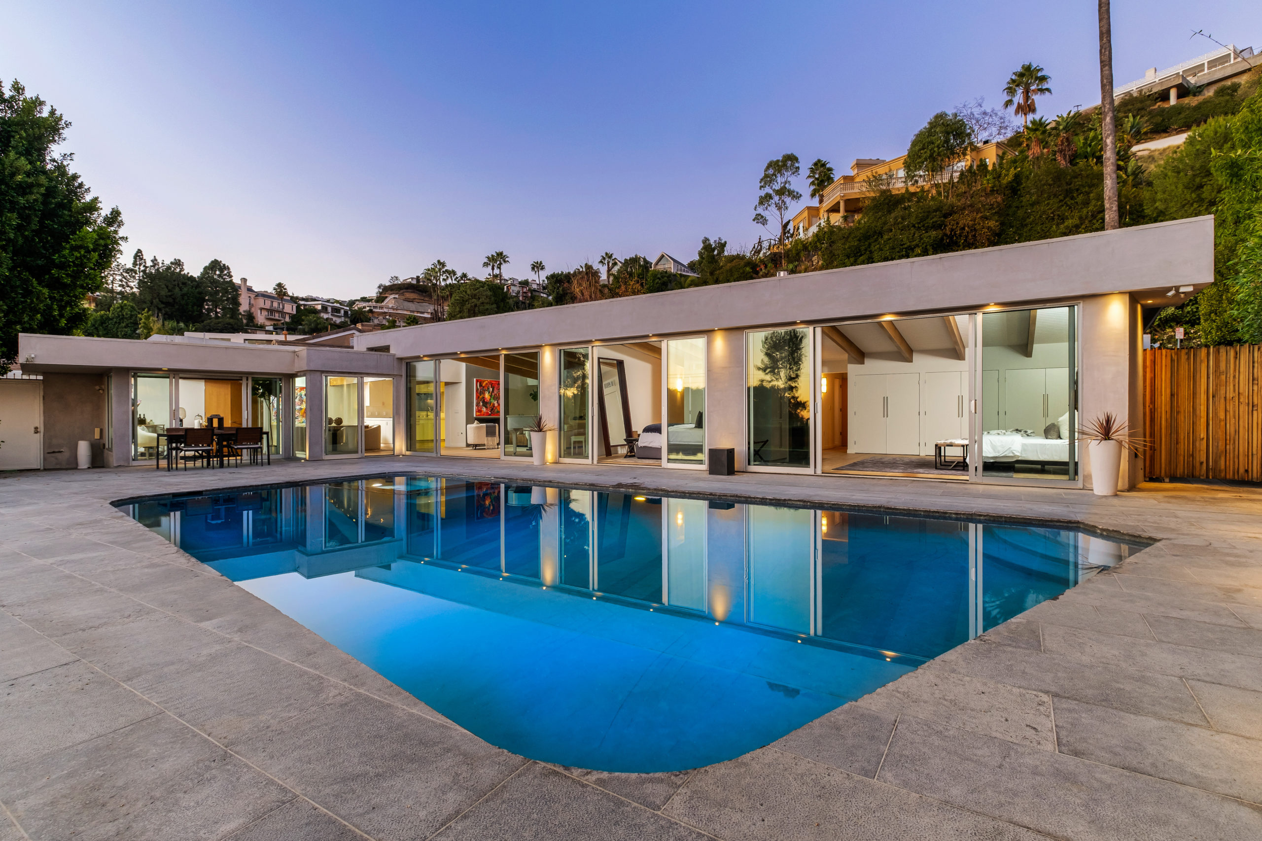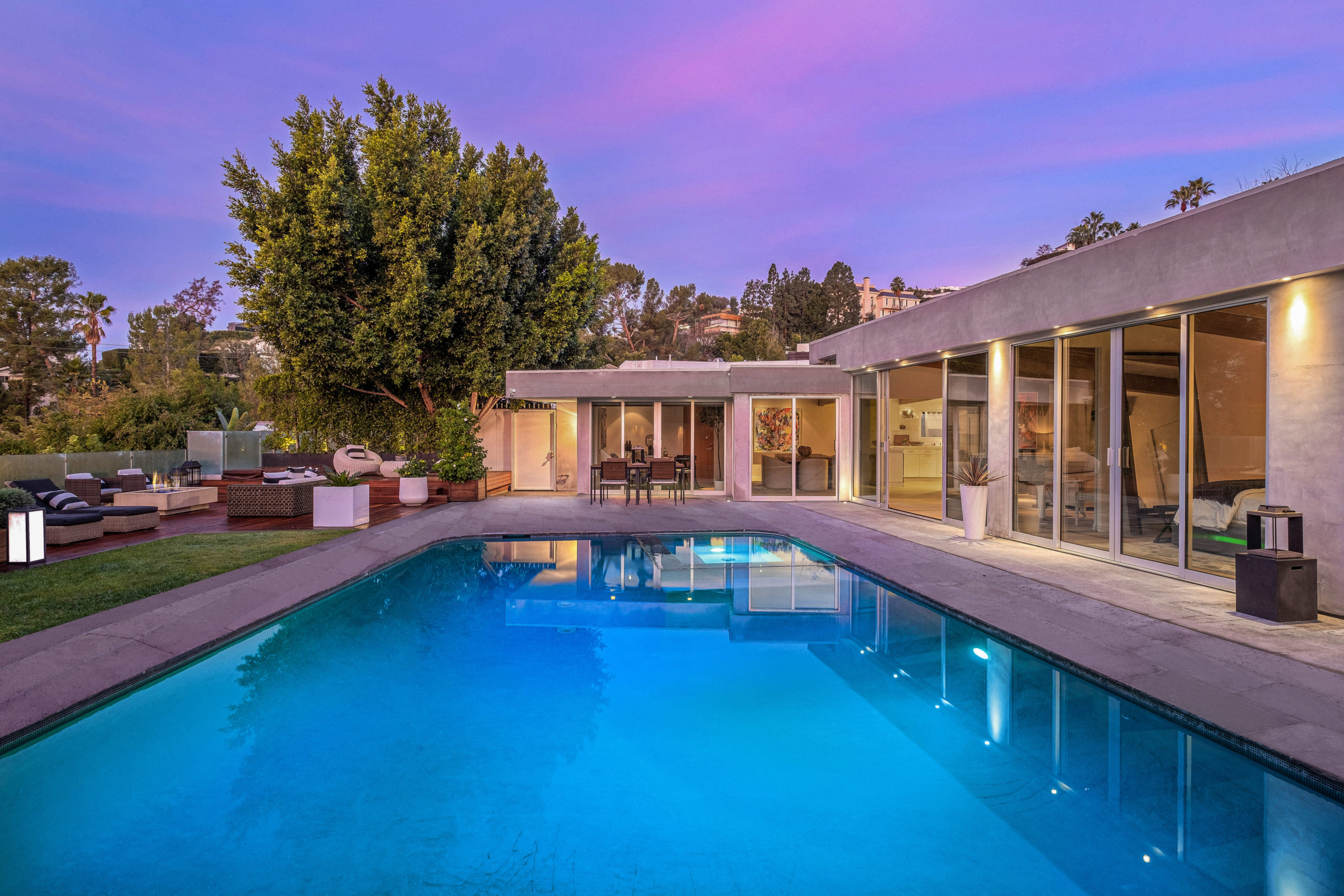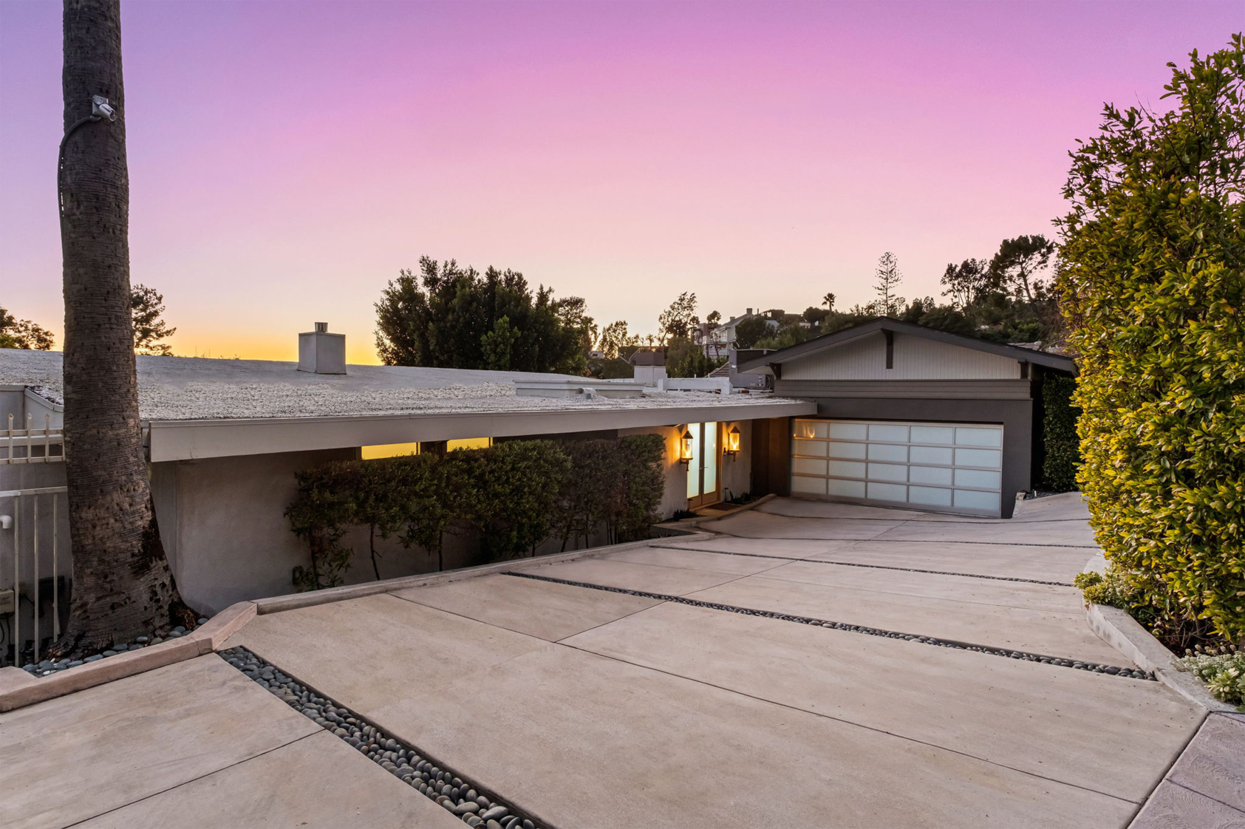 The Bergman Residence, built in 1955, is a quintessential post-and-beam contemporary situated on a quiet cul-de-sac in lower Sunset Plaza with spectacular city views. This unique single-story 3bed/4bath masterpiece boasts a Chef’s kitchen with white Thassos marble countertops, custom built-ins and oak flooring throughout, motorized blinds, natural gas and water filtration systems, and a stone fireplace overlooking a grassy yard with large pool/dual-spa and sweeping treetop and city lights views. Walls of glass provide abundant natural light and allow for seamless enjoyment of the indoor/outdoor spaces. Large outdoor deck extension boasts outside kitchen with black granite worktops, additional spa, fire pit and all-weather Sonos sound system. The garage was converted into a fully soundproofed commercial-grade music studio with acoustic design by legendary acoustician Vincent van Haaff. Beautiful dual-entrance/exit driveway with 4-car parking.