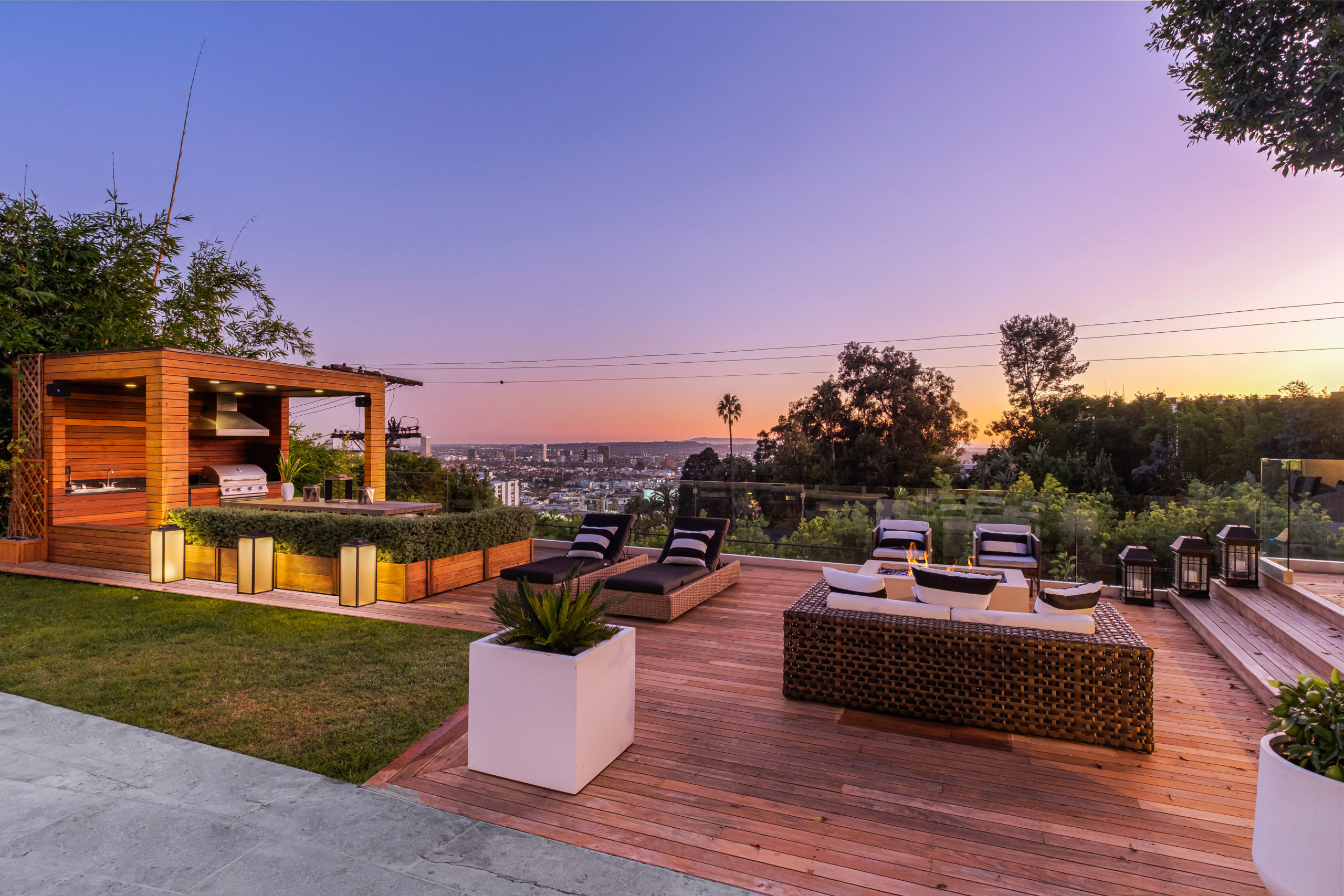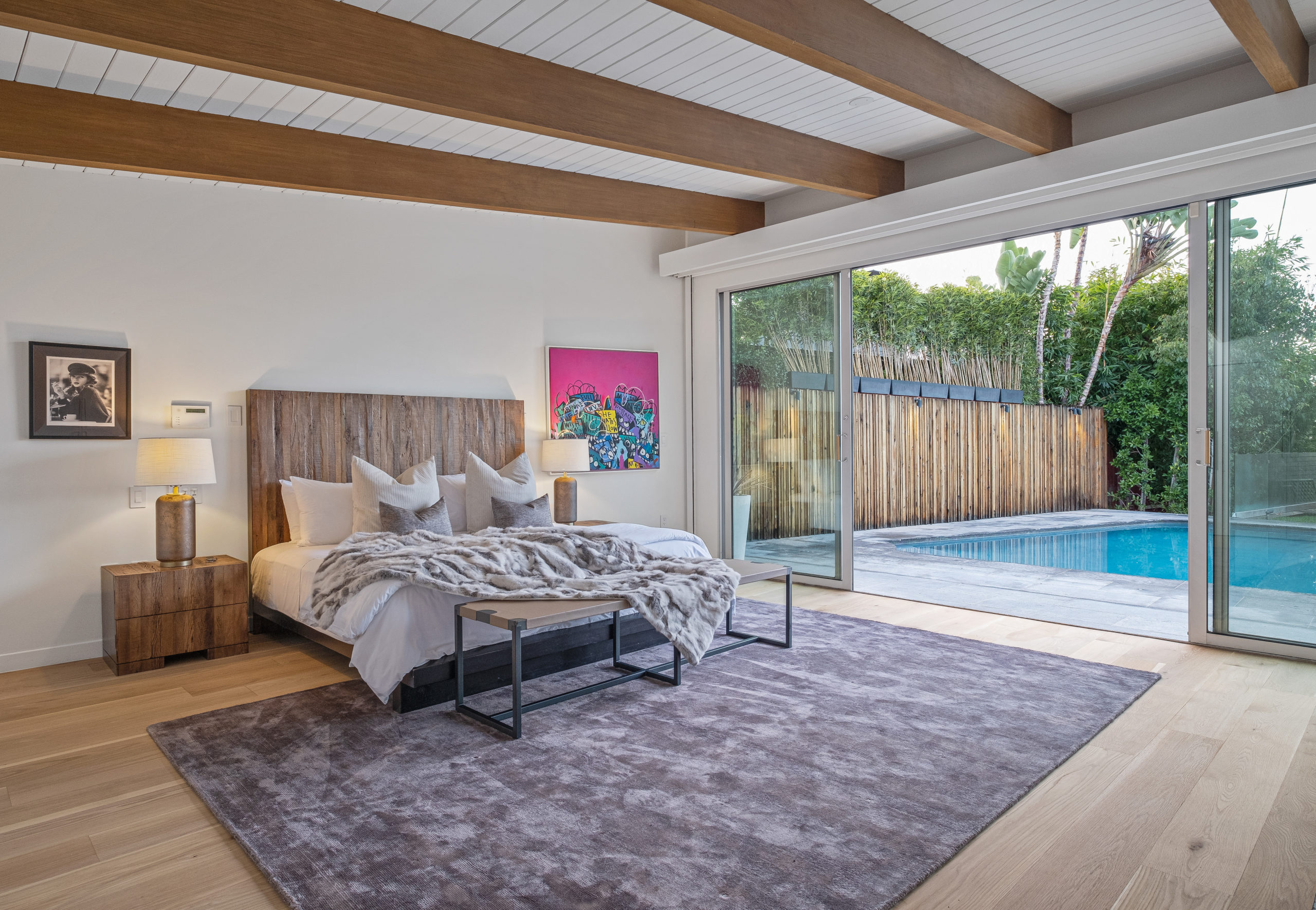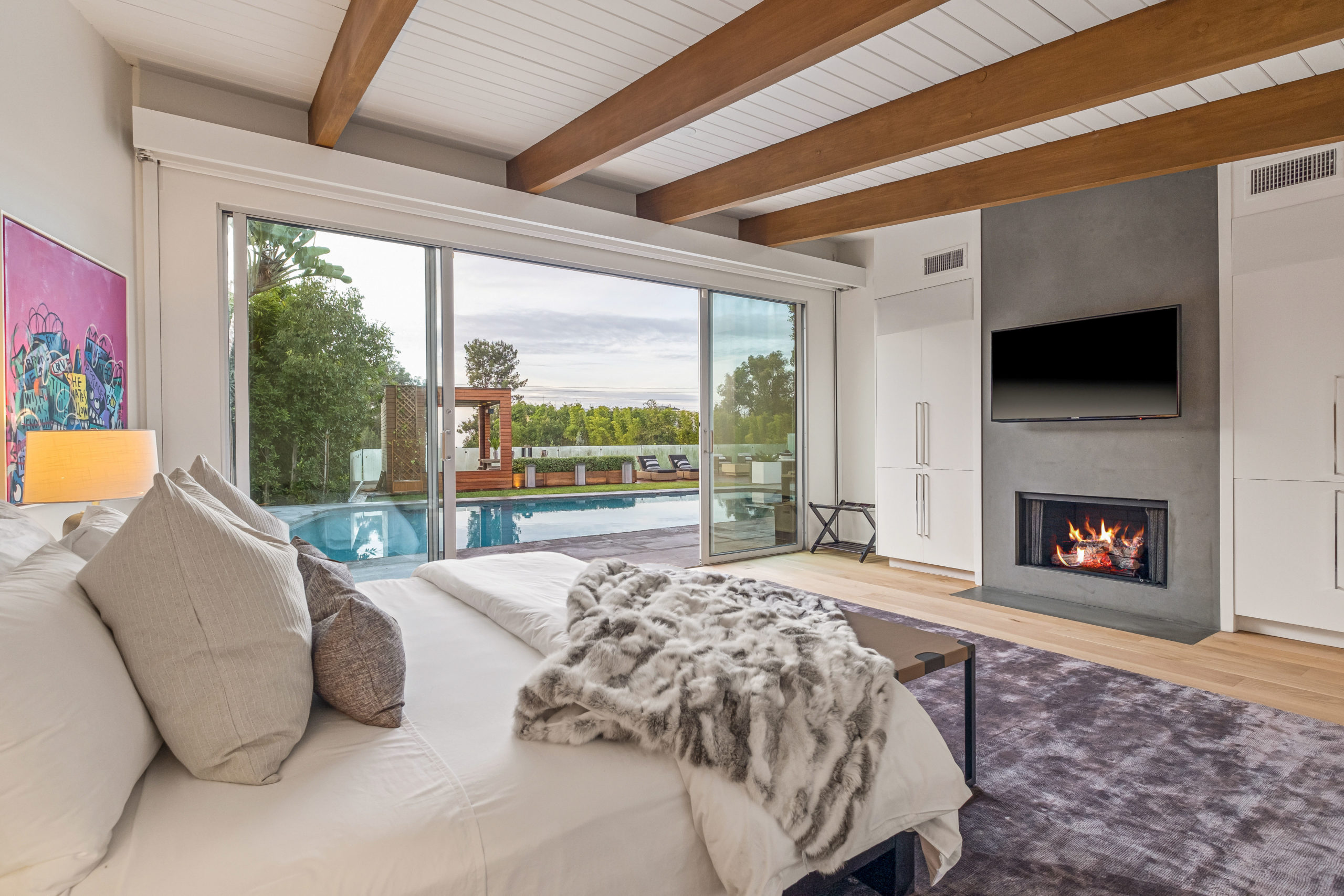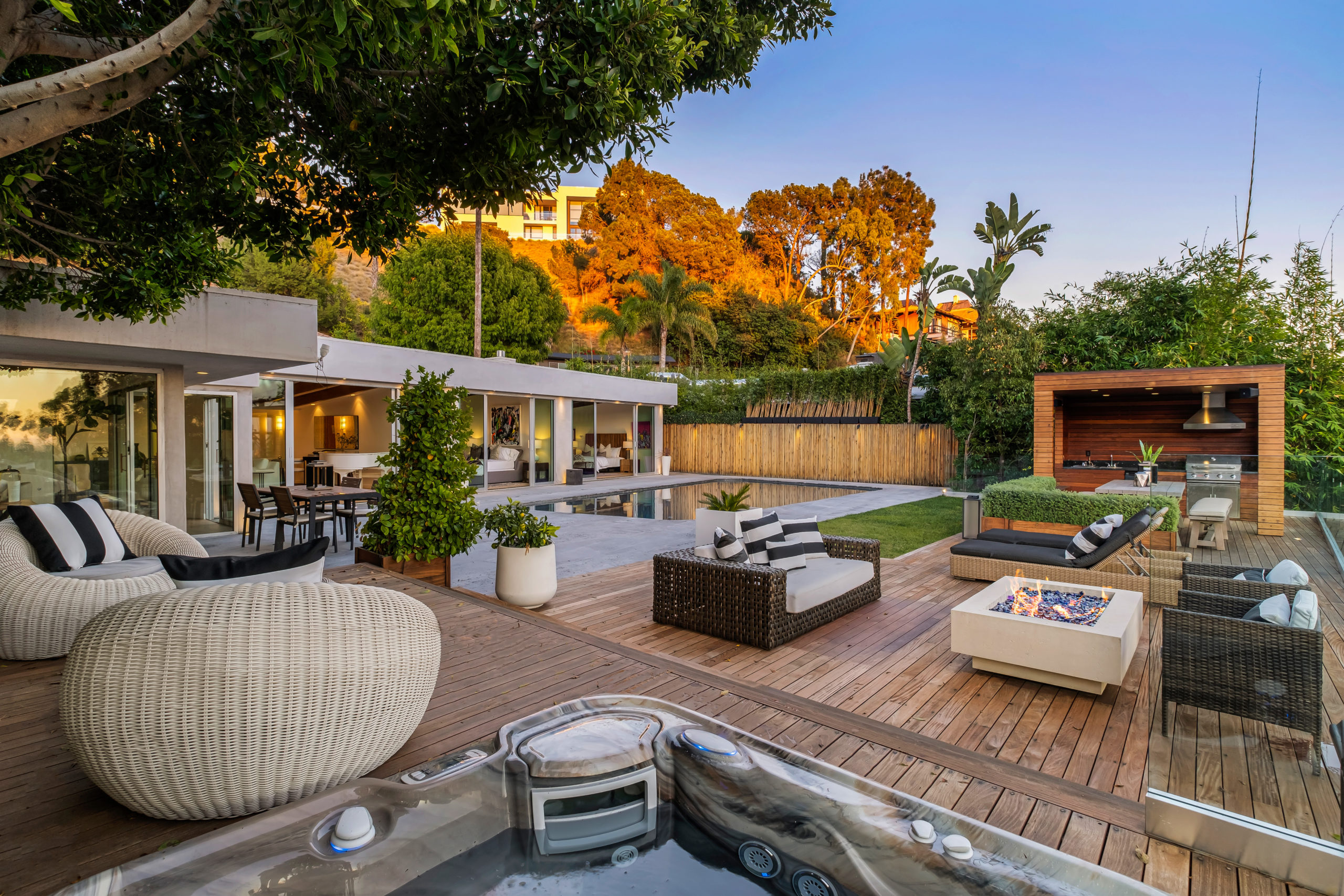 The Bergman Residence, built in 1955, is a quintessential post-and-beam contemporary situated on a quiet cul-de-sac in lower Sunset Plaza with spectacular city views. This unique single-story 3bed/4bath masterpiece boasts a Chef’s kitchen with white Thassos marble countertops, custom built-ins and oak flooring throughout, motorized blinds, natural gas and water filtration systems, and a stone fireplace overlooking a grassy yard with large pool/dual-spa and sweeping treetop and city lights views. Walls of glass provide abundant natural light and allow for seamless enjoyment of the indoor/outdoor spaces. Large outdoor deck extension boasts outside kitchen with black granite worktops, additional spa, fire pit and all-weather Sonos sound system. The garage was converted into a fully soundproofed commercial-grade music studio with acoustic design by legendary acoustician Vincent van Haaff. Beautiful dual-entrance/exit driveway with 4-car parking.