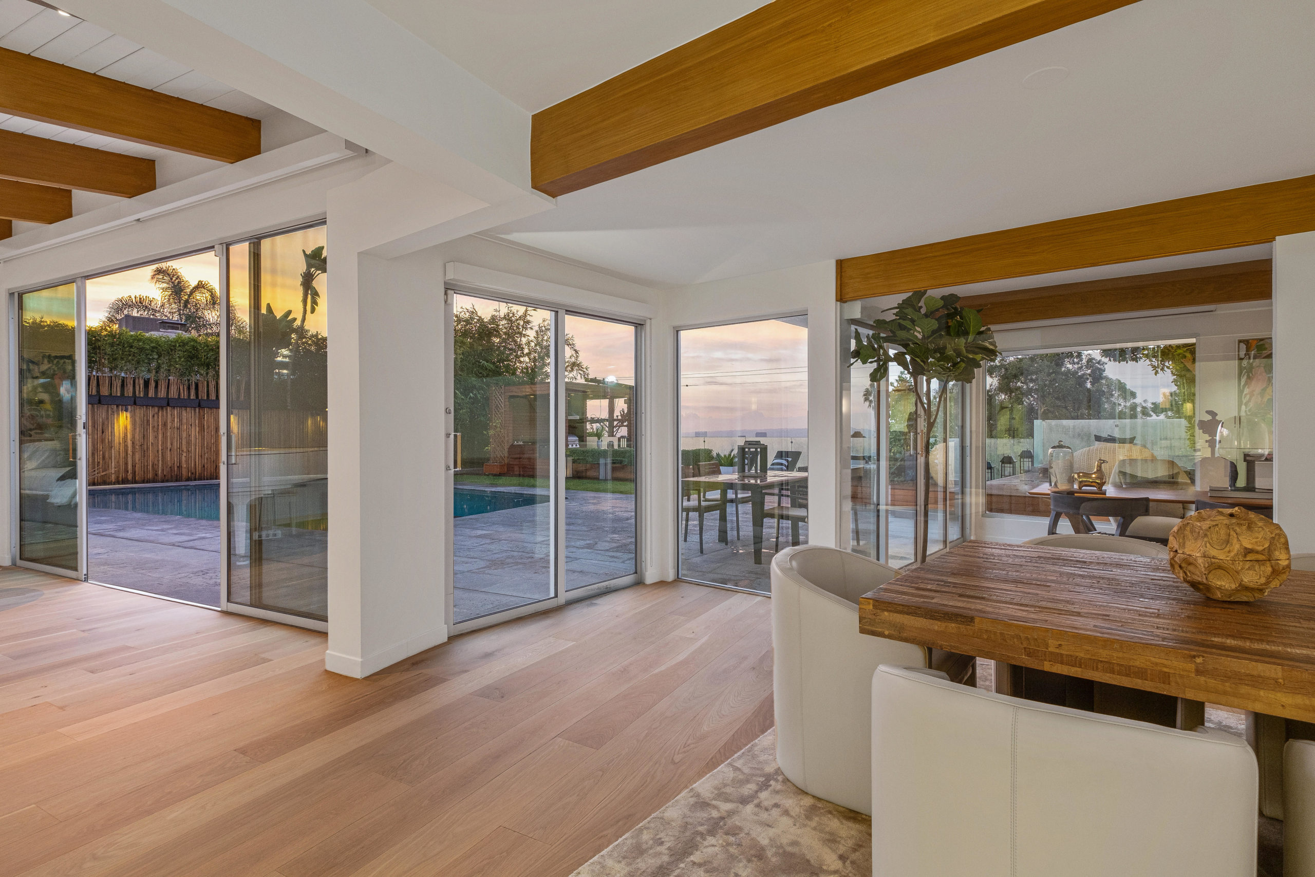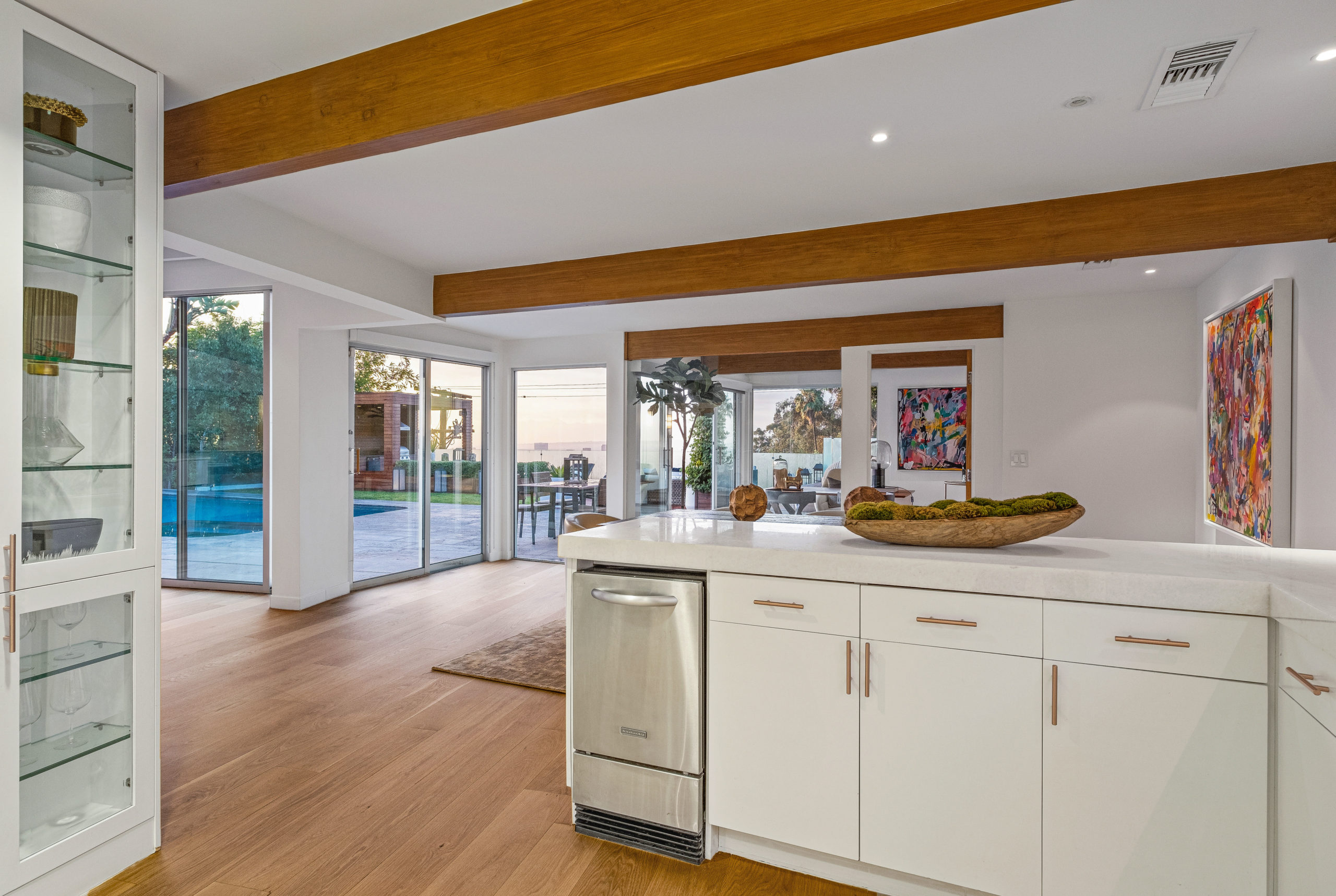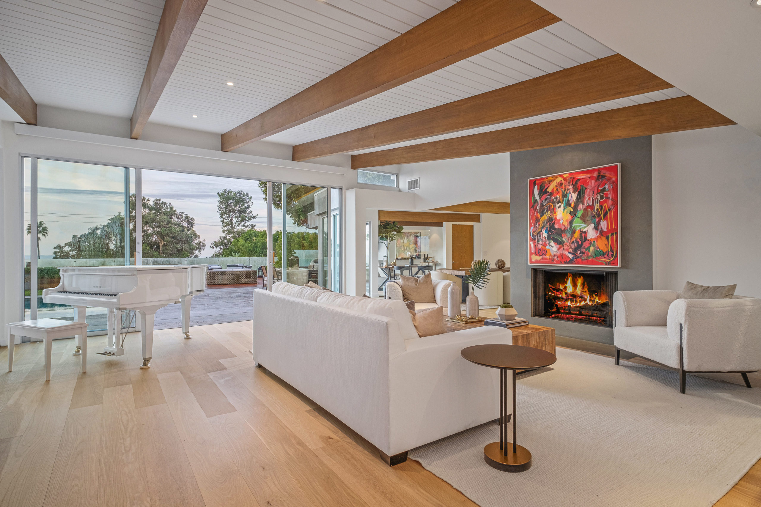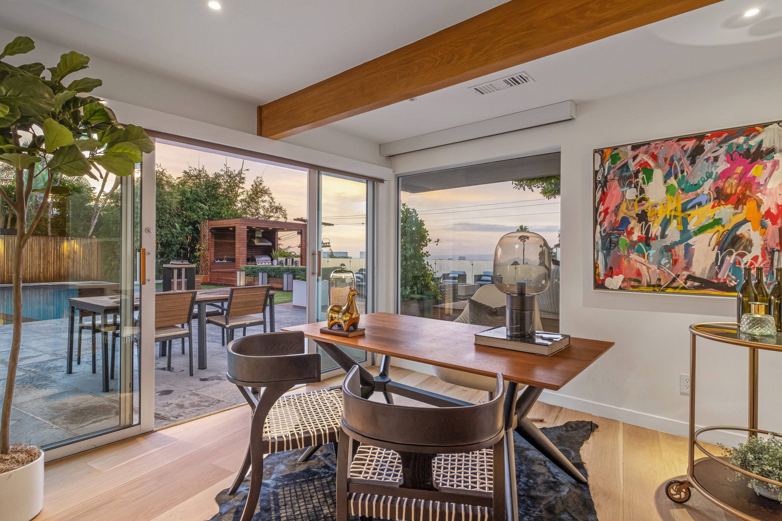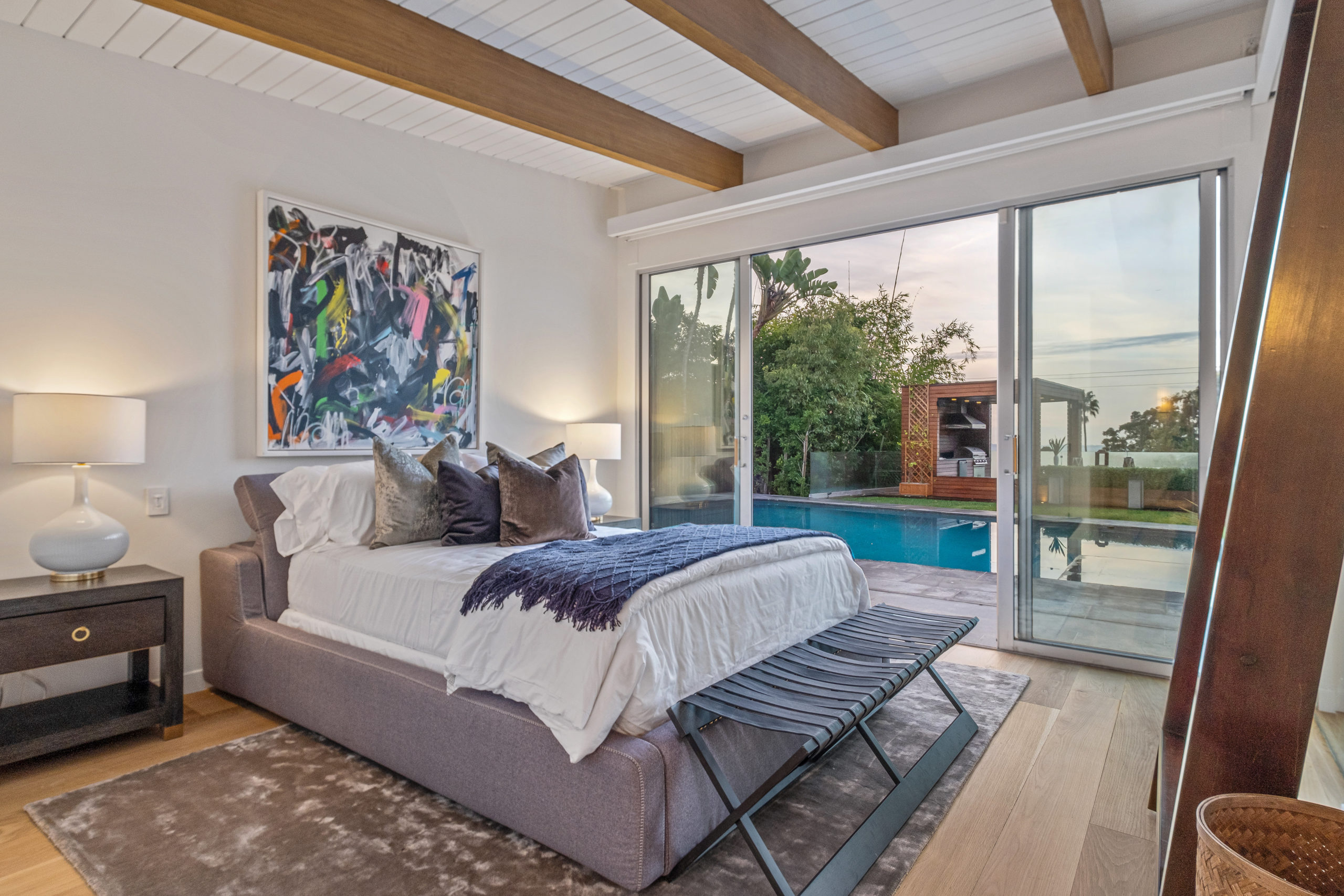 The Bergman Residence, built in 1955, is a quintessential post-and-beam contemporary situated on a quiet cul-de-sac in lower Sunset Plaza with spectacular city views. This unique single-story 3bed/4bath masterpiece boasts a Chef’s kitchen with white Thassos marble countertops, custom built-ins and oak flooring throughout, motorized blinds, natural gas and water filtration systems, and a stone fireplace overlooking a grassy yard with large pool/dual-spa and sweeping treetop and city lights views. Walls of glass provide abundant natural light and allow for seamless enjoyment of the indoor/outdoor spaces. Large outdoor deck extension boasts outside kitchen with black granite worktops, additional spa, fire pit and all-weather Sonos sound system. The garage was converted into a fully soundproofed commercial-grade music studio with acoustic design by legendary acoustician Vincent van Haaff. Beautiful dual-entrance/exit driveway with 4-car parking.