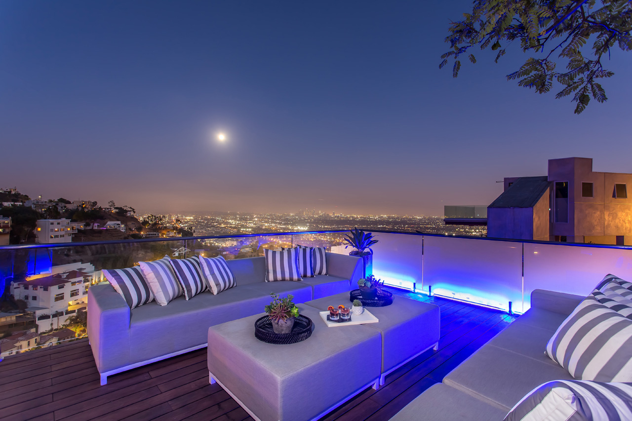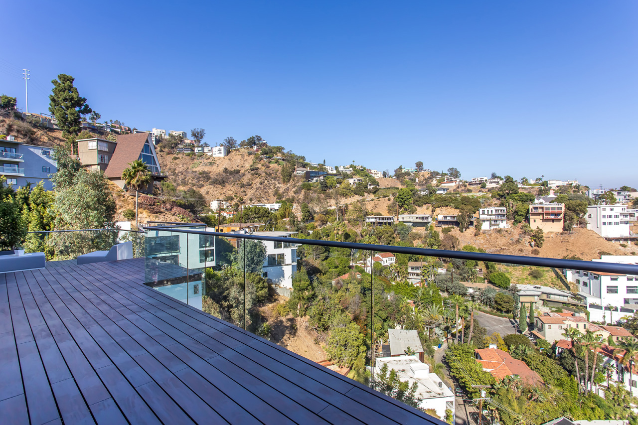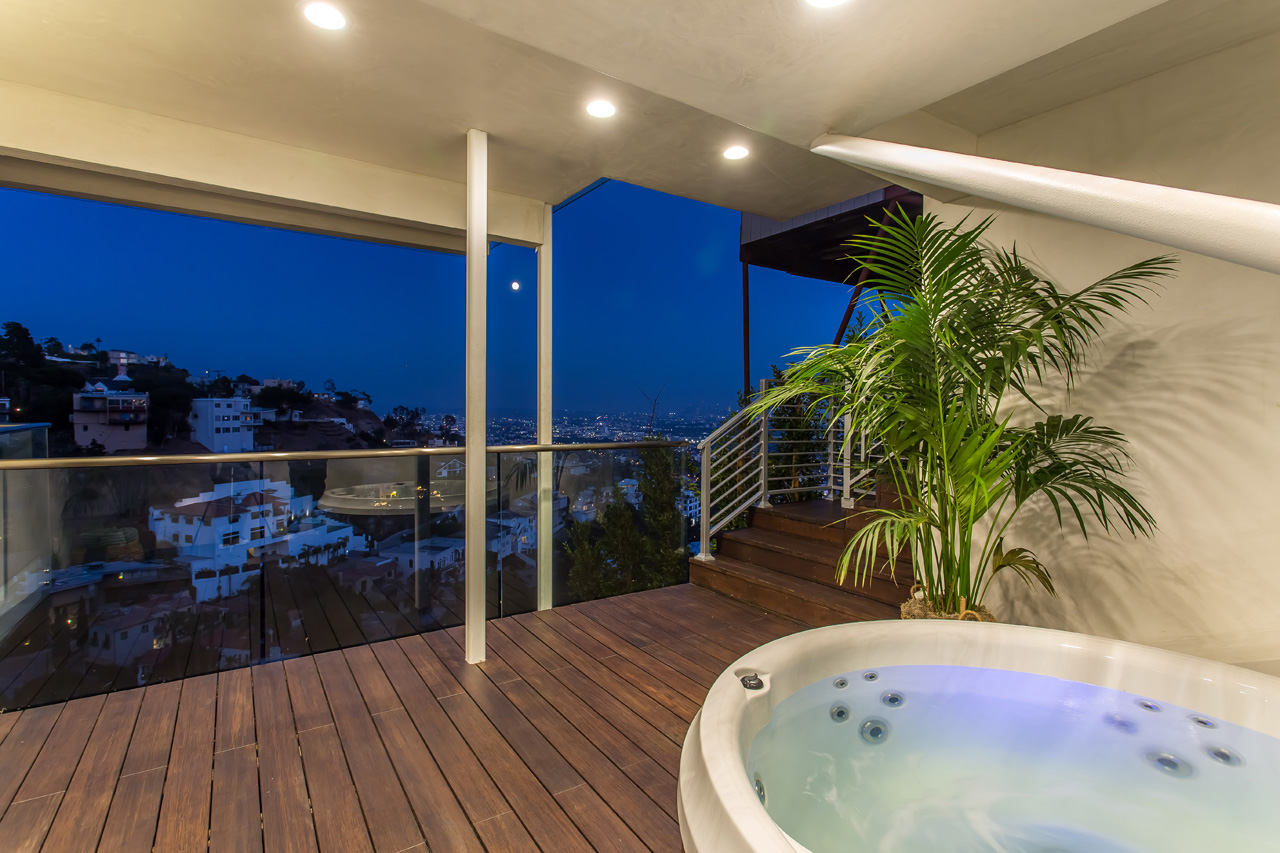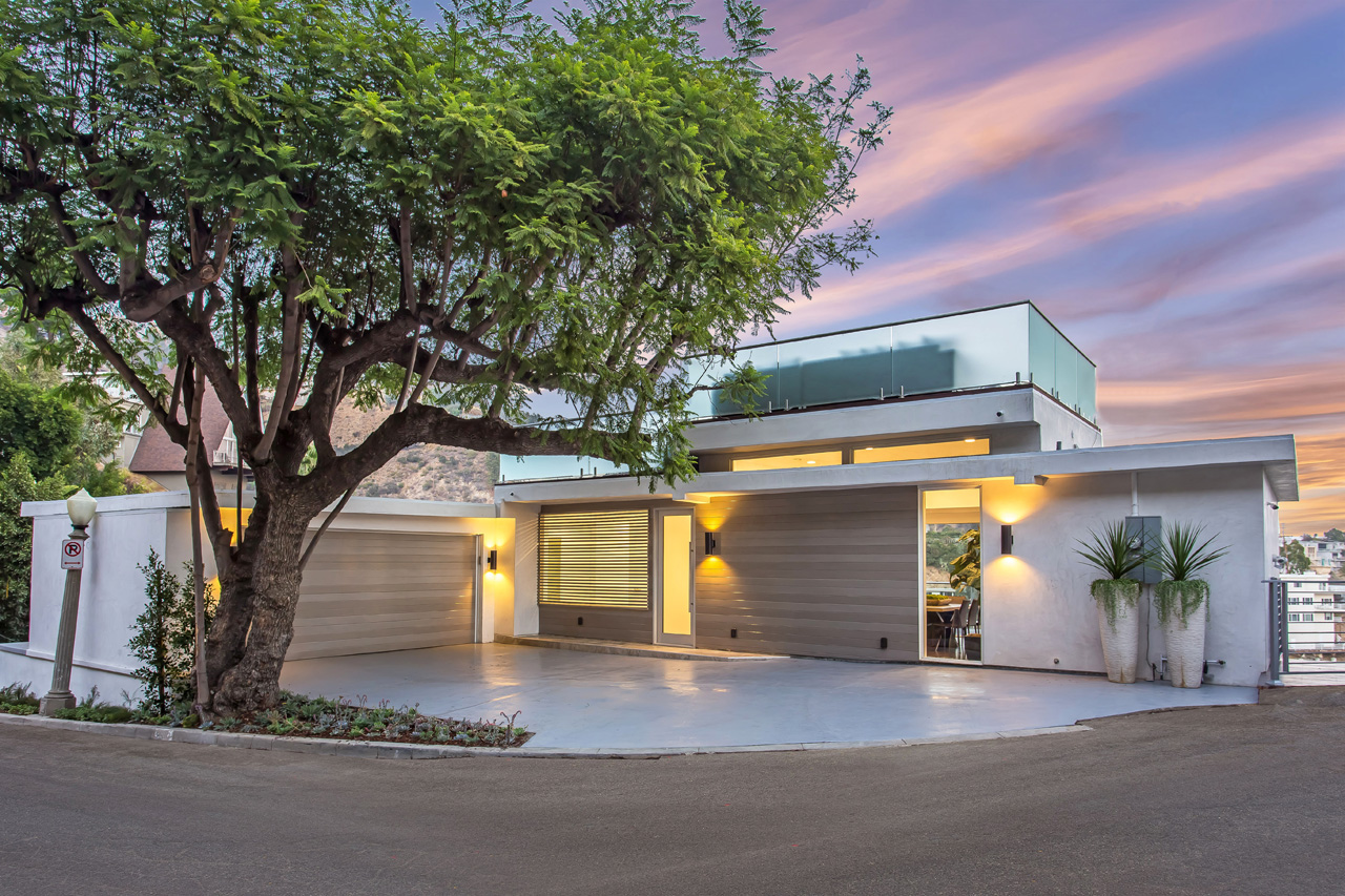 Privately set above the Sunset Strip with sweeping views of Downtown and the city lights, this completely renovated contemporary home boasts refined finishes and tasteful design. An open floor plan with high ceilings allows natural light to pour though the floor-to-ceiling glass doors, and tremendous deck space and a large rooftop deck allow for entertaining and outdoor enjoyment. The large master suite offers an outdoor patio and private spa, with a large bathroom and a finely finished walk-in closet. Every en-suite bedroom enjoys panoramic views. Four-car parking with additional street availability and quietly located on a cul-de-sac street.