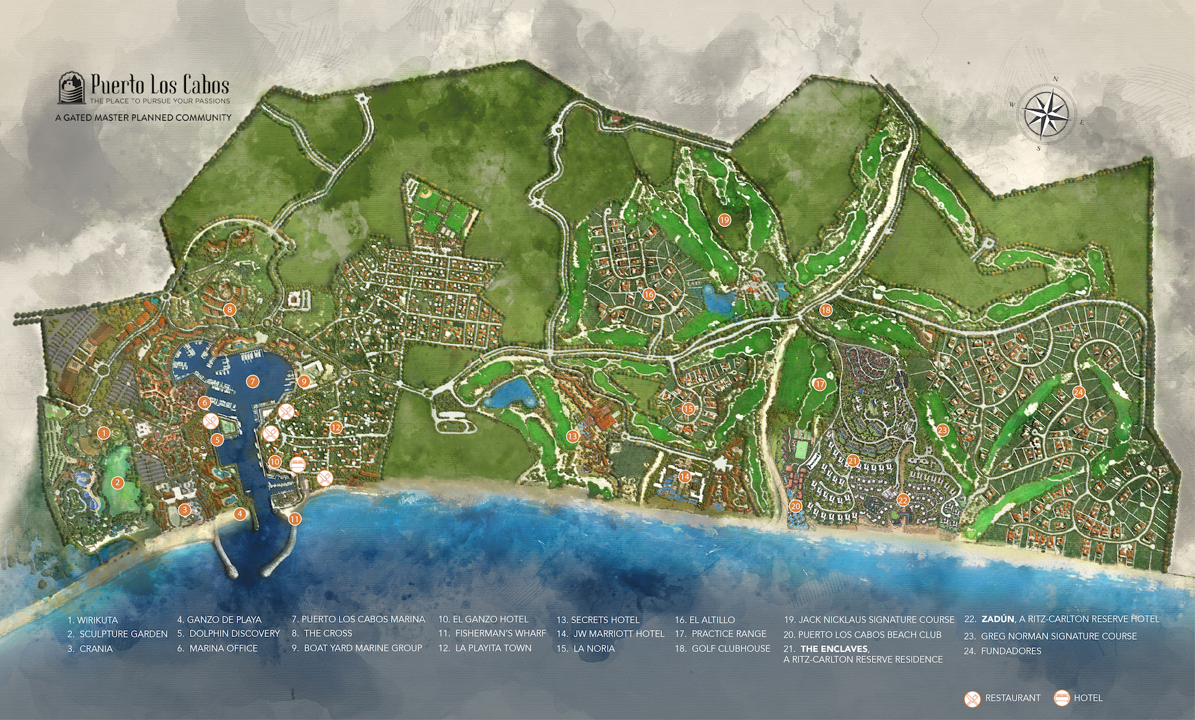 Located on a pristine stretch of coastline along the Sea of Cortez, just east of the San Jose del Cabo estuary, Puerto Los Cabos is a 2,000 acre, master-planned, mixed-use resort community. The community encompasses gated residential neighborhoods, hotels, golf courses, a world-class marina with upcoming Marina Village, botanical and sculptural gardens, and the Puerto Los Cabos Club. The Club provides full service access for all homeowners with a complete suite of anticipatory service and unparalleled amenities.